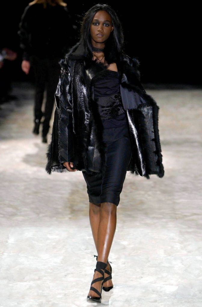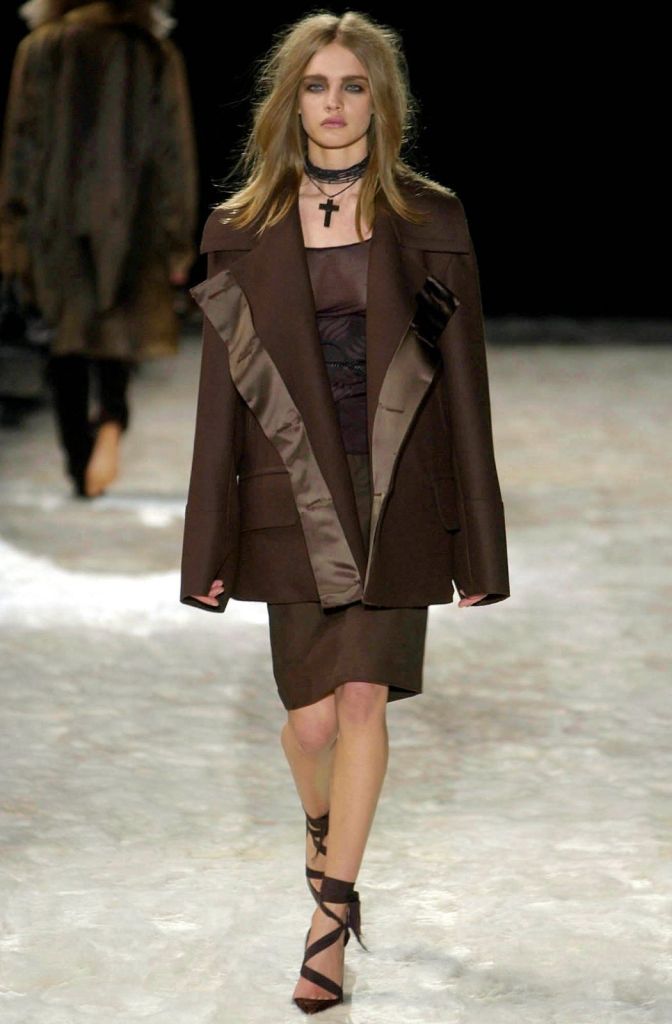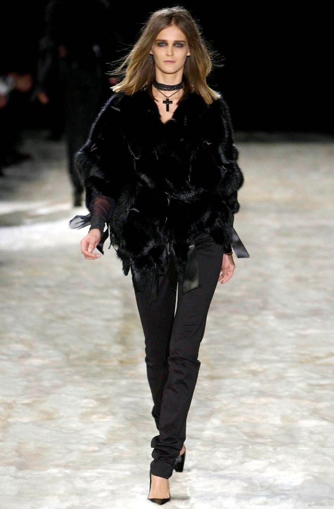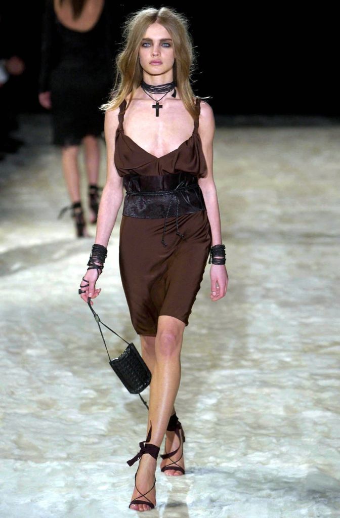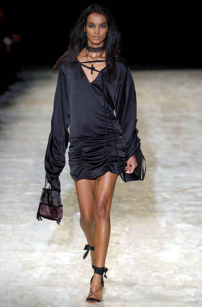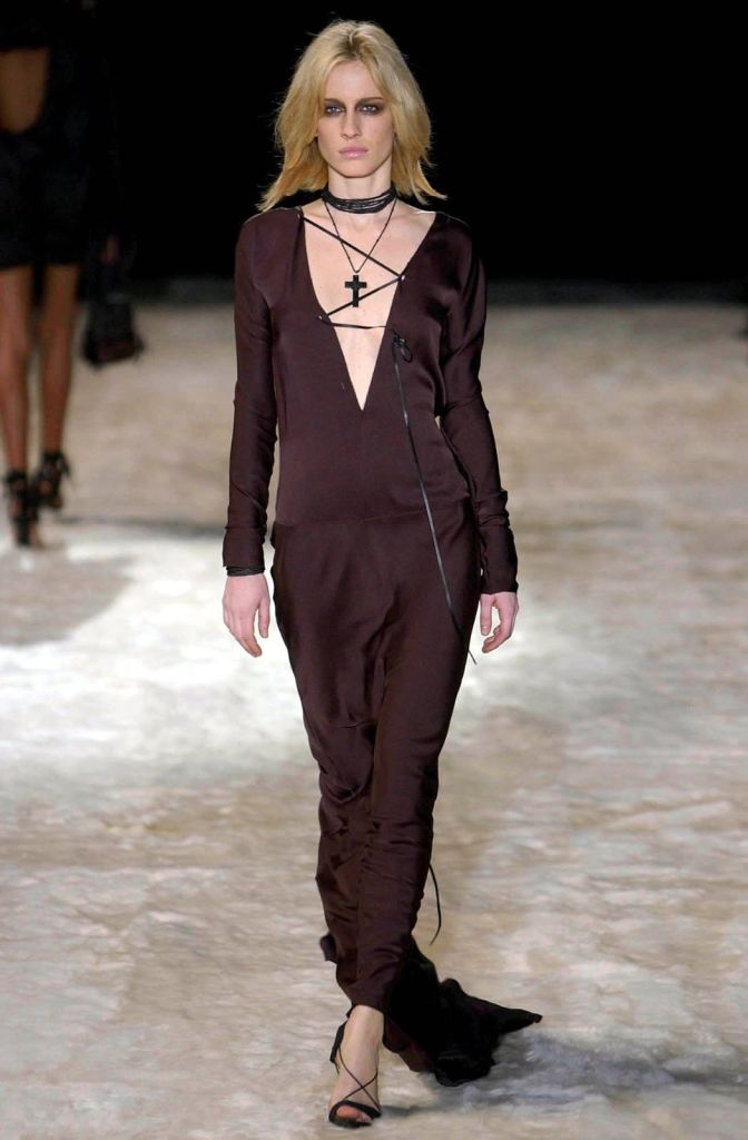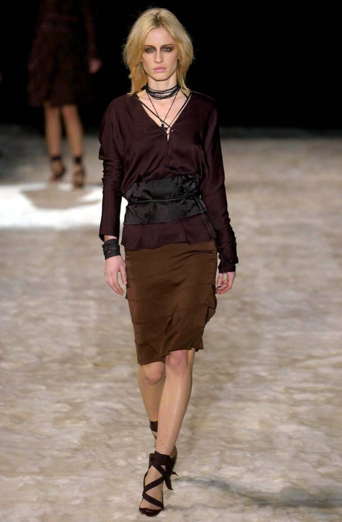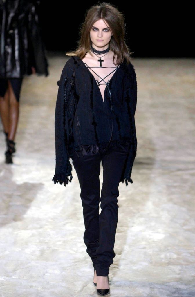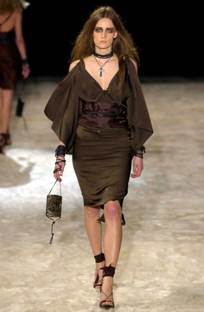 This collection is an exploration of all-black ensembles, exuding a potent blend of dark rock and roll and gothic energy. The collection offers a range of ultra-glam clothes, perfect for those who want to make a striking fashion statement. What stands out is the clever styling, which seamlessly combines various luxe textures, creating an intriguing visual depth. From leather to satin, each piece feels meticulously crafted. Drawing inspiration from vintage Hollywood, Gothic elements, and Japanese kimonos, this collection impresses with intricate detailing. This collection resurrected the fearless rock-chick aesthetic from Tom Ford’s iconic mid-90s era; Love to see it!