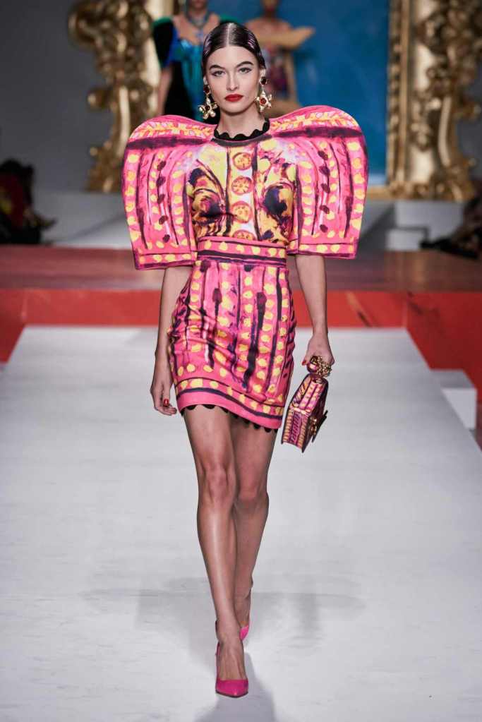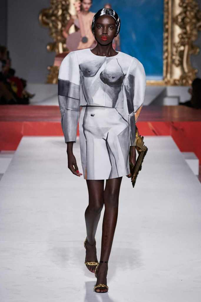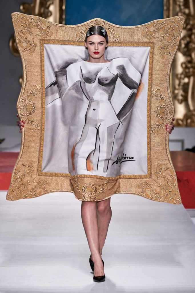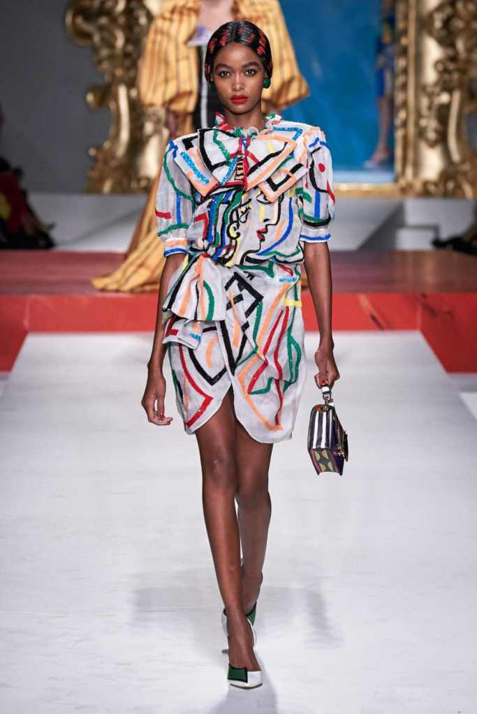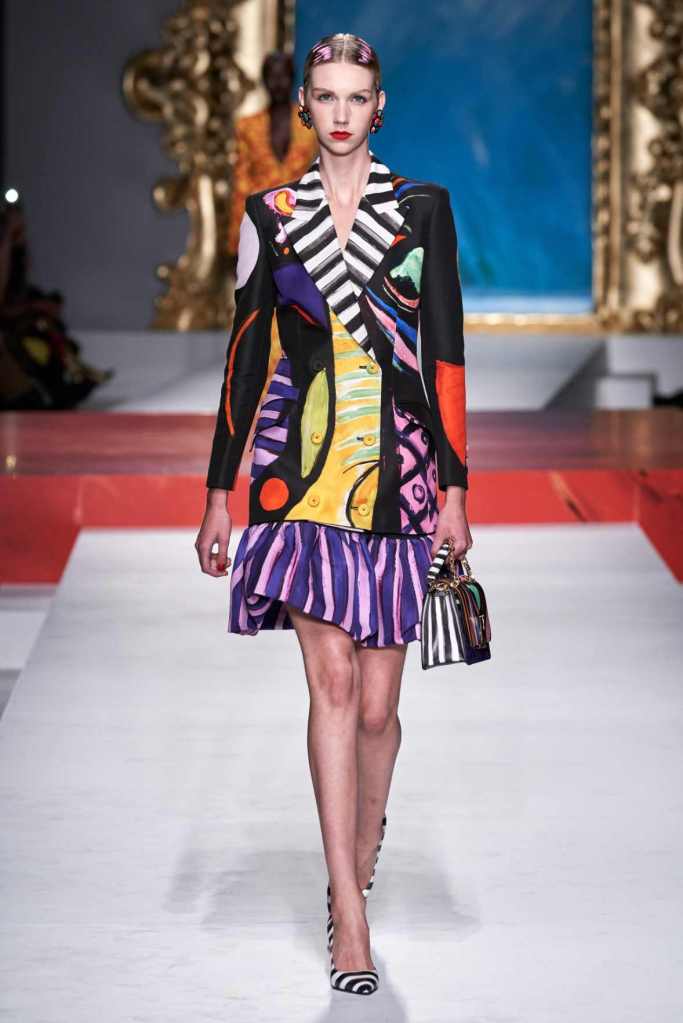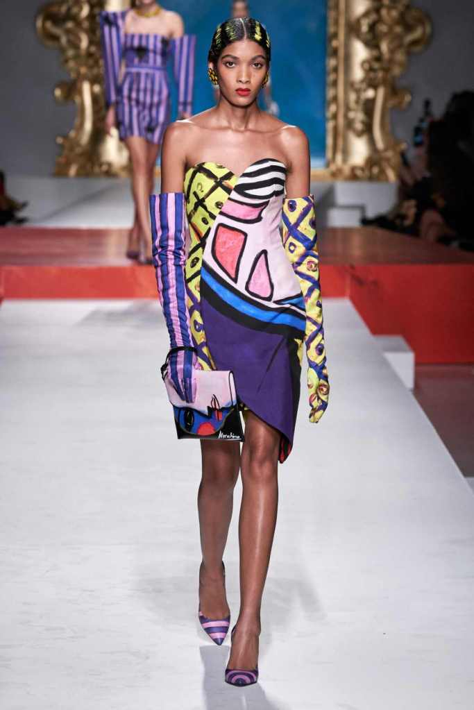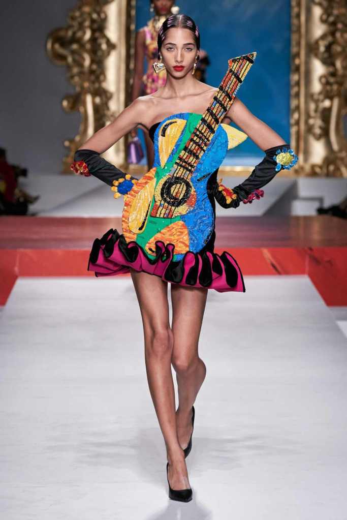 The runway transformed into a living art gallery, showcasing vibrant colors and abstract motifs reminiscent of Picasso’s diverse artistic phases. With Moschino’s bold interpretation, it’s hard to distinguish whether life is imitating art or vice versa, but one thing is certain – these Moschino creations are impossible to ignore.