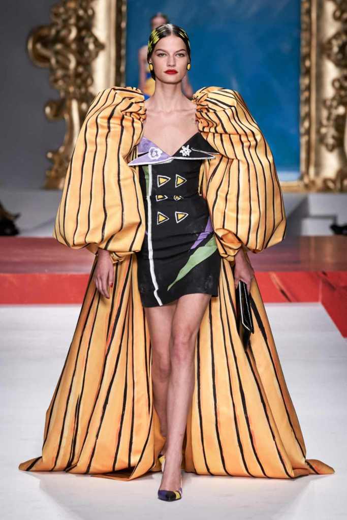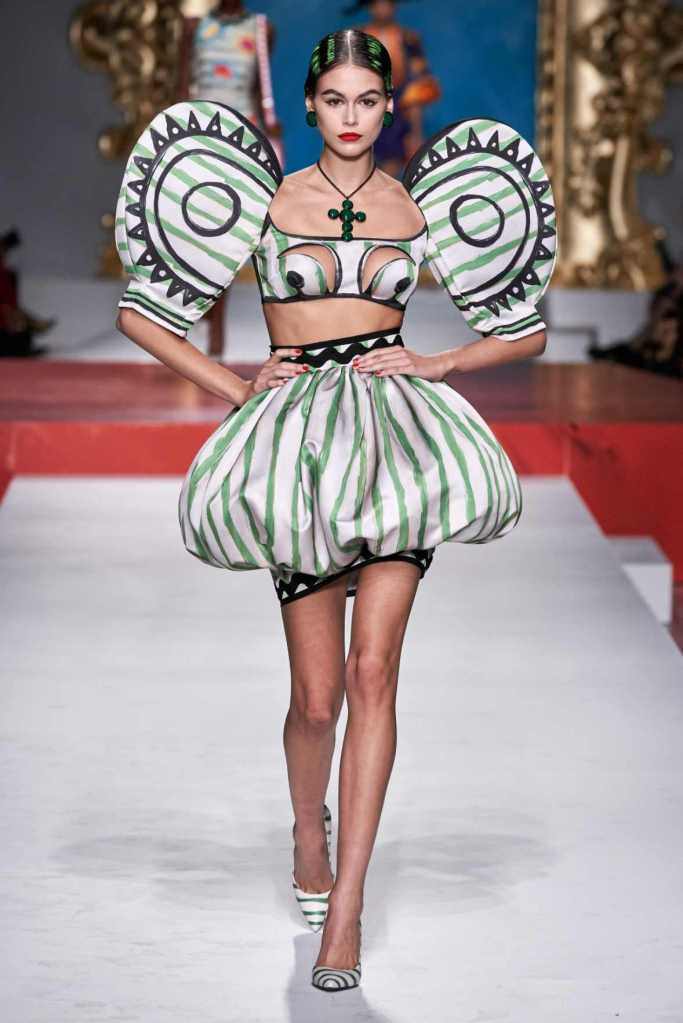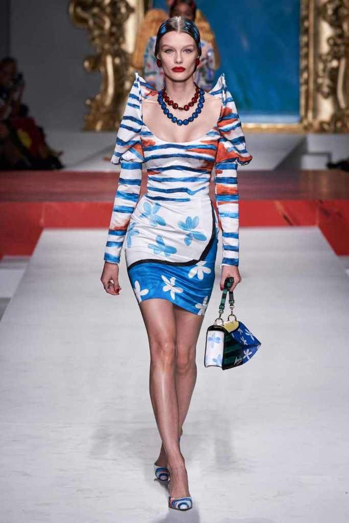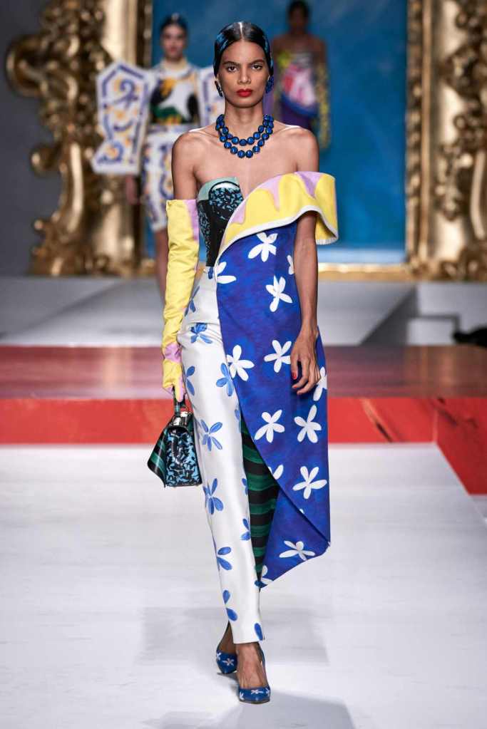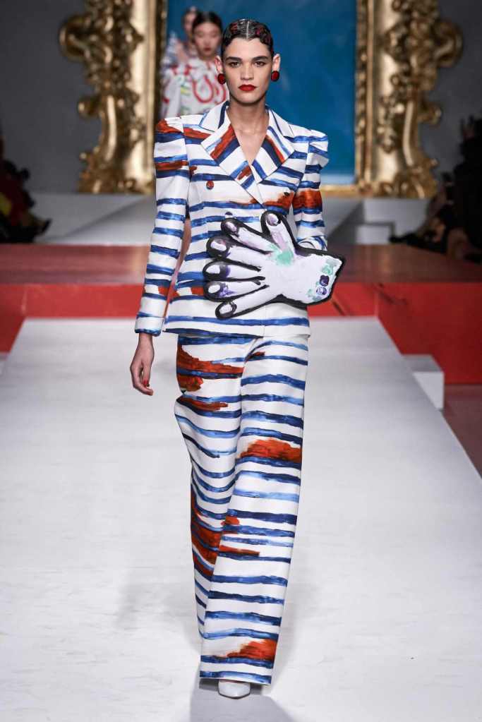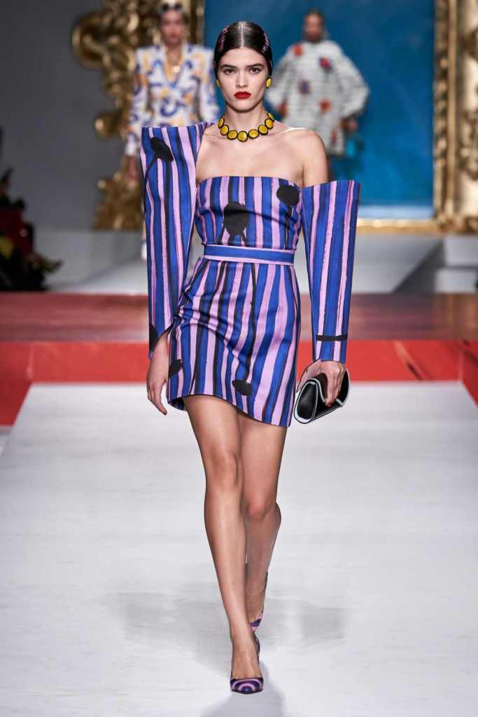 The runway transformed into a living art gallery, showcasing vibrant colors and abstract motifs reminiscent of Picasso’s diverse artistic phases. With Moschino’s bold interpretation, it’s hard to distinguish whether life is imitating art or vice versa, but one thing is certain – these Moschino creations are impossible to ignore.