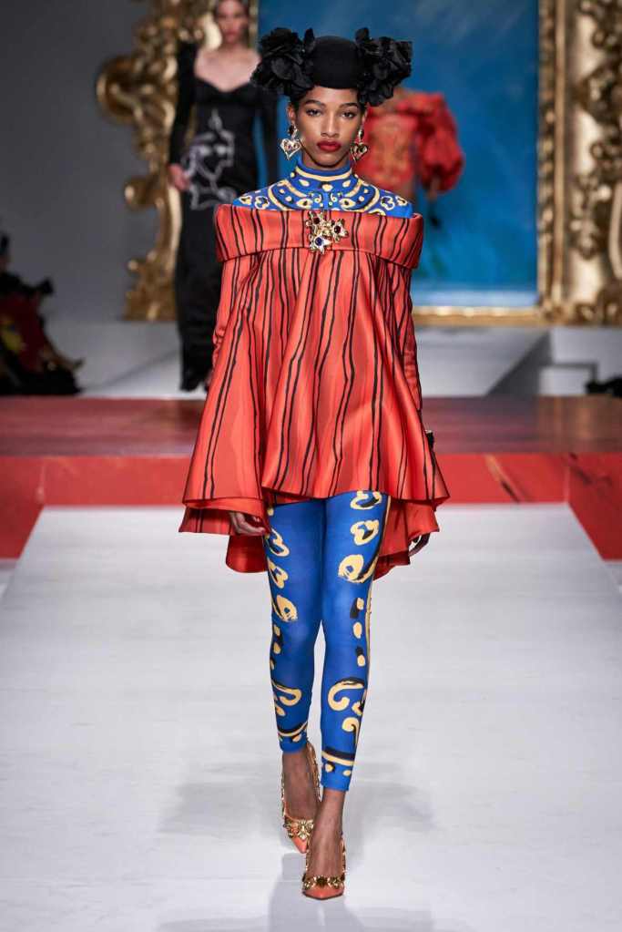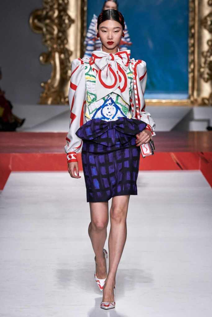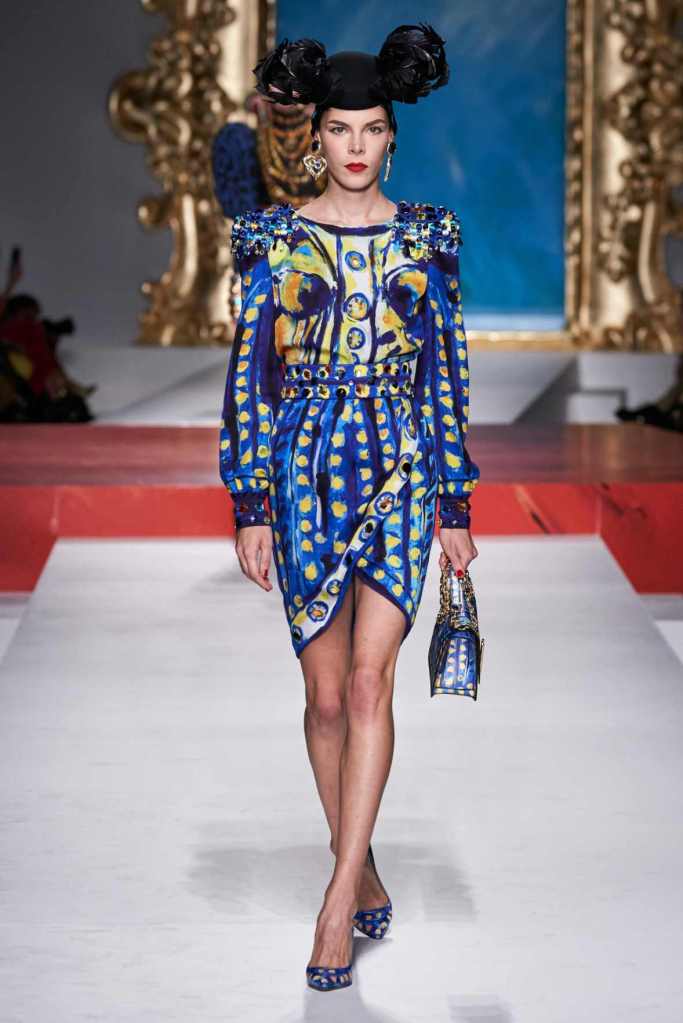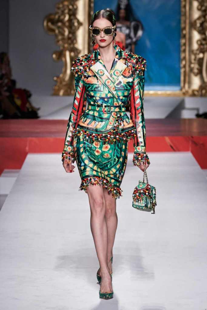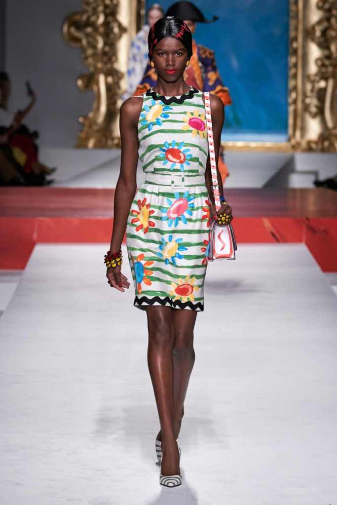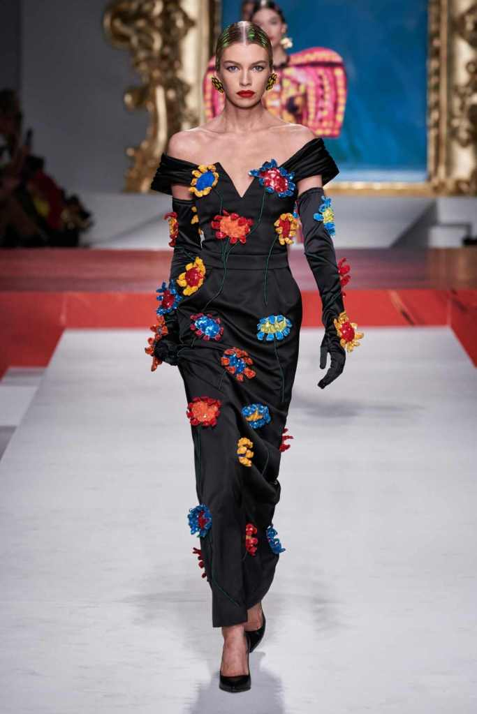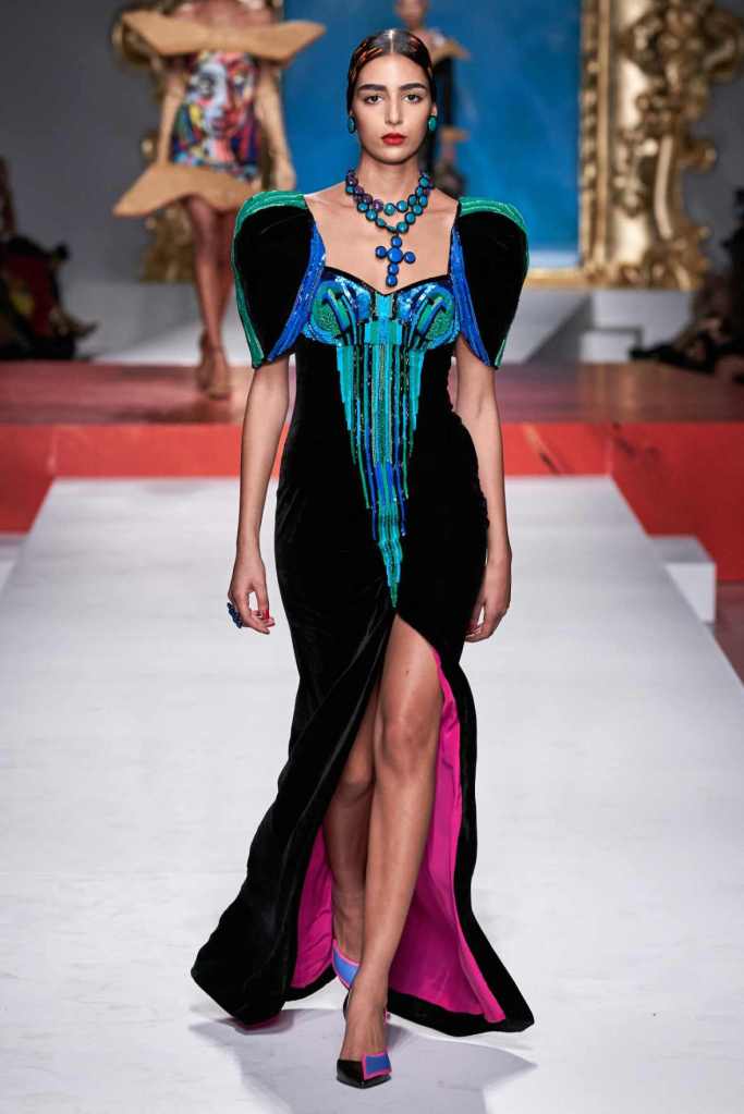 The runway transformed into a living art gallery, showcasing vibrant colors and abstract motifs reminiscent of Picasso’s diverse artistic phases. With Moschino’s bold interpretation, it’s hard to distinguish whether life is imitating art or vice versa, but one thing is certain – these Moschino creations are impossible to ignore.