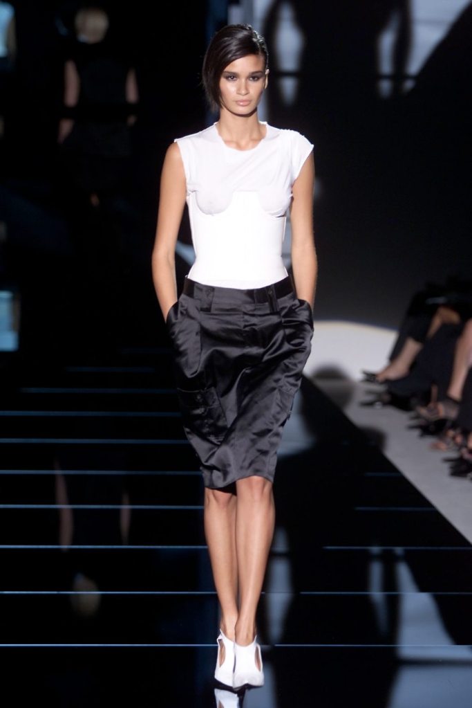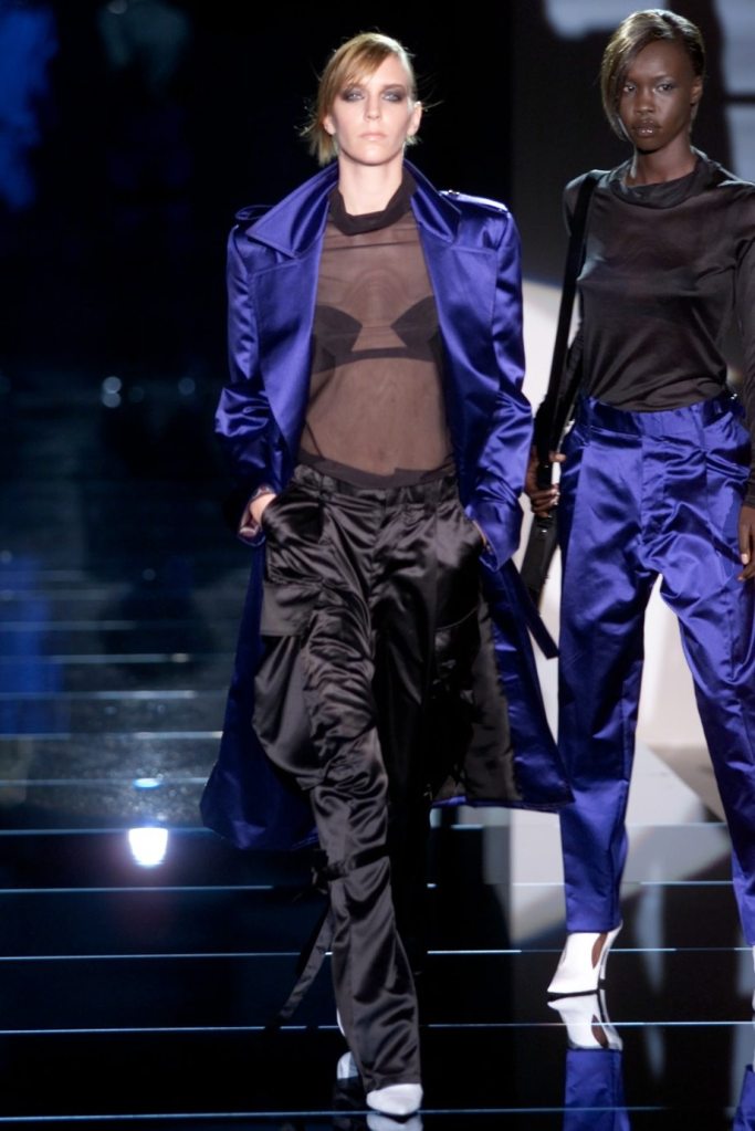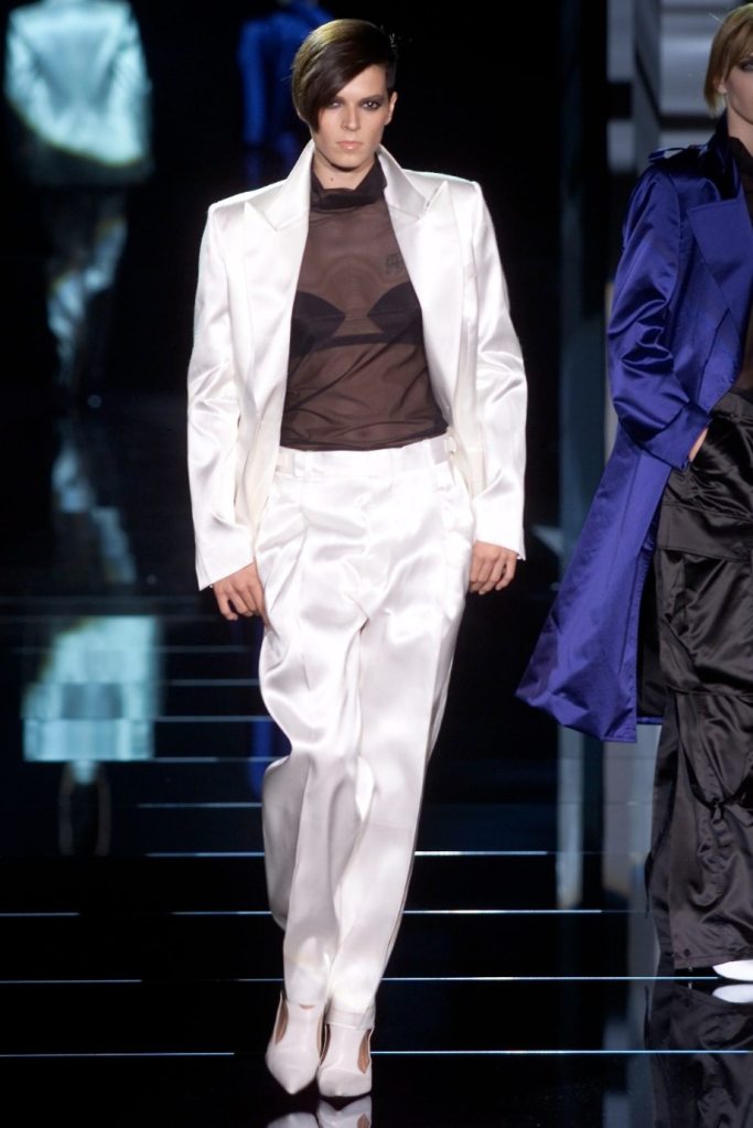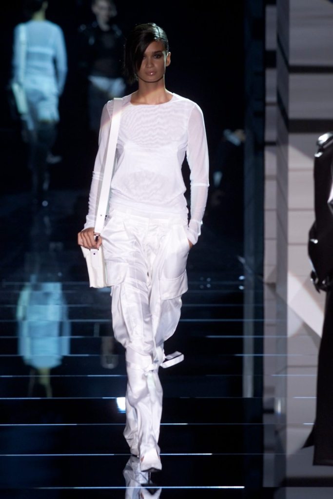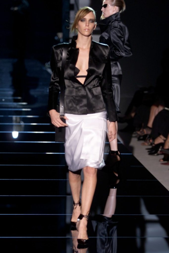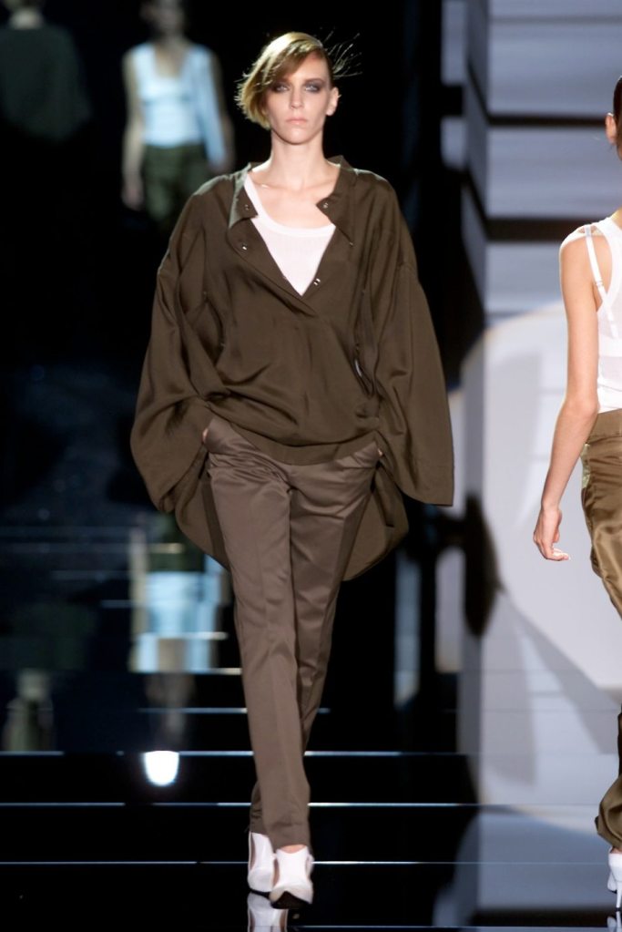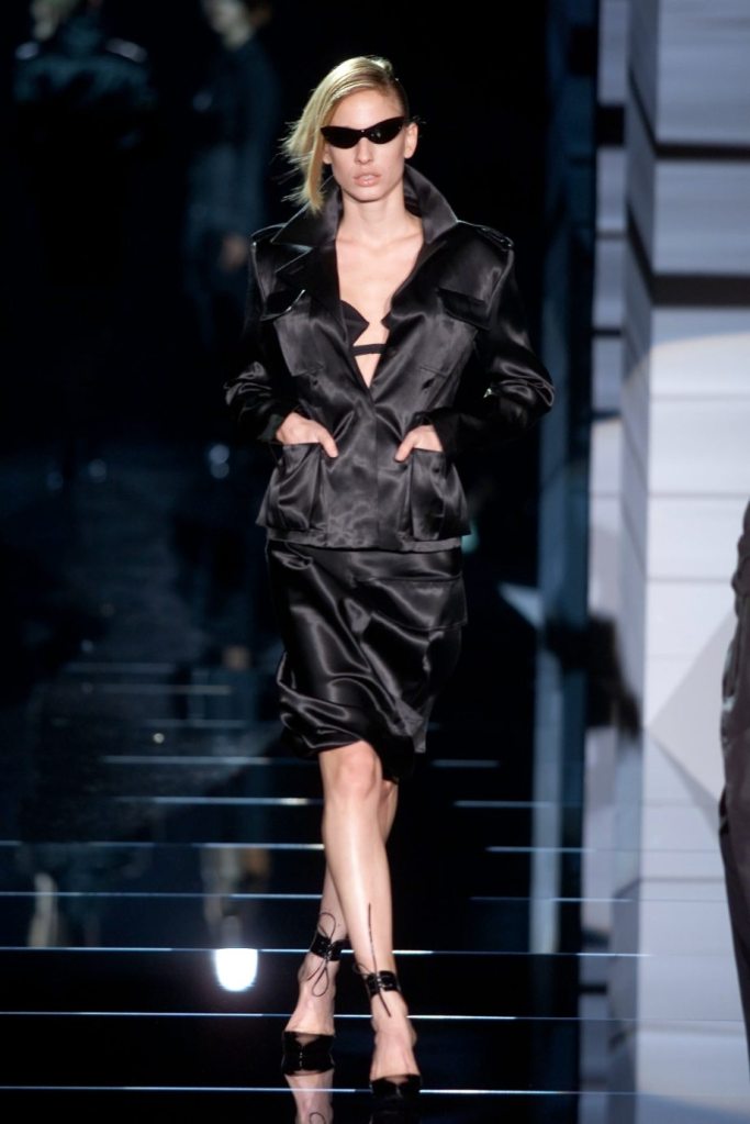 Tom Ford showcased a daring collection for Gucci, featuring dominatrix-inspired looks and sleek outfits. The prominent use of satin throughout the collection adds a touch of gloss and drama. The assortment features barely-there swimsuits, seductive bustier tops, sheer layers, versatile cargo pants, safari jackets, and luxurious satin jumpsuits and lowers. The collection’s styling appeared somewhat chaotic which detracted from the otherwise racy pieces. Despite this minor drawback, Gucci delivers a collection that balances sensuality with practicality, making it a noteworthy addition to the Tom Ford era.
