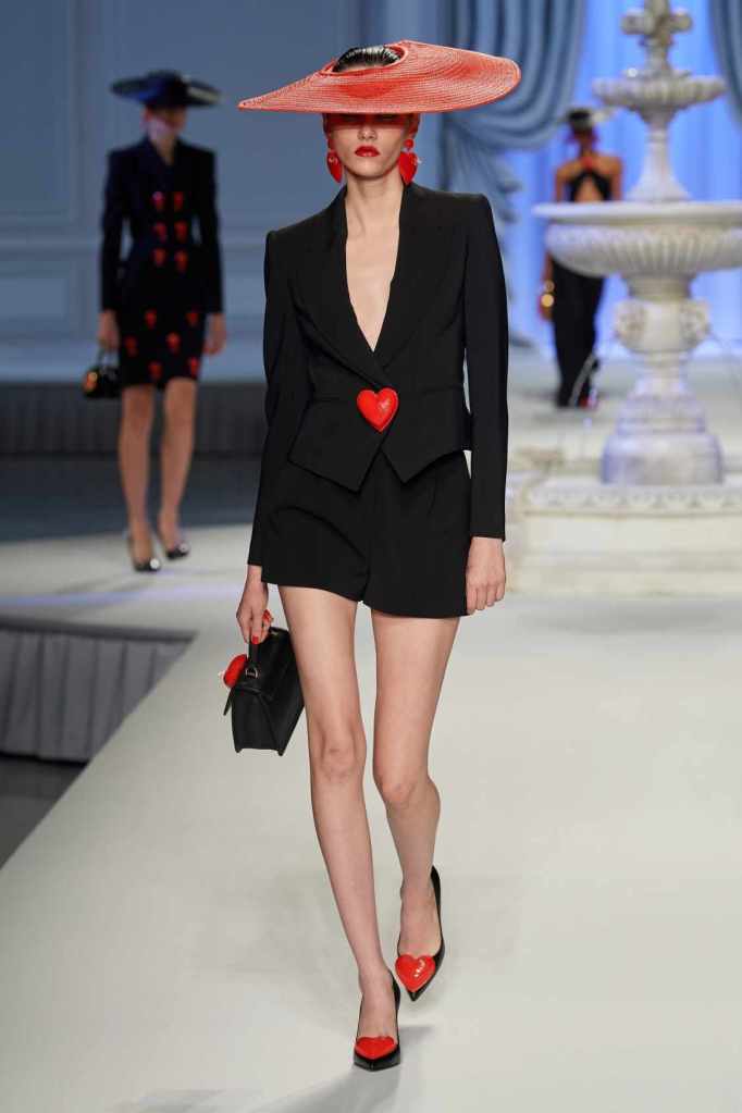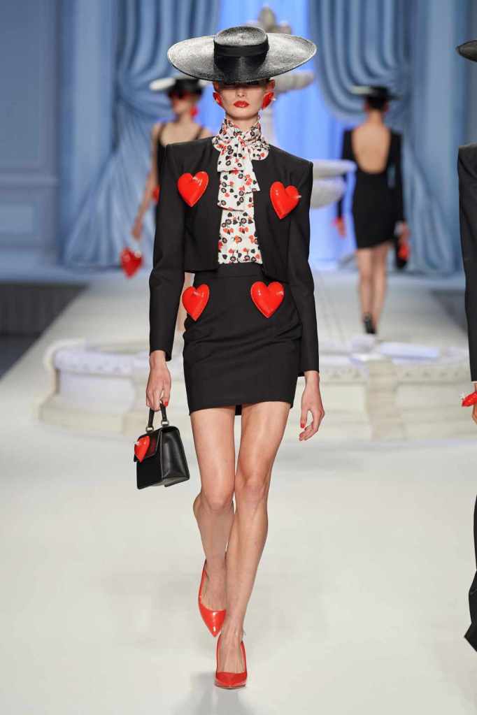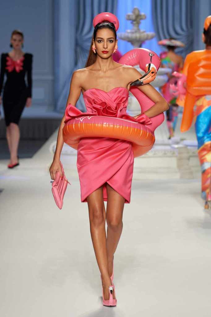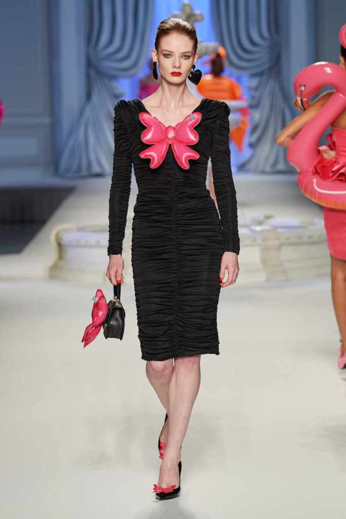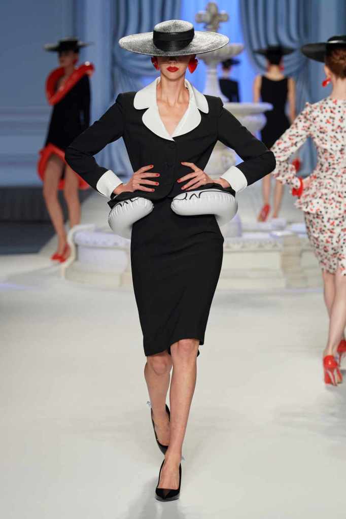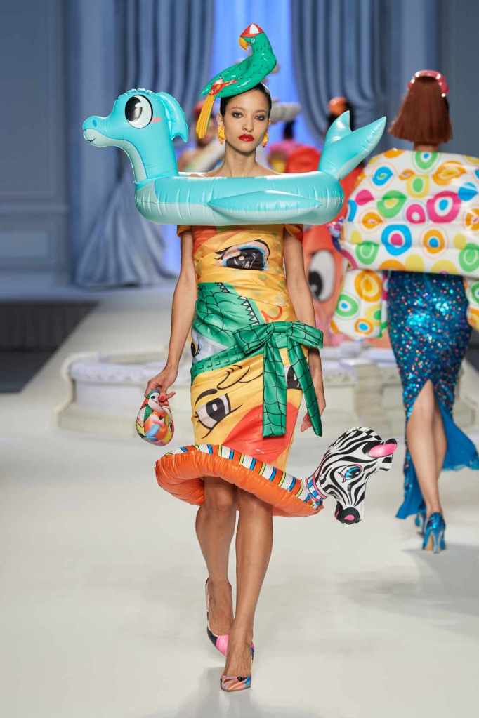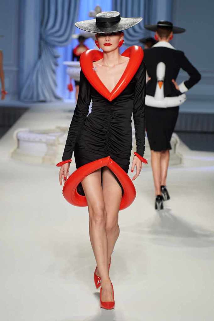 From cocktail dresses with flotation devices to inflatable lapels on noir suits, the collection marries fashion with humor. In a frenzy of colors and extravaganza, the looks that surprisingly stood out were some simple black tailored pieces decorated with bright red hearts. A lot of 80s silhouettes, nautical references and dramatic inflatable eveningwear. Each piece is layered with thoughtful humor – something Scott excels at. The charm of Moschino lies in its excess and this collection was excessively fun!