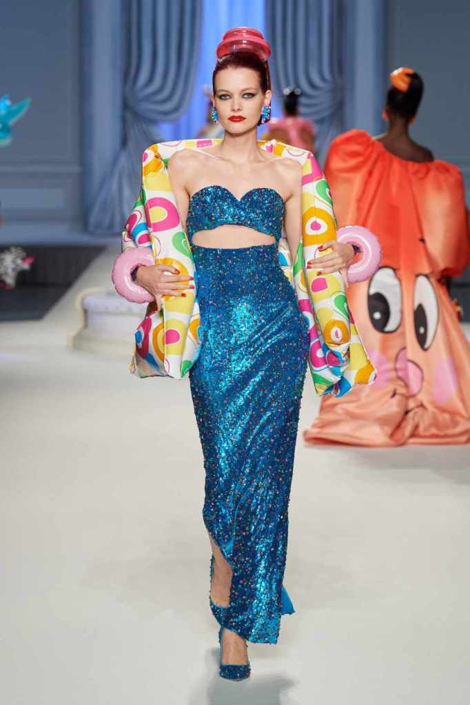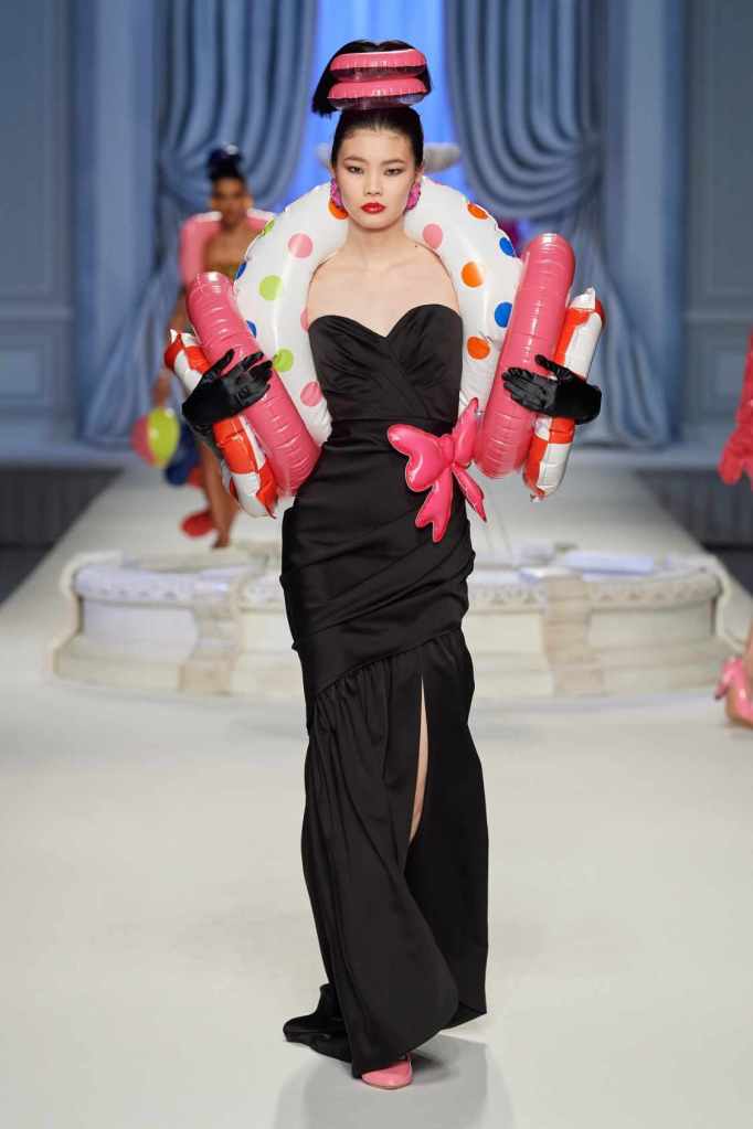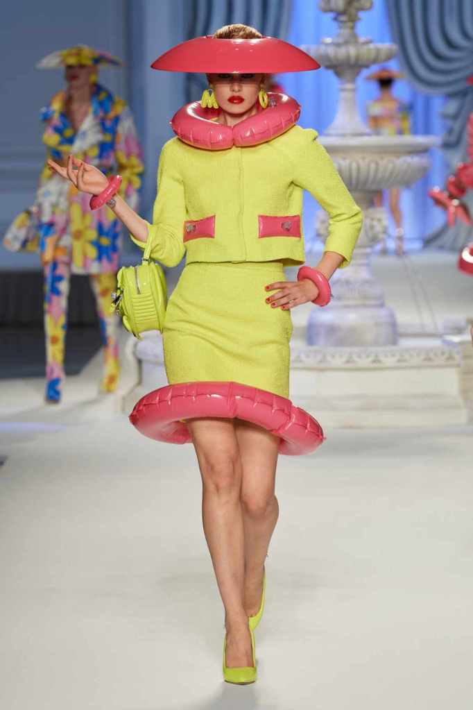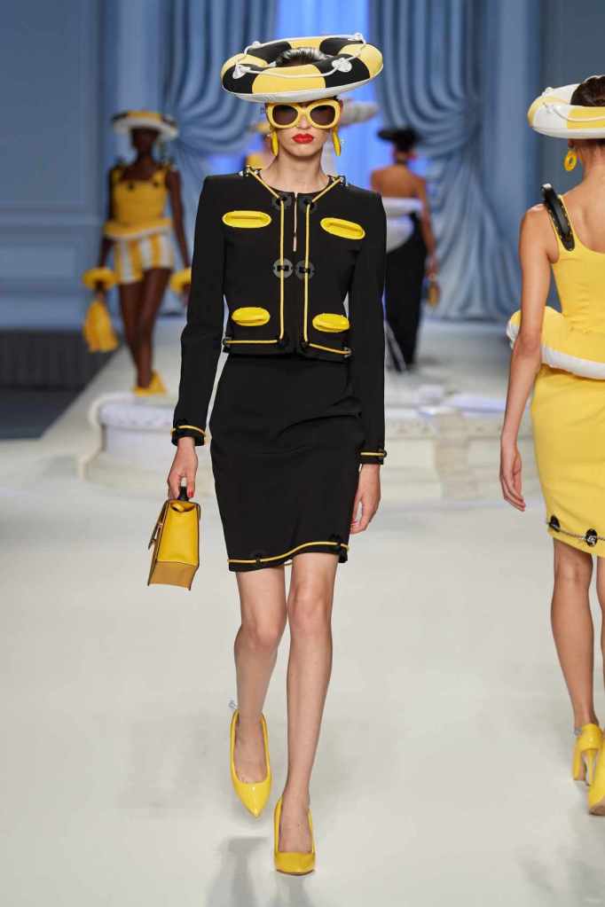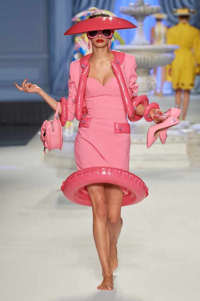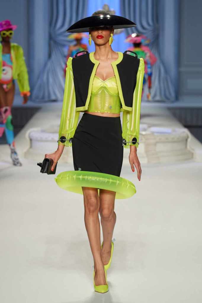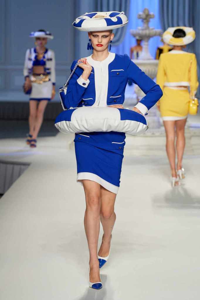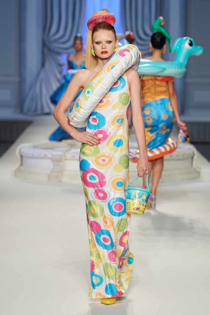 This collection was just Moschino being Moschino! There was some colorful inflatable high fashion and I’m very much here for it- Nearly every outfit featured inflatable details. The idea for inflatable fashion came to Jeremy Scott because of the rising costs and inflation rates around the world. I mean that’s just brilliant! The collection showcases symbolic uplift through garments like sporty dresses, boxy jackets, and skirts adorned with faux blow-up hearts, pool toys and life preservers. This playful approach harks back to the brand’s founder, Franco Moschino, who once created a life jacket-inspired piece.