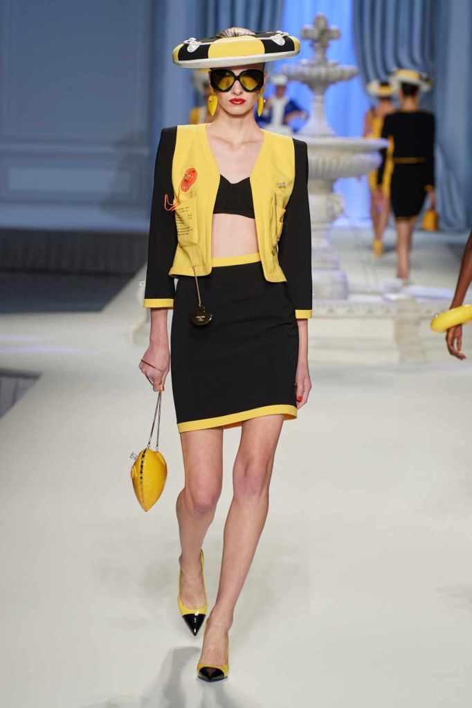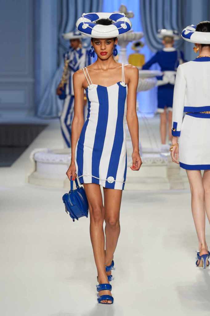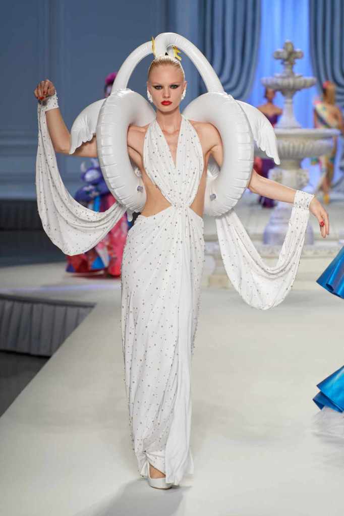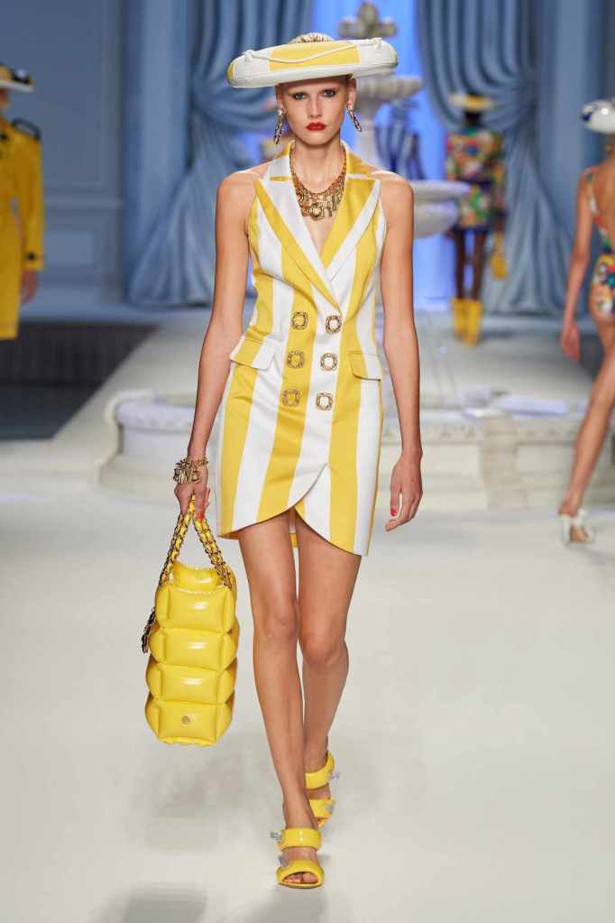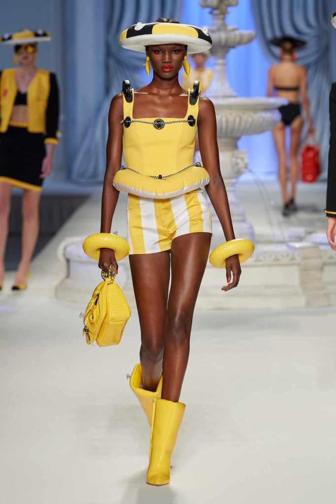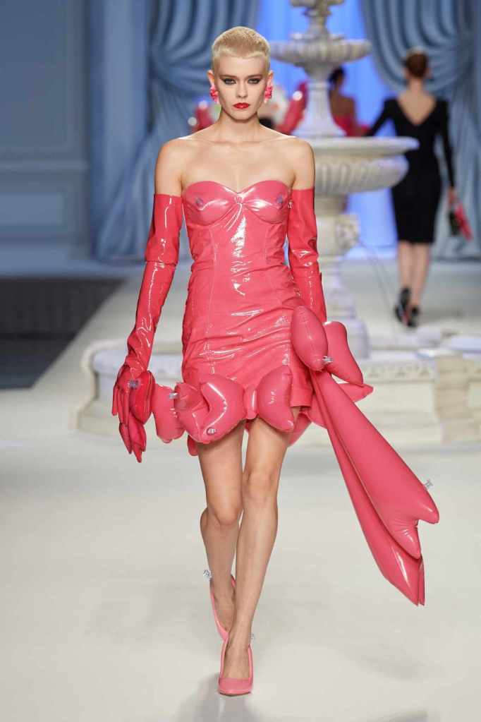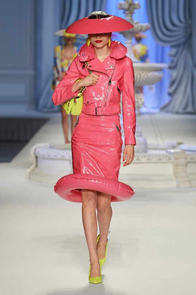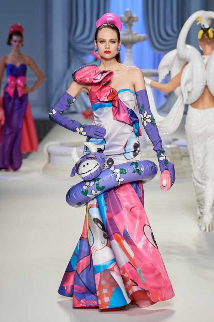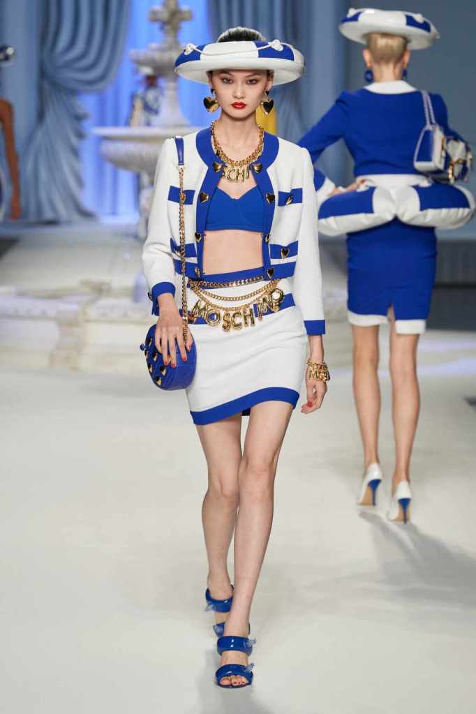 This collection was just Moschino being Moschino! There was some colorful inflatable high fashion and I’m very much here for it- Nearly every outfit featured inflatable details. The idea for inflatable fashion came to Jeremy Scott because of the rising costs and inflation rates around the world. I mean that’s just brilliant! The collection showcases symbolic uplift through garments like sporty dresses, boxy jackets, and skirts adorned with faux blow-up hearts, pool toys and life preservers. This playful approach harks back to the brand’s founder, Franco Moschino, who once created a life jacket-inspired piece.