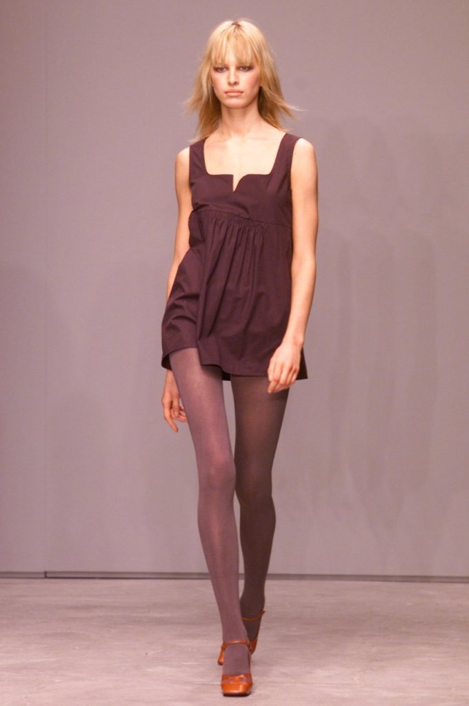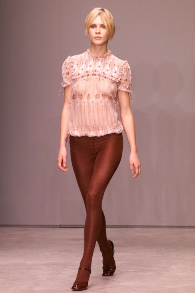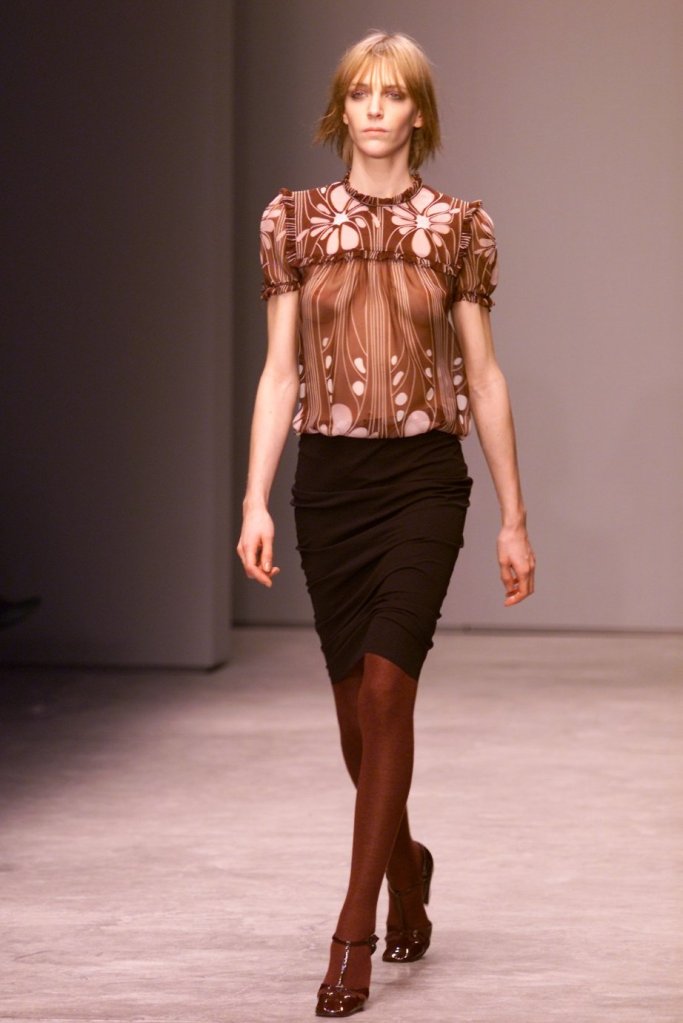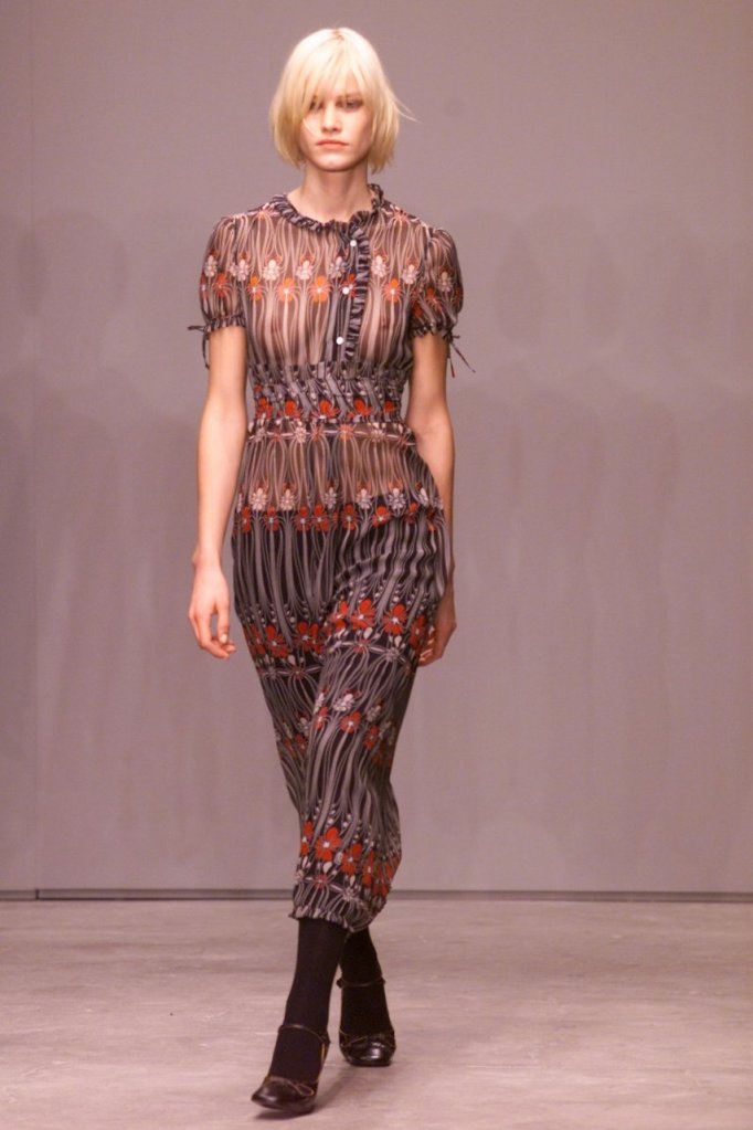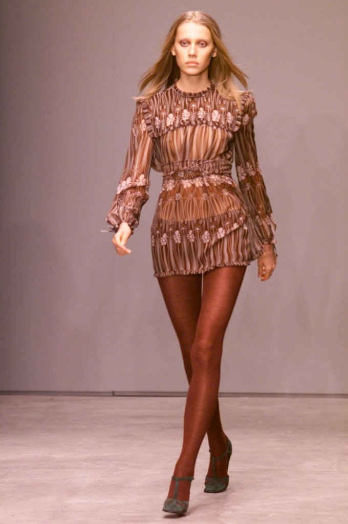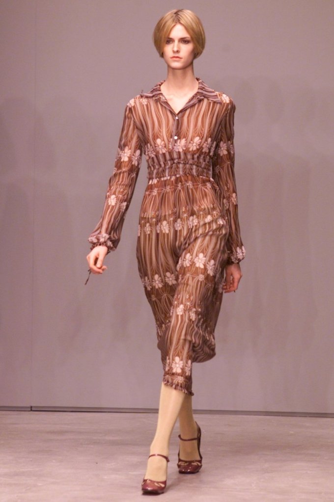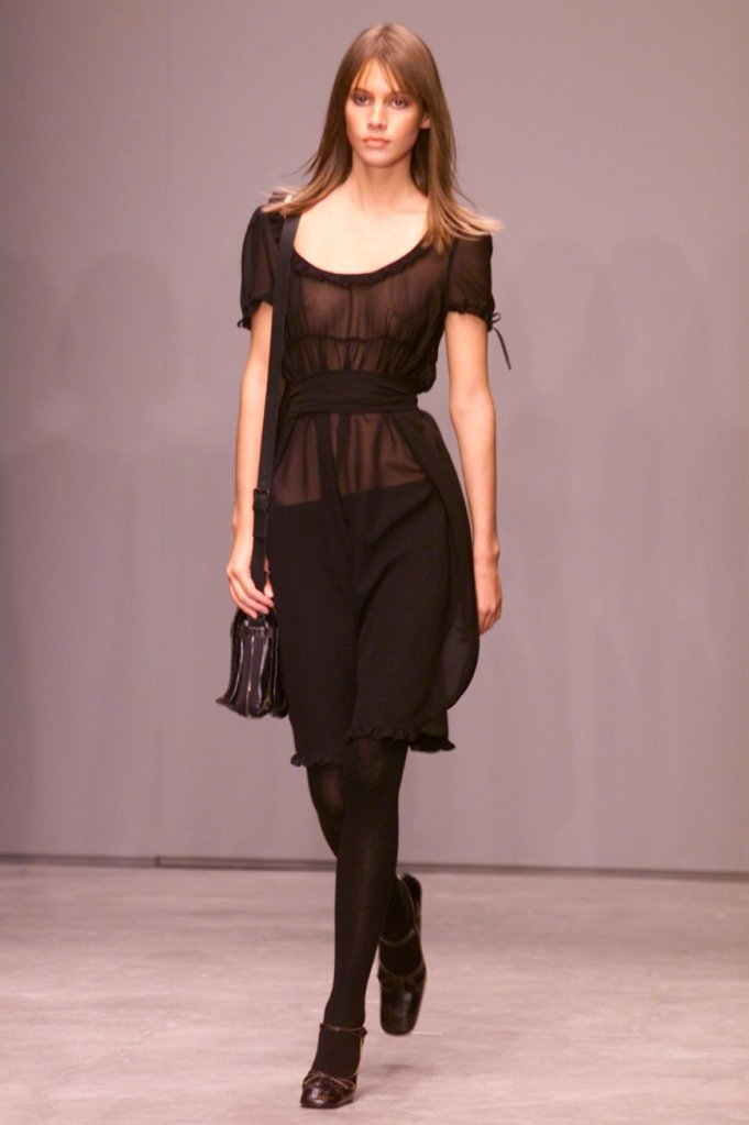 Towards the finale, the collection exploded into a riot of sheer, colorful dresses that radiated exuberance – with a touch of ’70s thrift shop charm. What makes this collection truly exceptional is its enduring appeal. Even over two decades later, these pieces remain incredibly cool and wearable. It’s a journey through fashion history, reminding us of Miu Miu’s knack for effortlessly blending retro and contemporary influences.