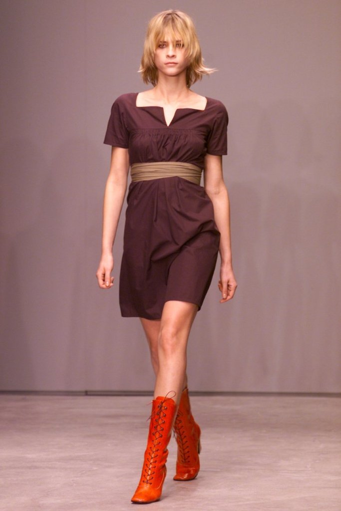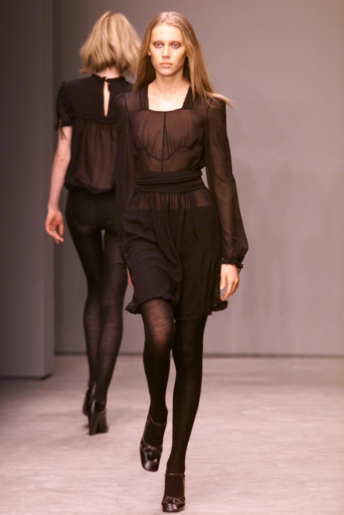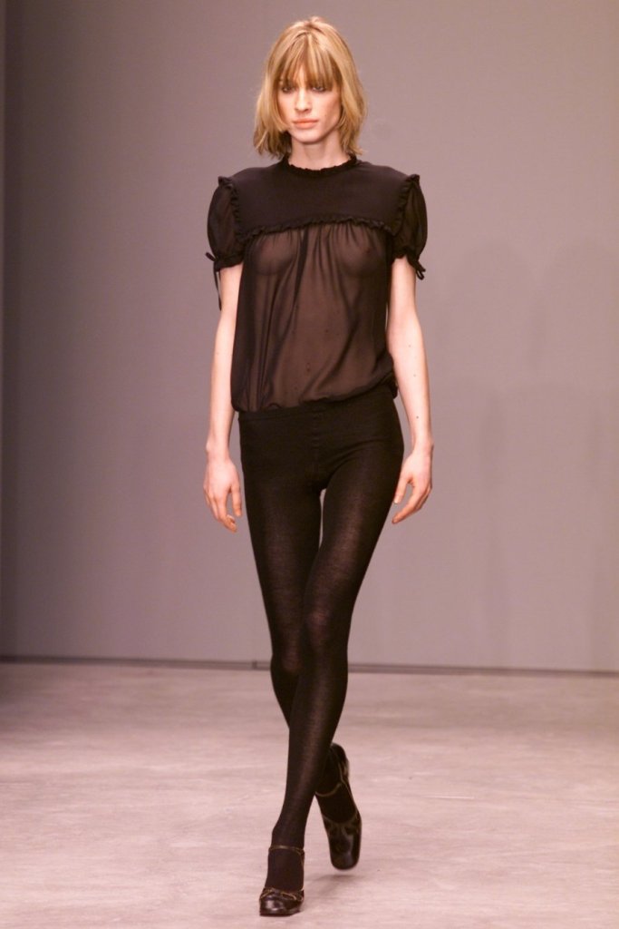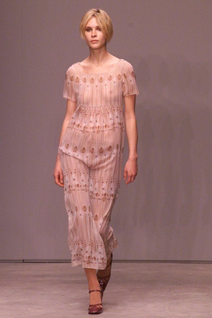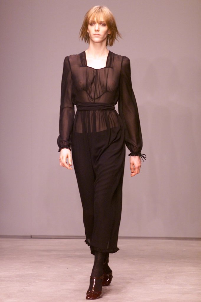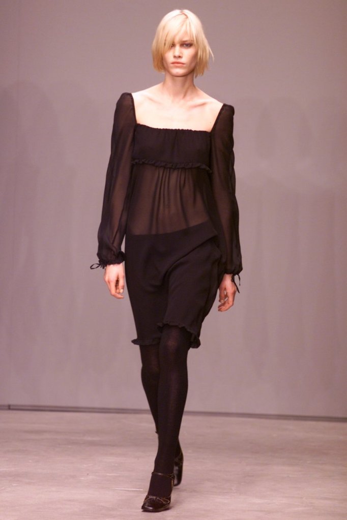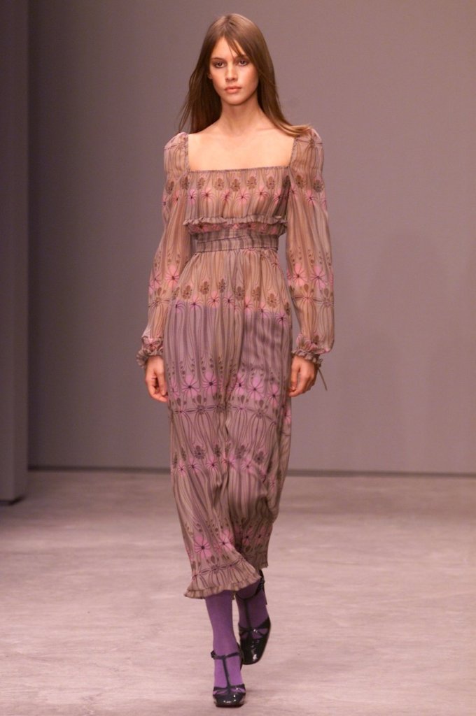 Towards the finale, the collection exploded into a riot of sheer, colorful dresses that radiated exuberance – with a touch of ’70s thrift shop charm. What makes this collection truly exceptional is its enduring appeal. Even over two decades later, these pieces remain incredibly cool and wearable. It’s a journey through fashion history, reminding us of Miu Miu’s knack for effortlessly blending retro and contemporary influences.