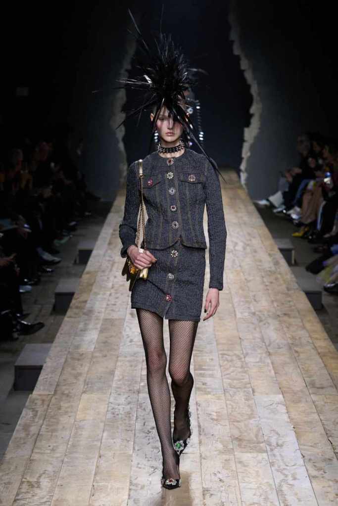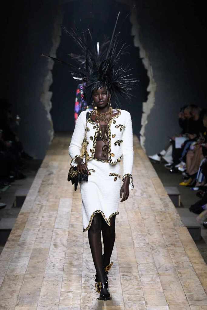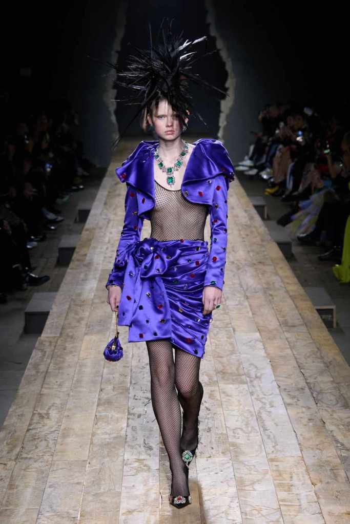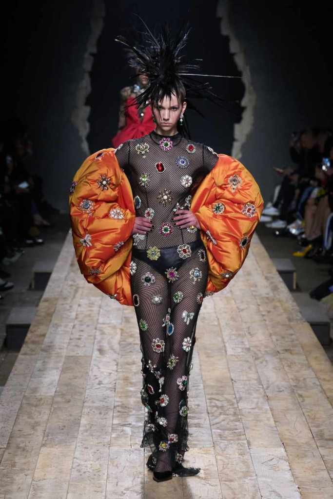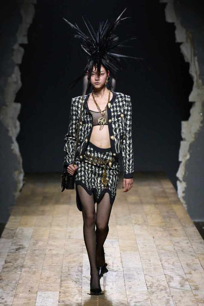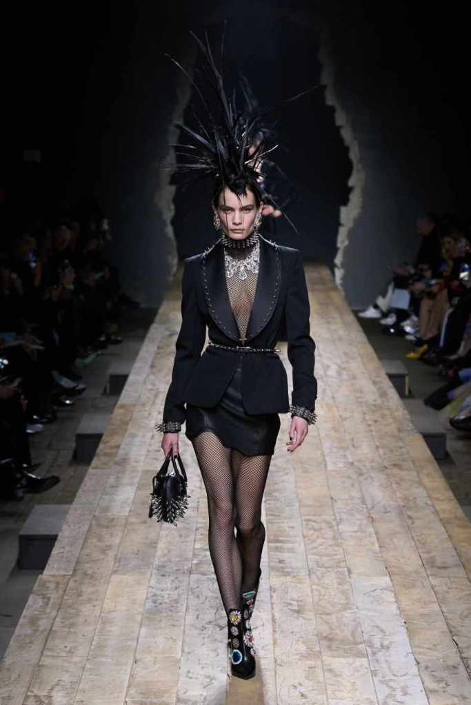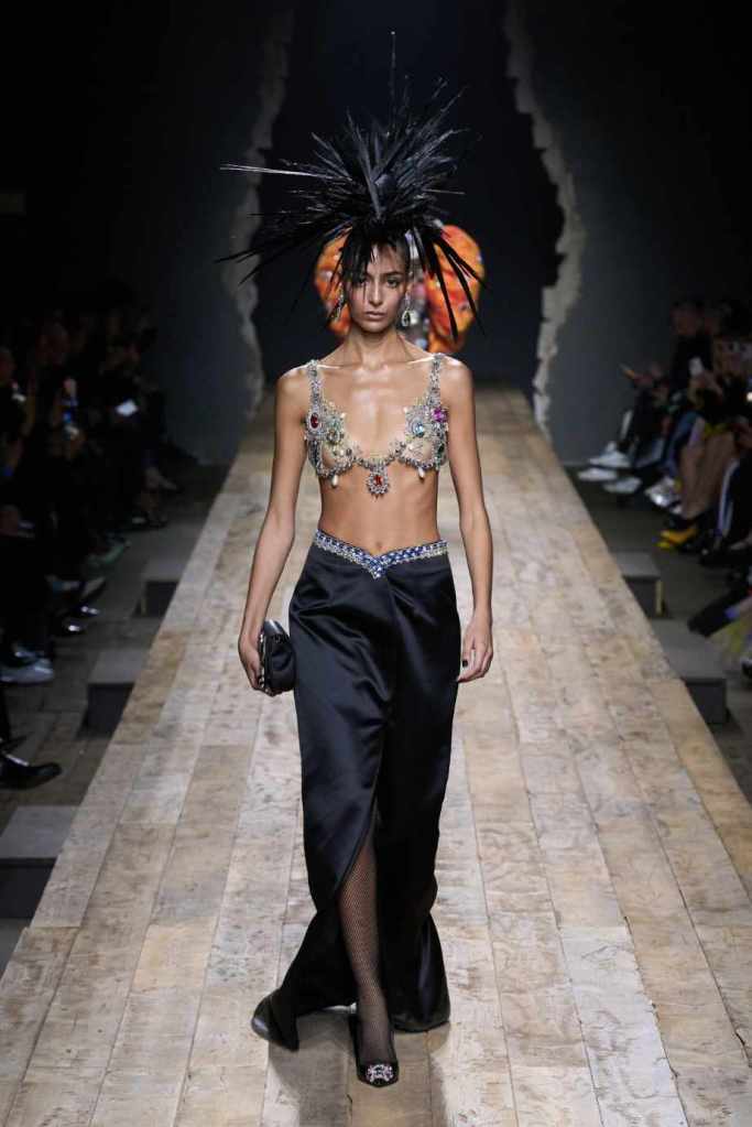 Who knew this was Jeremy Scott’s last collection for Moschino, unfortunately, it was one of his not-so-good ones. I won’t be over Scott leaving Moschino for a long time and for the sake of this past brilliant work, I’ll try not to shit too much on this collection. Salvador Dali’s ‘The Persistence of Memory’ served as the initial reference point for this collection. There were obviously heavy Punk references and the Moschino version of a punk princess. This representation of today’s distorted times was present in droopy skirtsuits and jewelry. Heavy costume jewelry, biker jackets, elaborate mohawk headpieces, embellished tailored skirt suits, satin decorated extravagant gowns. The excess in this collection was on brand and adds much-needed drama. It showcases a rebellious direction with a touch of surrealism and nonconforming aristocracy. The points he tried to make didn’t exactly land but it featured some enjoyable clothes. While it’s far from the iconic pieces Scott has created but is a decent closure to his Moschino chapter.