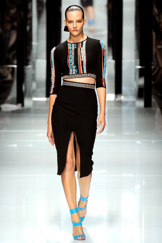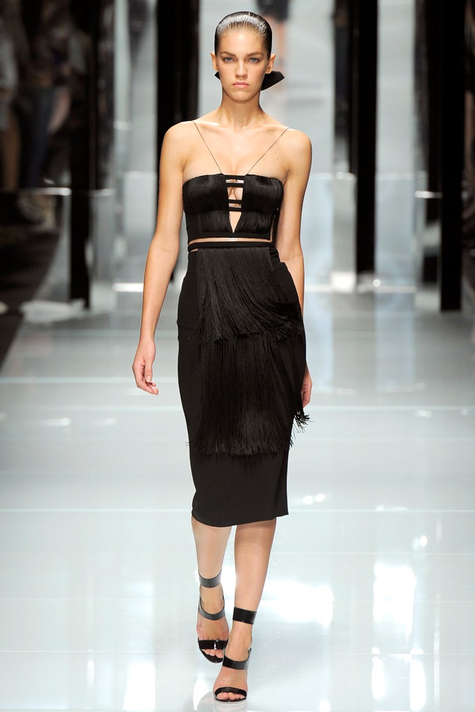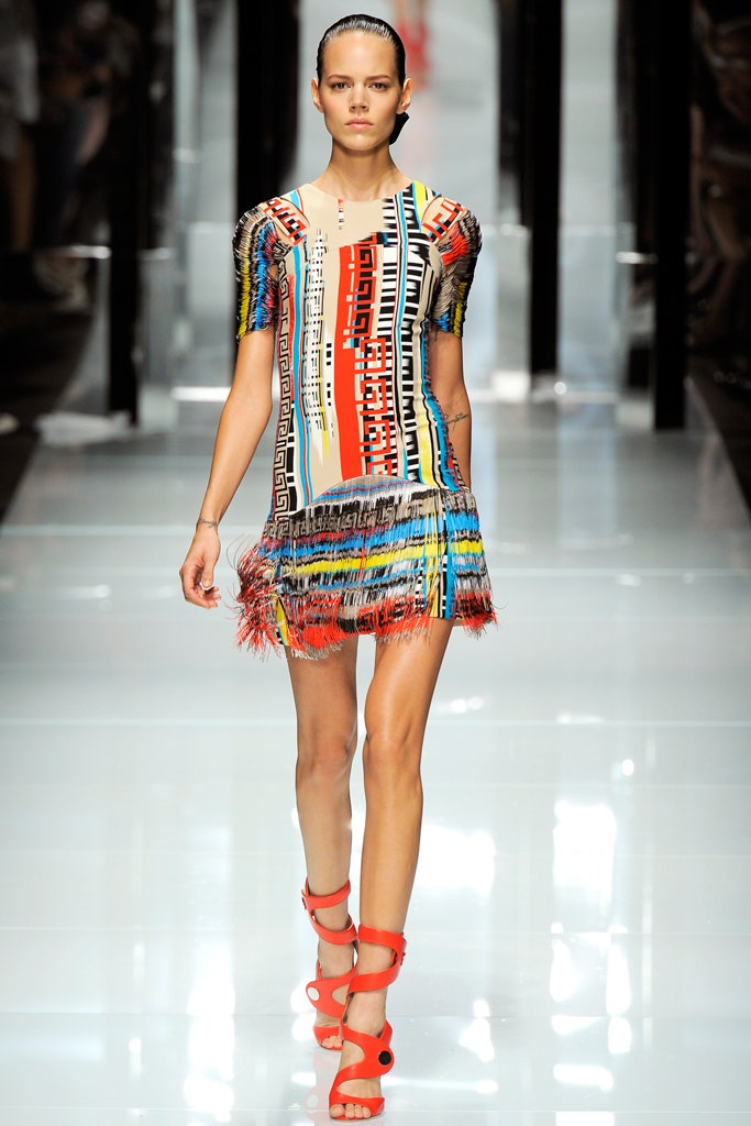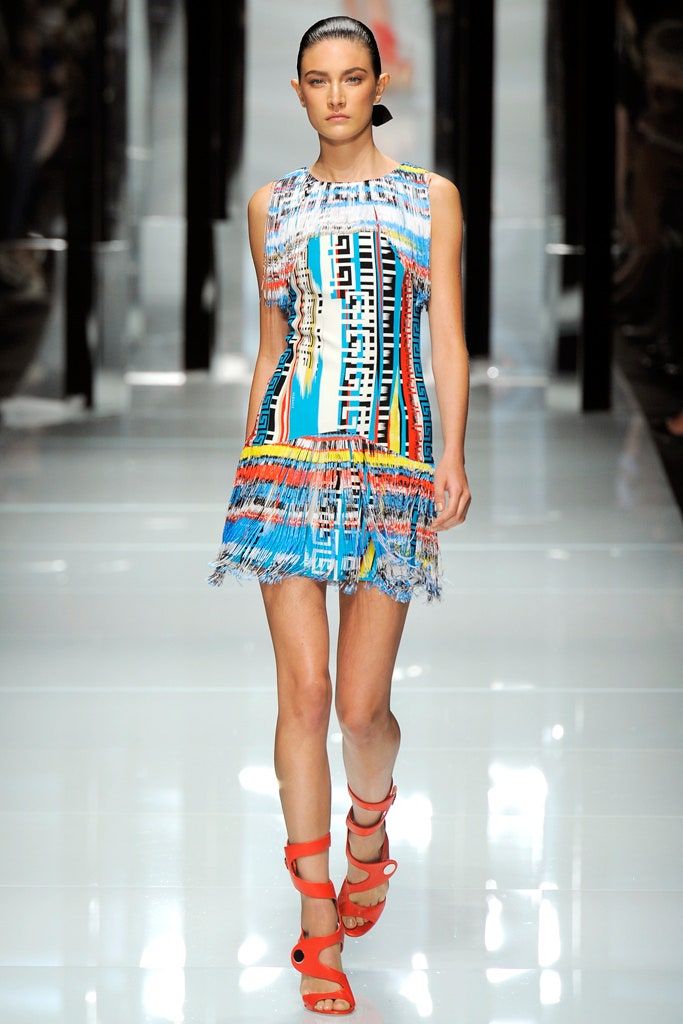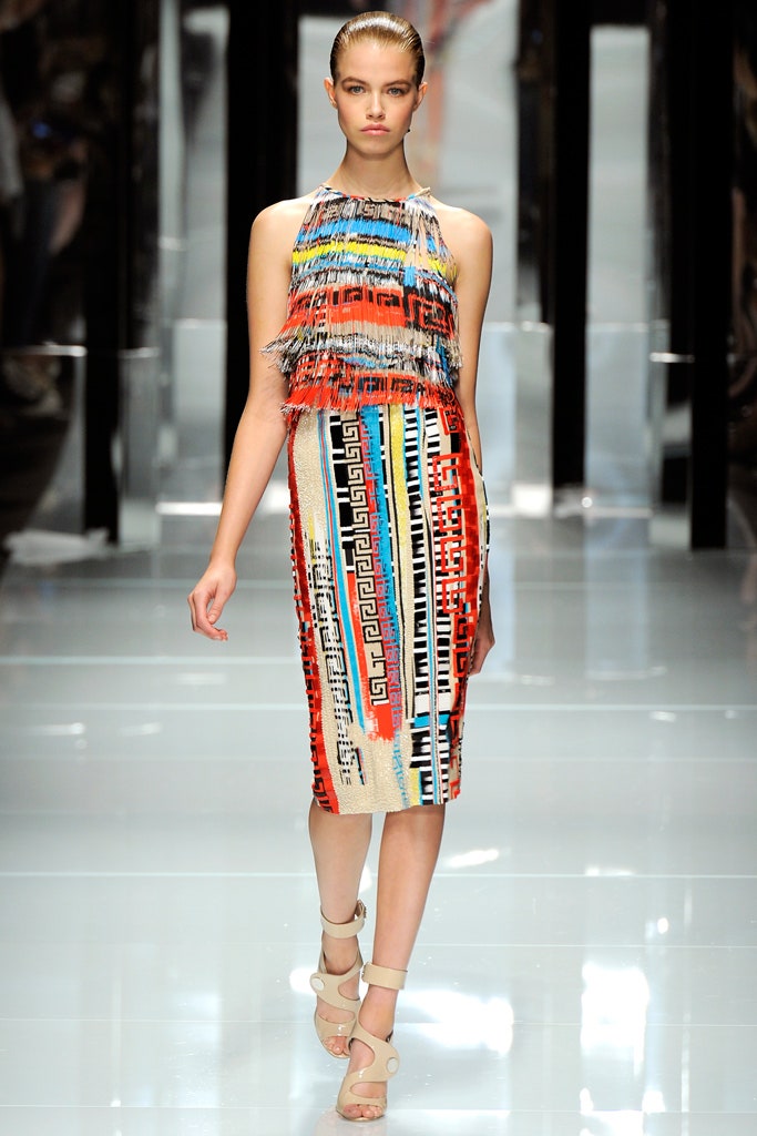 This collection is clean, structured and sensual -featuring sharp silhouettes and a delicious line of accessories. This collection is a testament to Donatella’s range. Formal elements mixed with athleticism were done quite well here. With a paired back color palette, featuring detailing in primary colors The clothes were reminiscent of pop artworks. The collection ended with three impeccably constructed head-to-toe fringe gowns. Versace’s iconic Greek border takes center stage, adorning garments as panels, stripes, and prints, embodying the brand’s distinctive design codes.