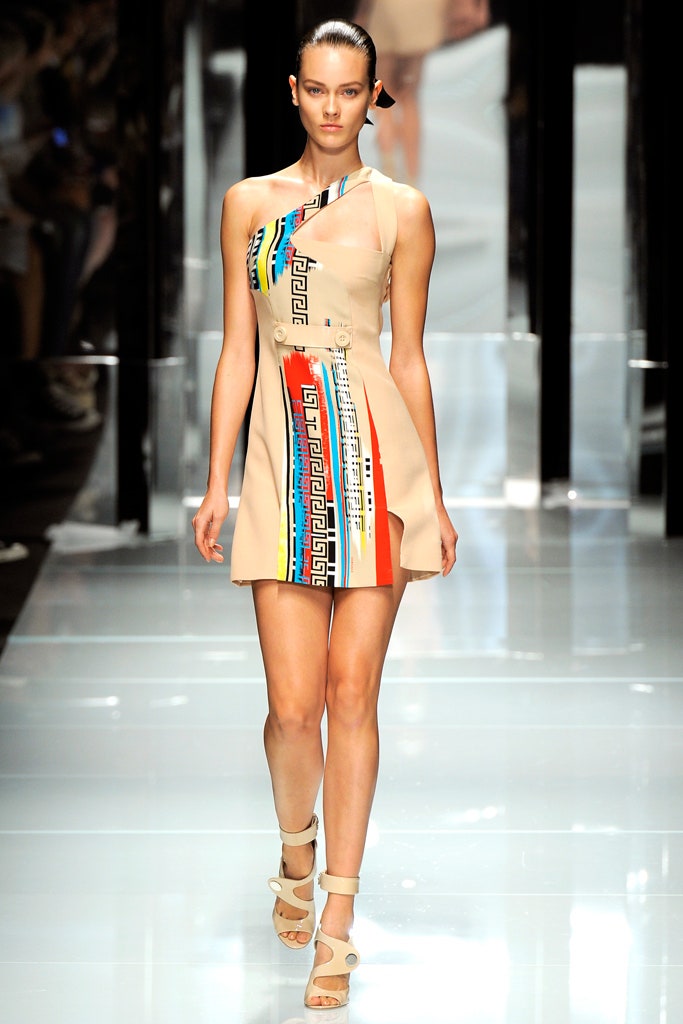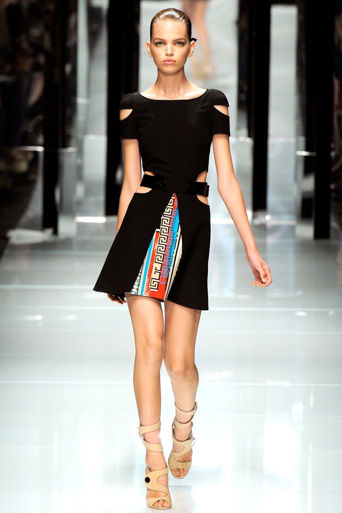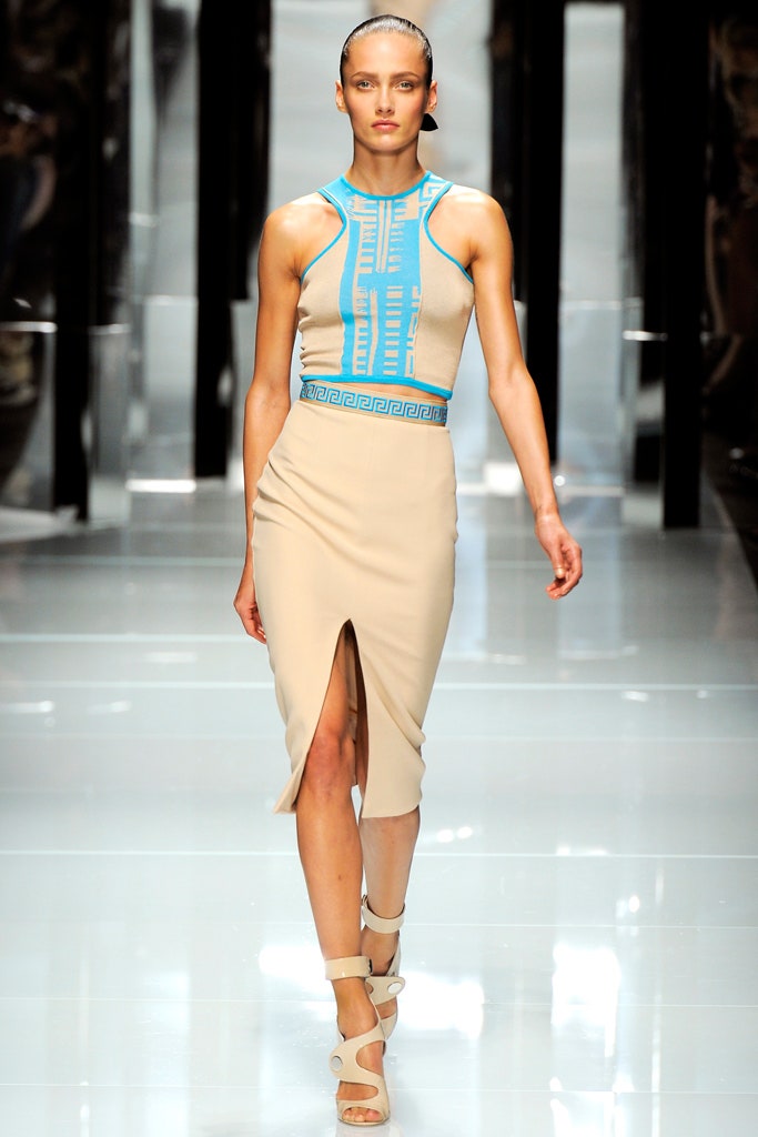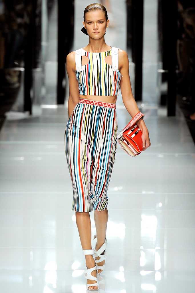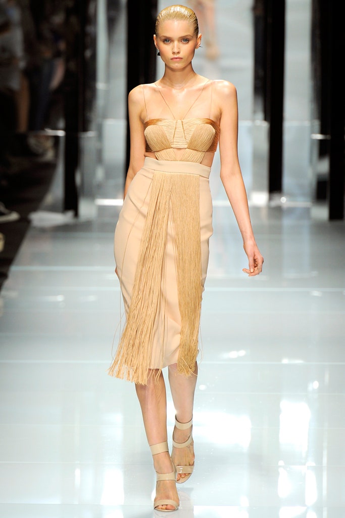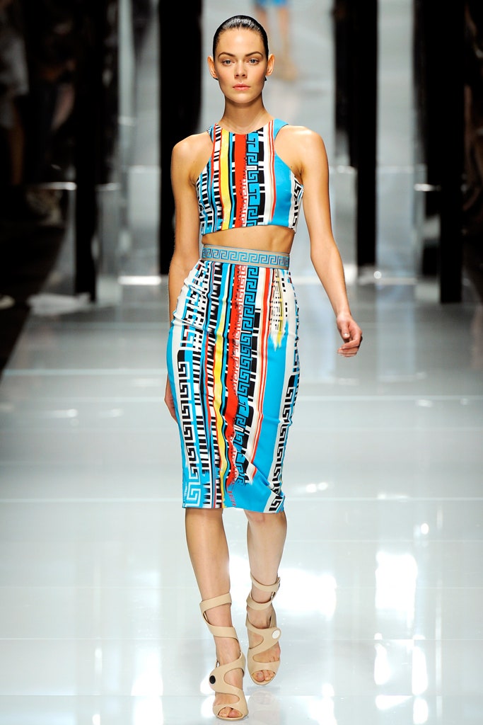 This collection is clean, structured and sensual -featuring sharp silhouettes and a delicious line of accessories. This collection is a testament to Donatella’s range. Formal elements mixed with athleticism were done quite well here. With a paired back color palette, featuring detailing in primary colors The clothes were reminiscent of pop artworks. The collection ended with three impeccably constructed head-to-toe fringe gowns. Versace’s iconic Greek border takes center stage, adorning garments as panels, stripes, and prints, embodying the brand’s distinctive design codes.