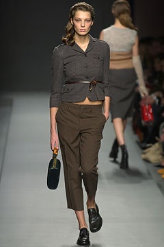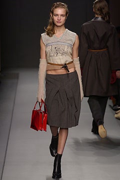 Miu Miu embraces a spirited sibling rivalry with a mature collection, featuring tweeds, furs, raincoats, and chic croc bags. Rich, moody hues dominate the runway, creating a captivating visual atmosphere. The collection truly shines with its statement skirts that steal the spotlight – a delightful fusion of playful styling and avant-garde design.