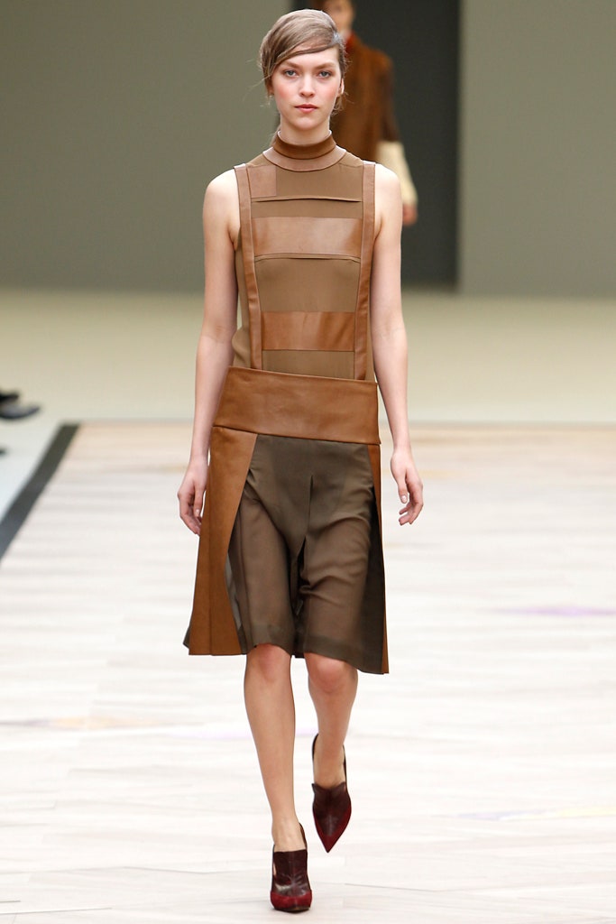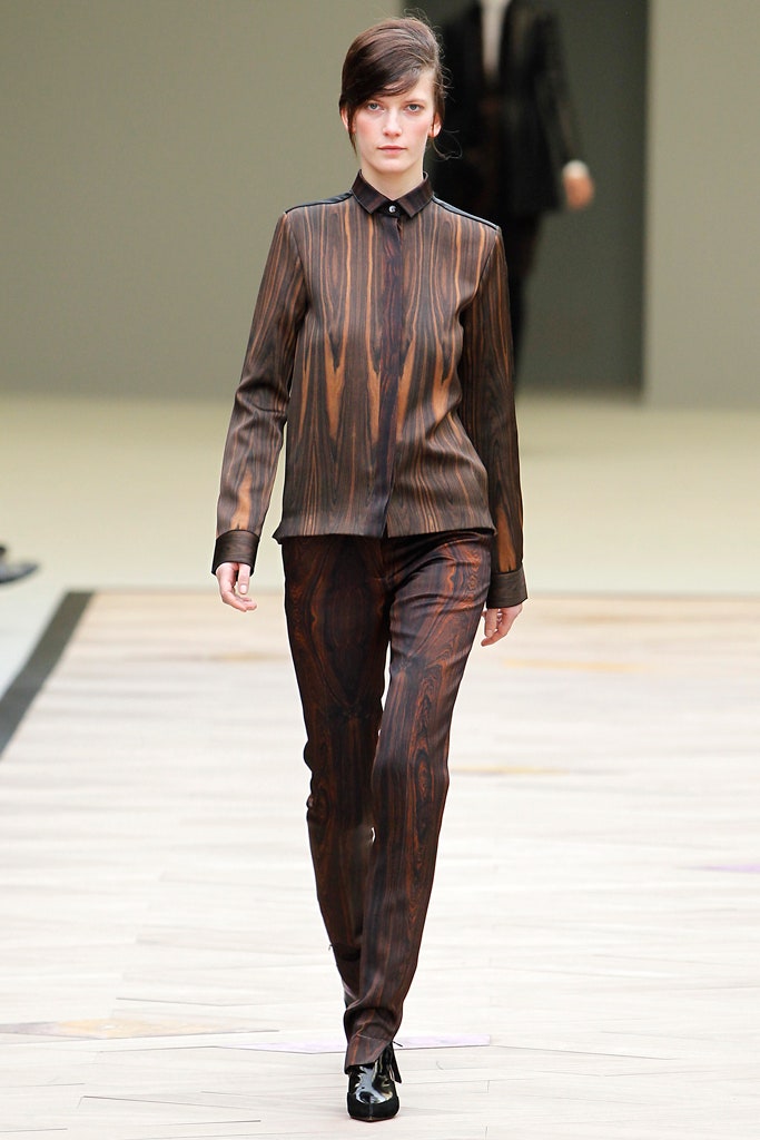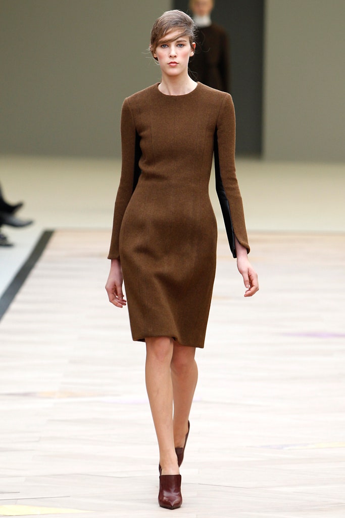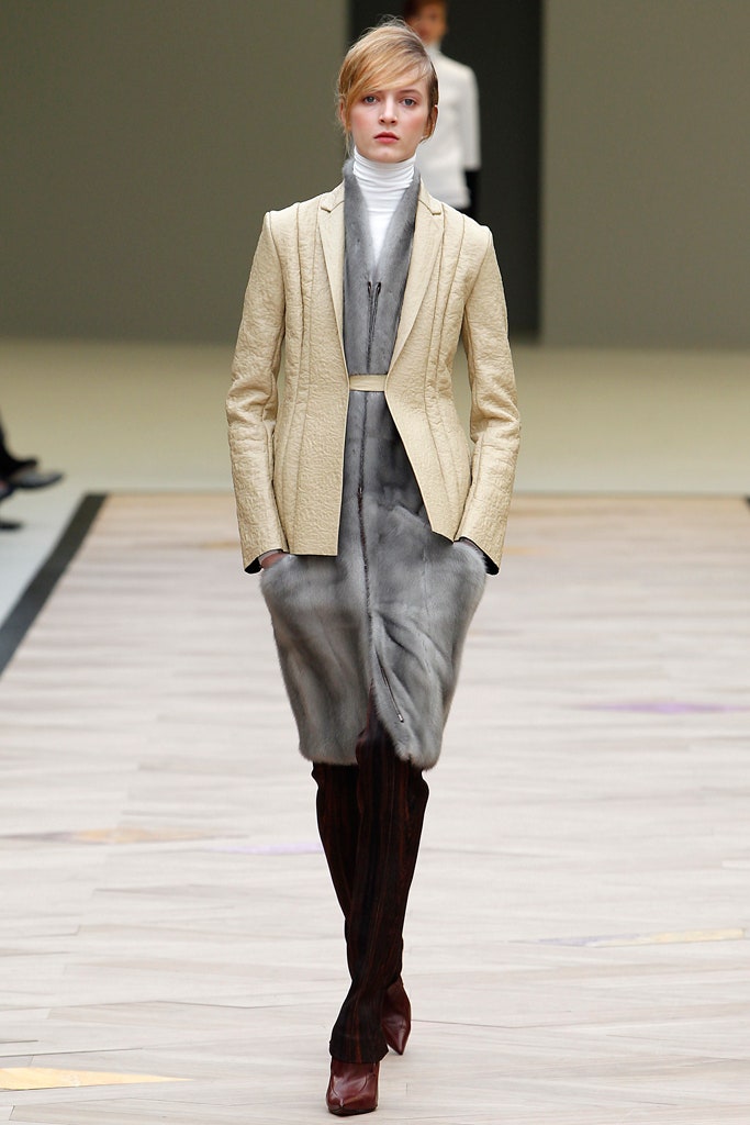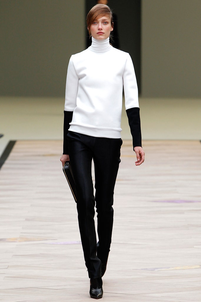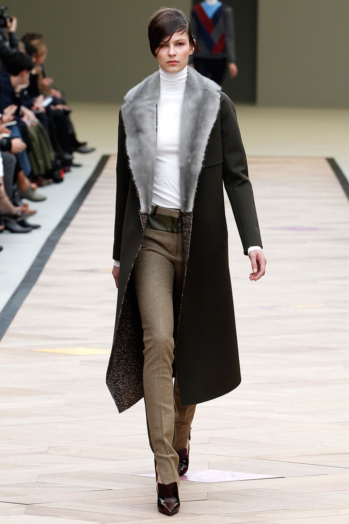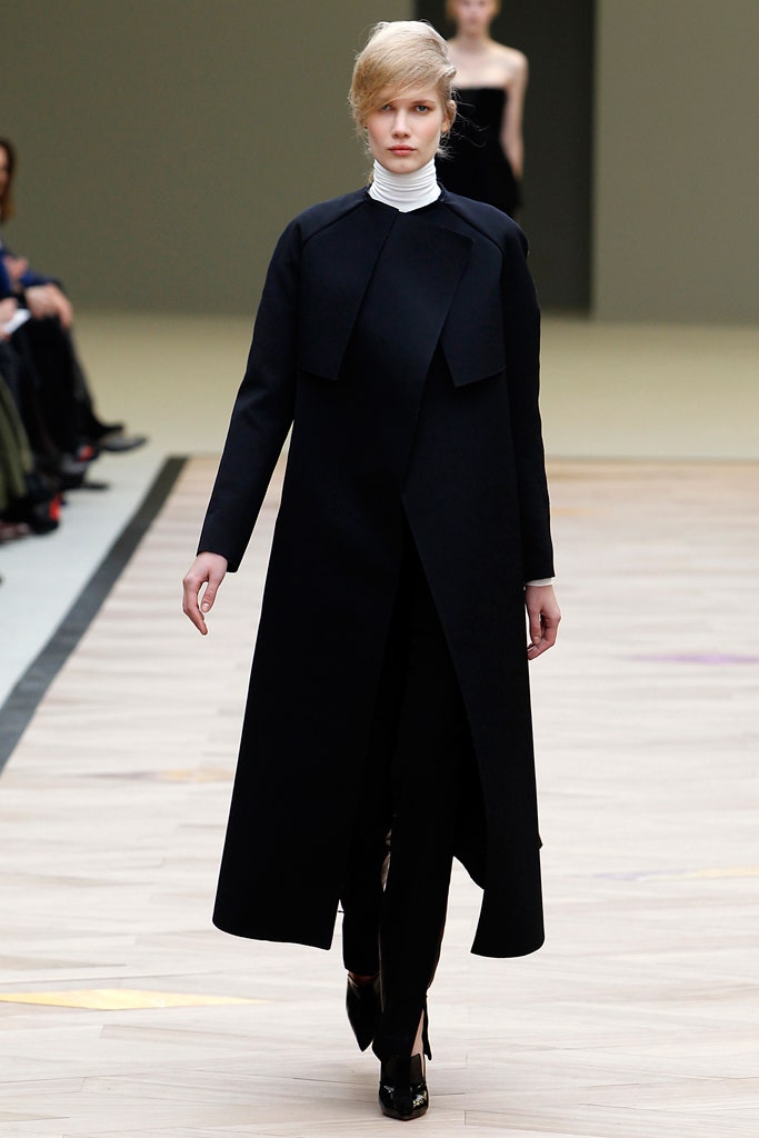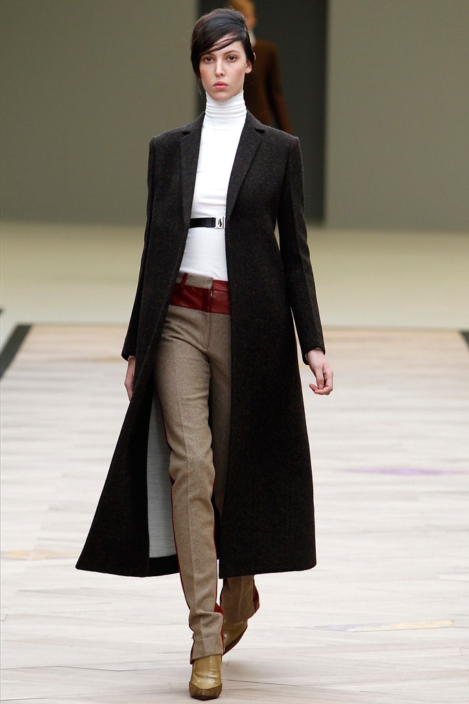 This Celine collection presents a clean, minimalist aesthetic with a rich palette of warm and deep colours. This season’s inspiration drew from the world of automobiles, particularly the interiors of cars, resulting in a unique and engaging theme. The pieces are impeccably crafted, showcasing high-quality materials. The collection cleverly employs easy shapes in heavy materials, adding a sense of structure and sophistication. Versatility is a key feature, allowing for easy dressing up or down. Notably, the standout pieces of this collection are the gorgeous coats that dominate the runway – refined, yet functional, additions to their wardrobe.