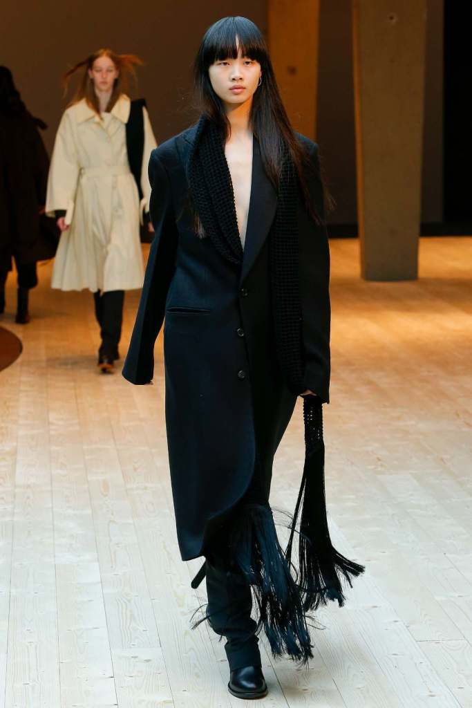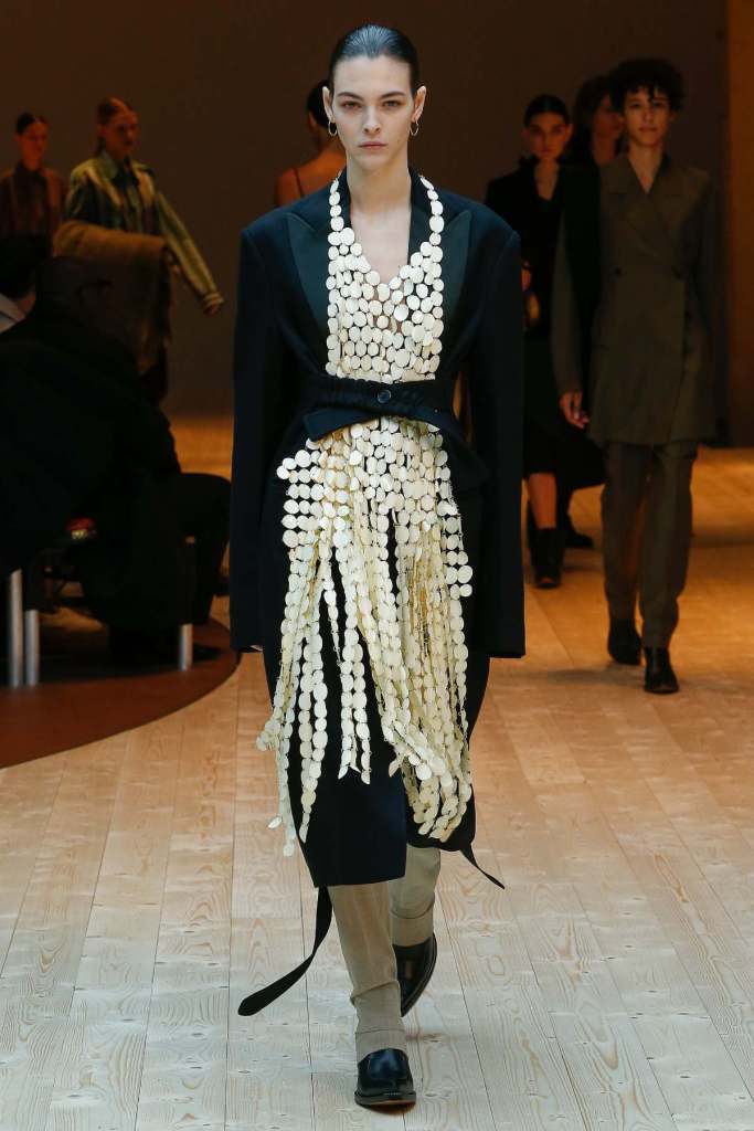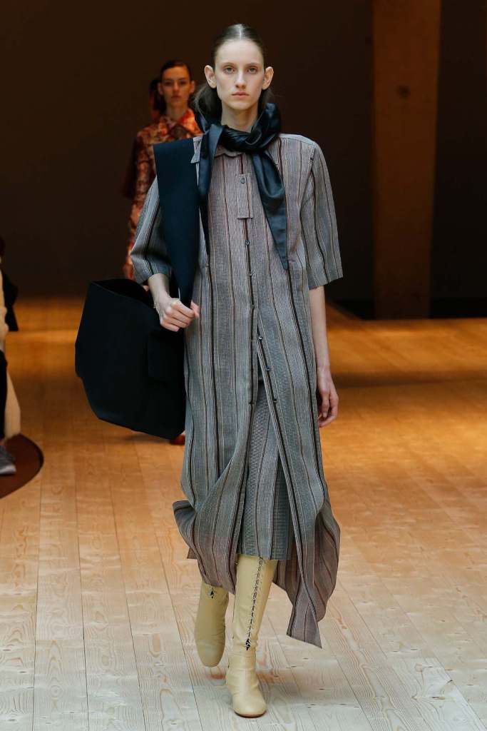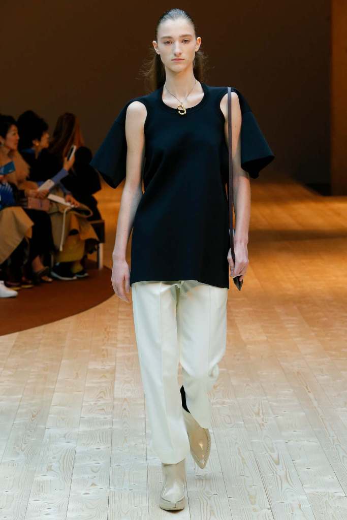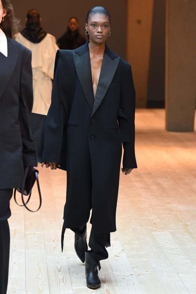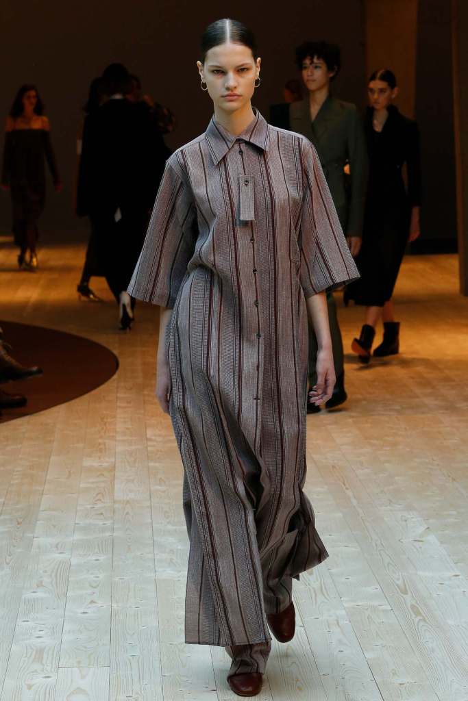 This collection exudes a sense of cosmopolitan practicality and versatility, reflecting her commitment to honing a chic wardrobe staples. The pieces presented here seamlessly merge style and wearability, anchored by wardrobe essentials like black pantsuits, tailored coats, and striped shirts. A muted colour palette of black, navy, grey, and white prevails, emphasizing the collection’s understated polish. Philo’s unwavering attention to detail is palpable in every item, from precise tailoring to impeccable finishes. Though the colours are subdued and silhouettes unembellished, it’s the captivating intricacies that shine. This collection is a well-edited testament to Phoebe Philo’s work.