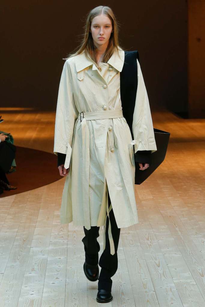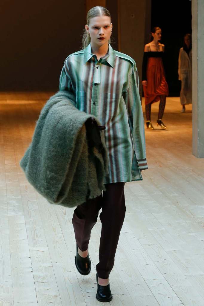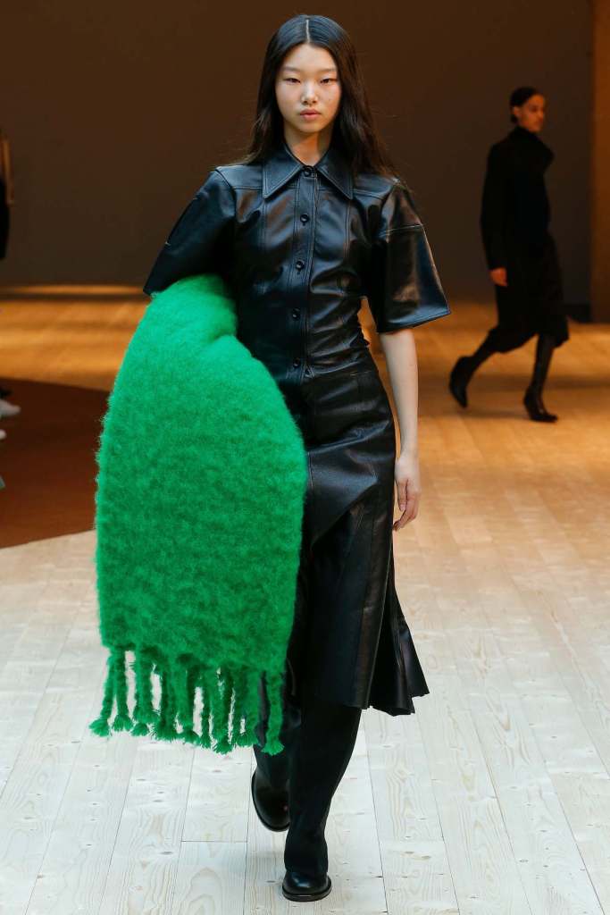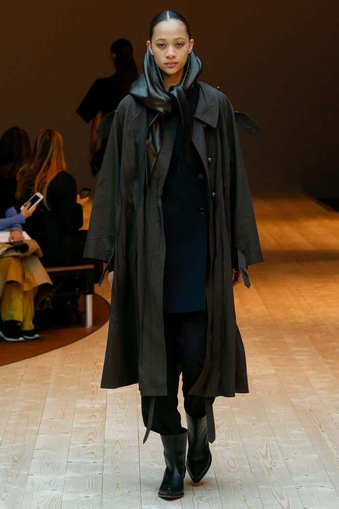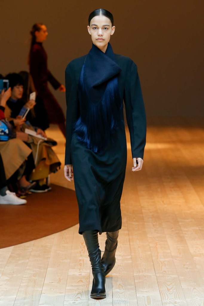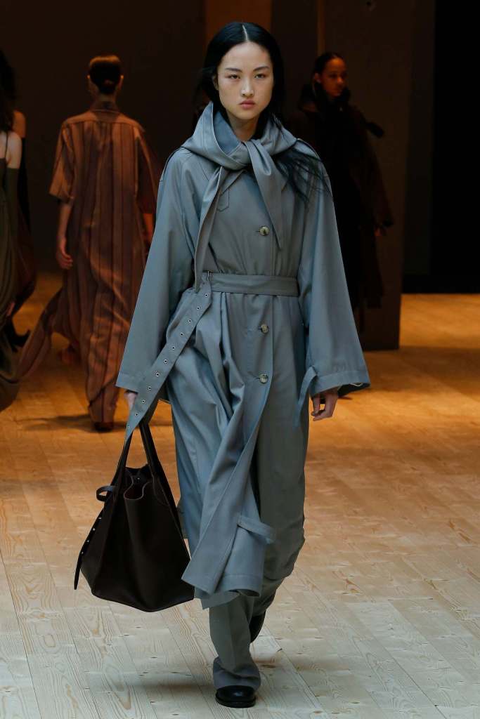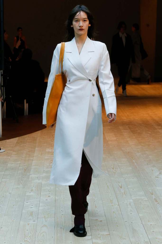 This collection exudes a sense of cosmopolitan practicality and versatility, reflecting her commitment to honing a chic wardrobe staples. The pieces presented here seamlessly merge style and wearability, anchored by wardrobe essentials like black pantsuits, tailored coats, and striped shirts. A muted colour palette of black, navy, grey, and white prevails, emphasizing the collection’s understated polish. Philo’s unwavering attention to detail is palpable in every item, from precise tailoring to impeccable finishes. Though the colours are subdued and silhouettes unembellished, it’s the captivating intricacies that shine. This collection is a well-edited testament to Phoebe Philo’s work.