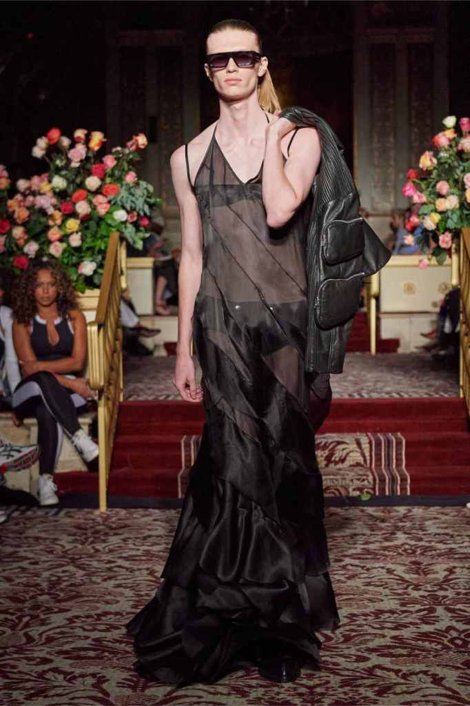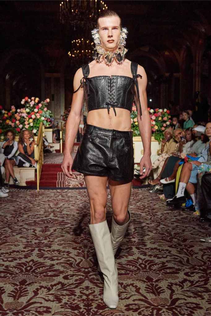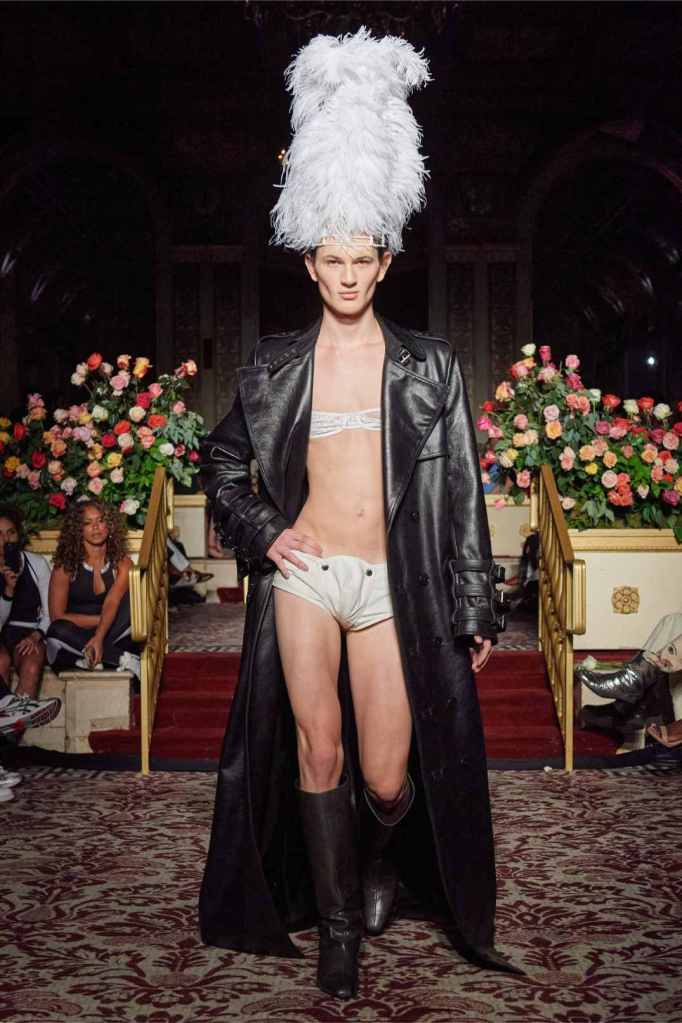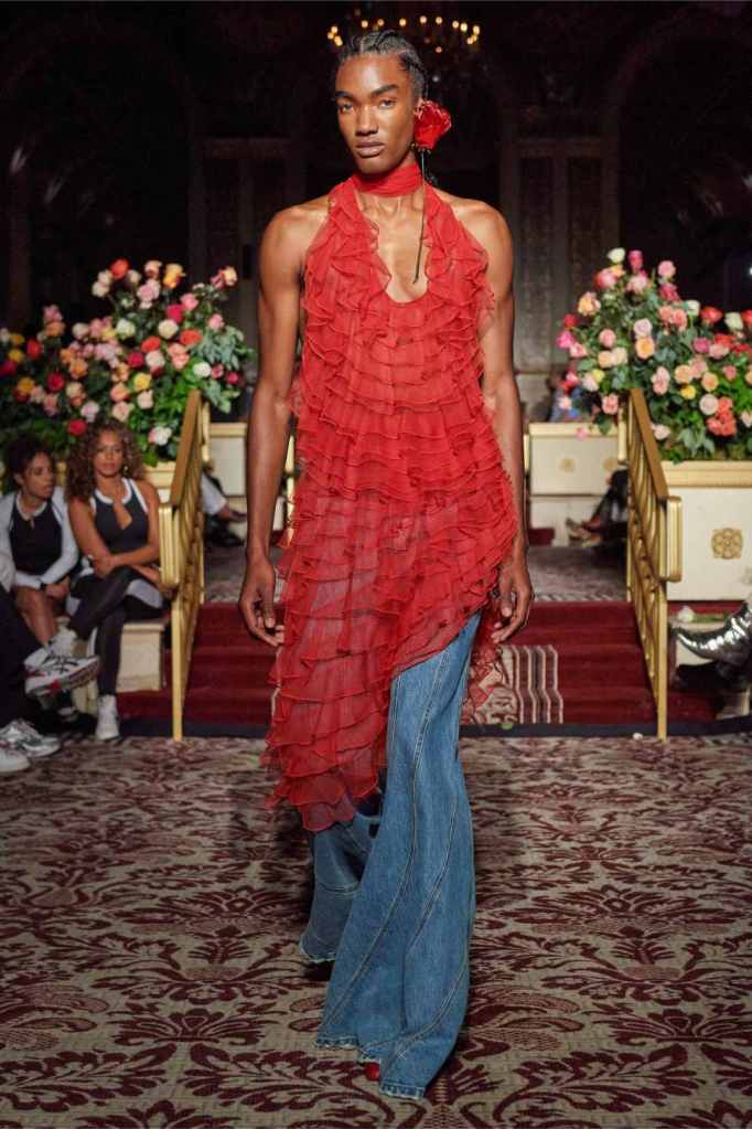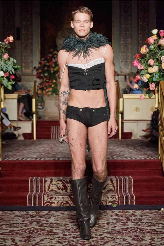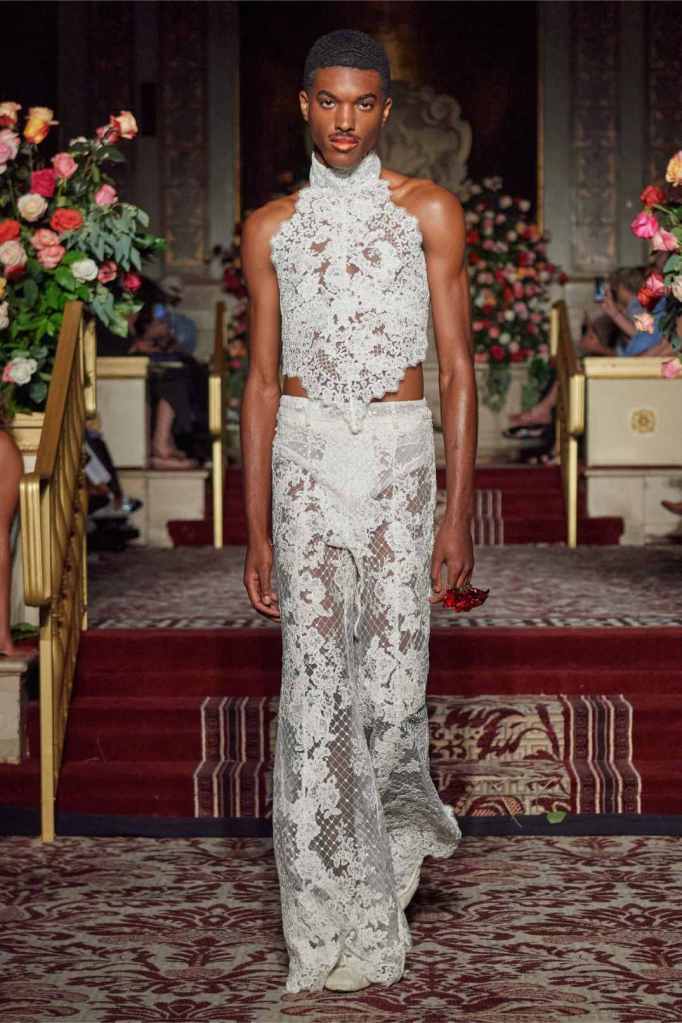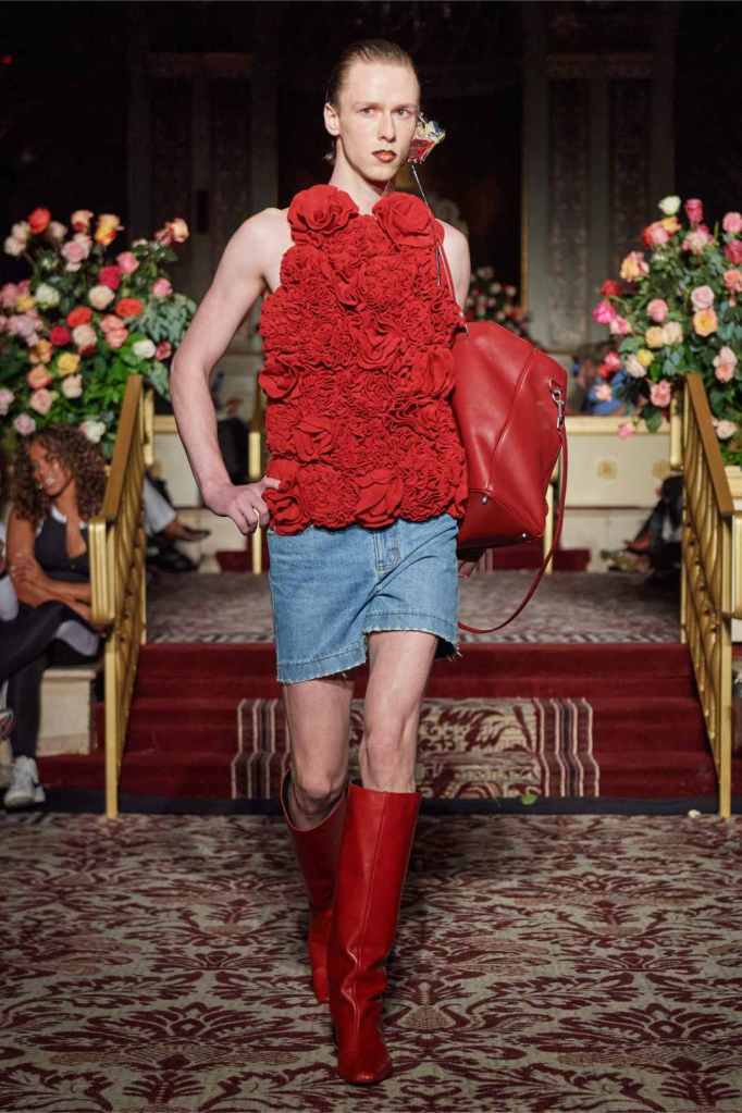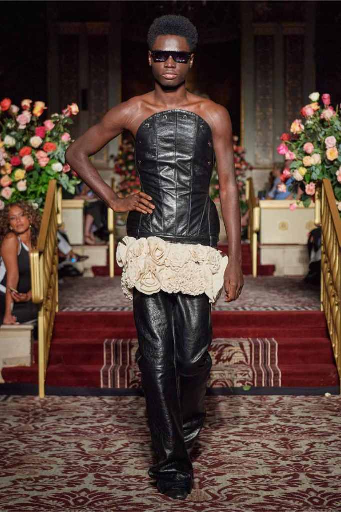 The Plaza’s opulent setting, adorned with roses – the collection flaunted decadent feathered camisoles, lace tanks, and provocative denim shorts. The collection features androgynous creations in crisp white, contrasting lace with denim and leather, and embraces floral motifs, challenging traditional gender boundaries and redefining masculine style tropes.
