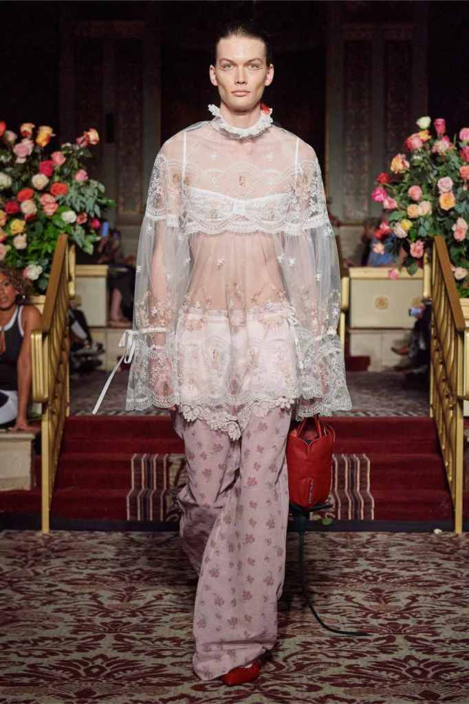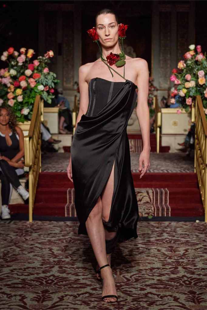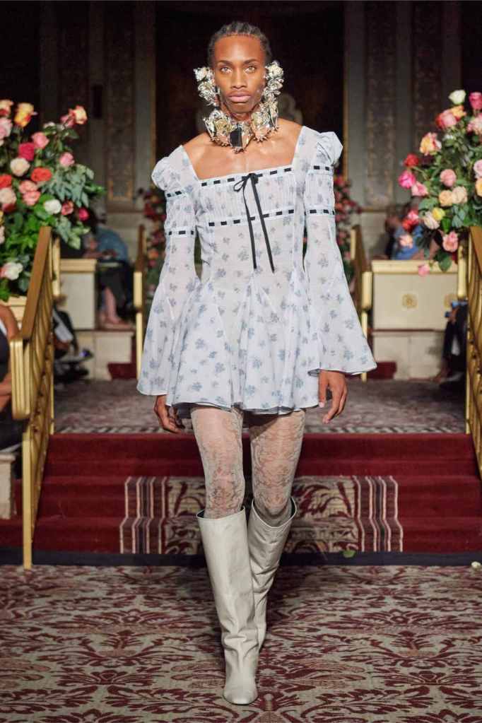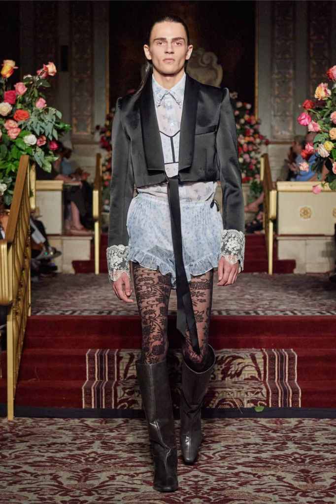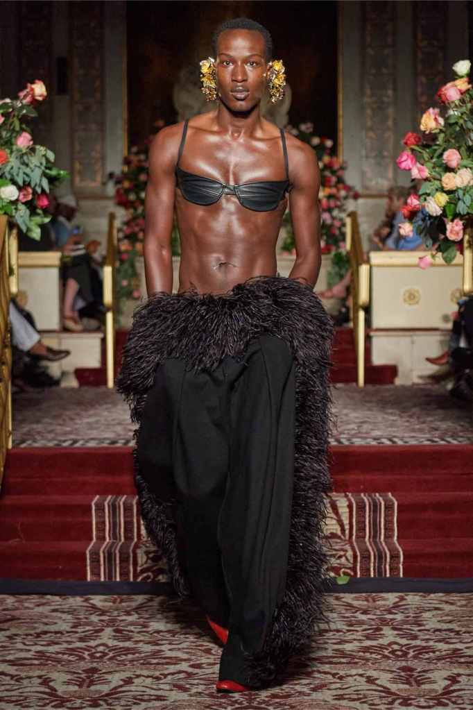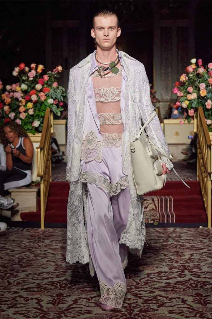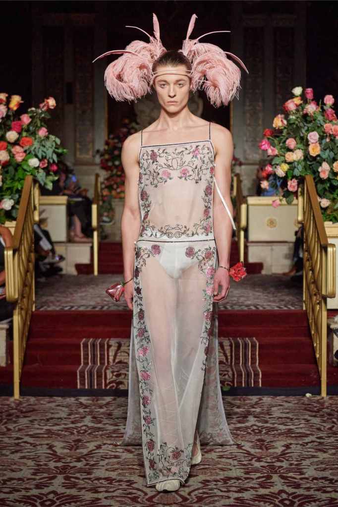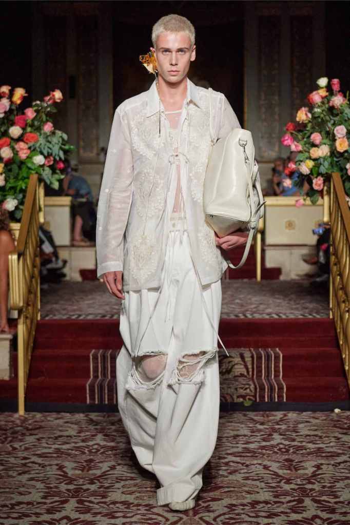 The Plaza’s opulent setting, adorned with roses – the collection flaunted decadent feathered camisoles, lace tanks, and provocative denim shorts. The collection features androgynous creations in crisp white, contrasting lace with denim and leather, and embraces floral motifs, challenging traditional gender boundaries and redefining masculine style tropes.