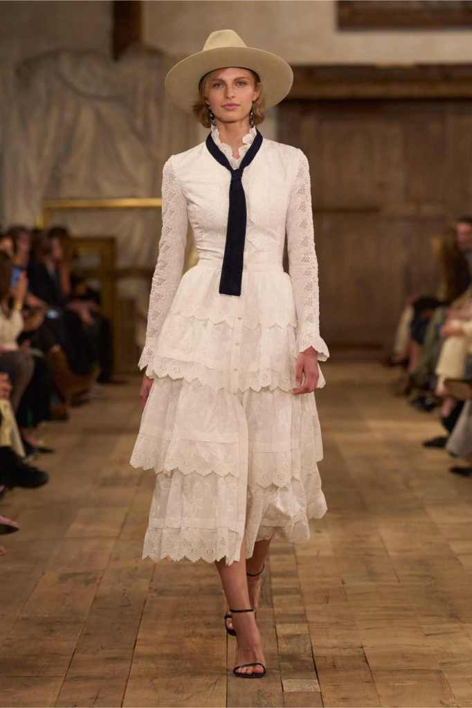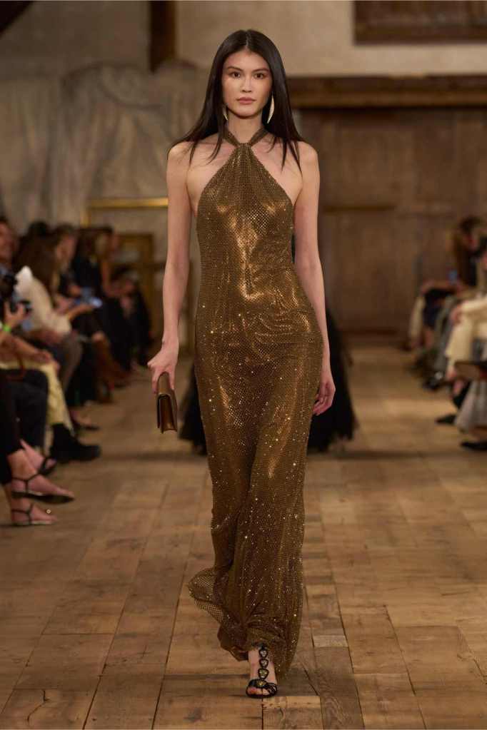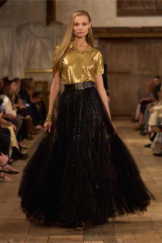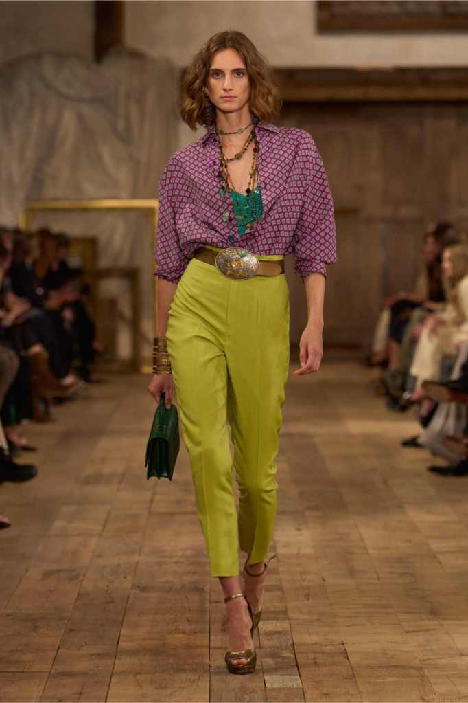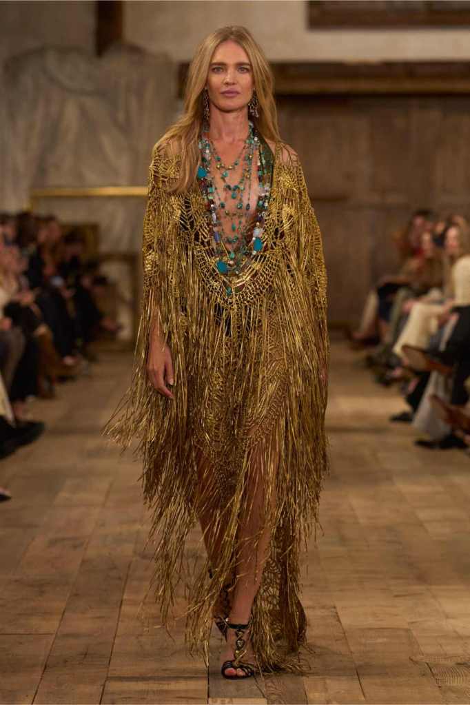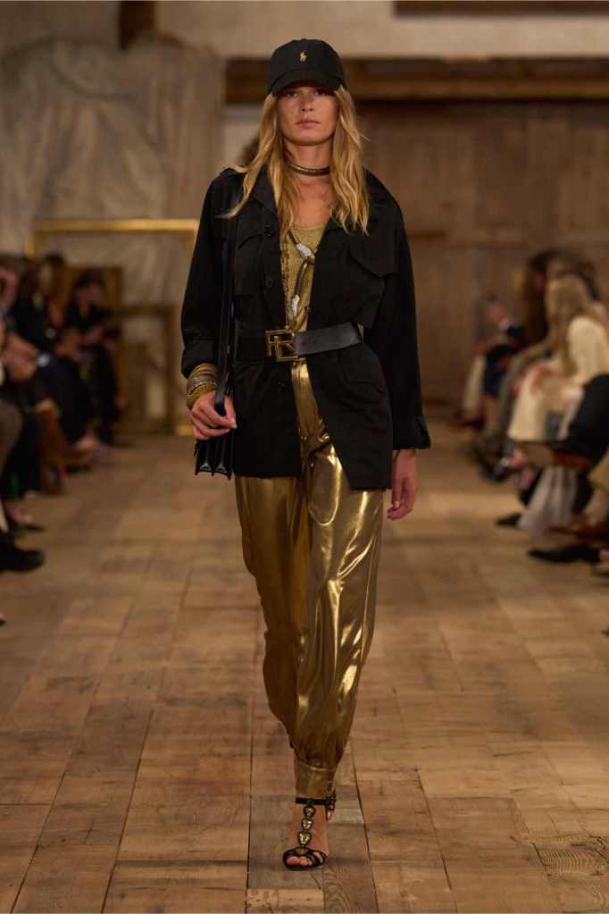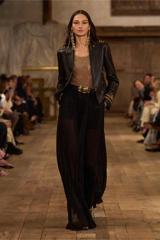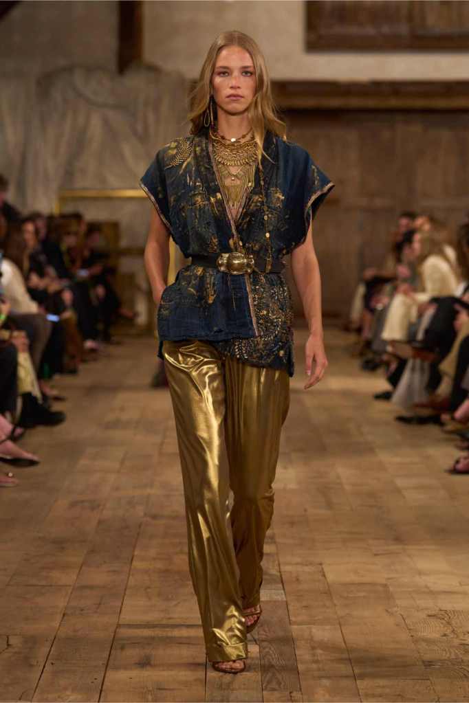 The intriguing denim treatments elevated denim into couture-like pieces, featuring sequins and beads. The clothes were defined by a new, cool, and rustic romance with painterly florals, classic shapes, military jackets, bold colors, corseted vests and a finale of vibrant bias-cut dresses. The finale embraced shiny gold metallics for formal evening wear. Traditional silhouettes meet daring experimentation in color and texture, offering a collection that resonates with contemporary women while retaining enduring appeal.