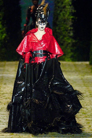 This collection was pure medieval glamour amped up to a thousand. The clothes in this collection can be divided into six unofficial sections. The first one is all about heavily armored gowns dripping in chainmail, embellishments, sequins and beaded headgears. The next is all about hardcore gothic outfits crafted with trash bags featuring statement red vinyl. Then we move on to some deliciously saturated skirt suits with heavy gold embellishments and decorations(This was actually the most wearable section of the collection). Next, we have the iconic rush of topiary couture – Shades of green ruffled together to showcase the perfectly hedged castle gardens. The next section is more goth in nature with heavy fur jackets, some metallic mini dresses and pastel eveningwear. The collection closed with massive metallic colorful gowns. So all in all you have a typical Dior by Galliano collection – fantastical and fabulous.