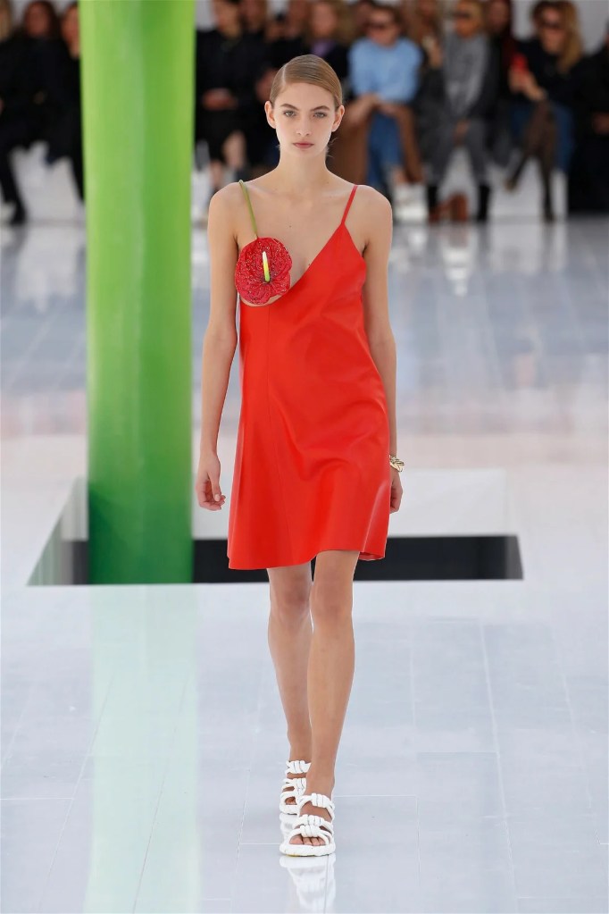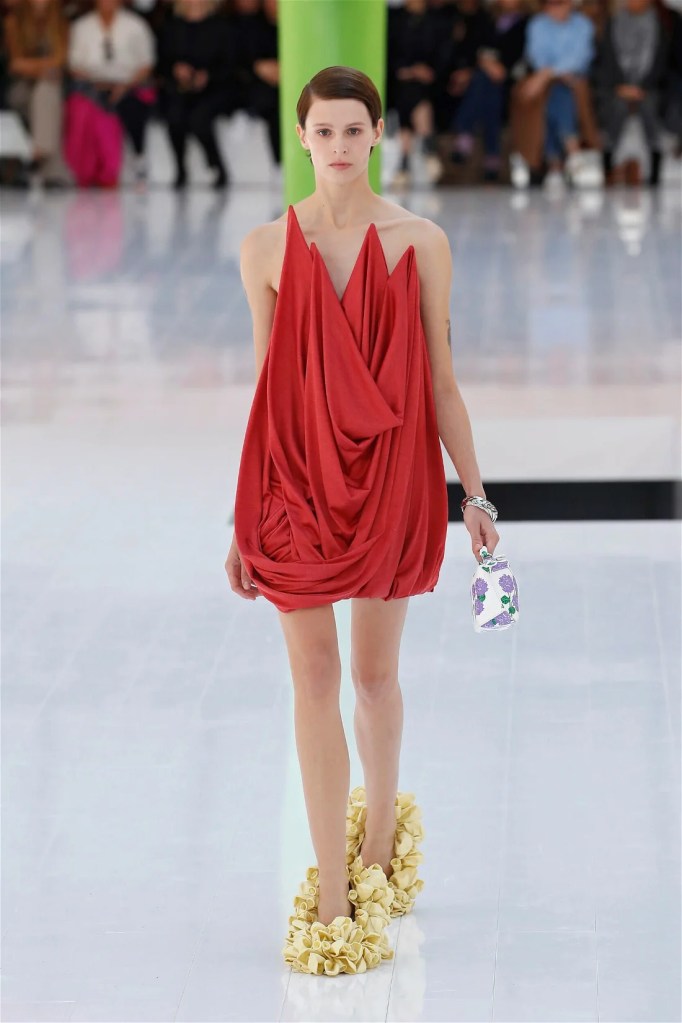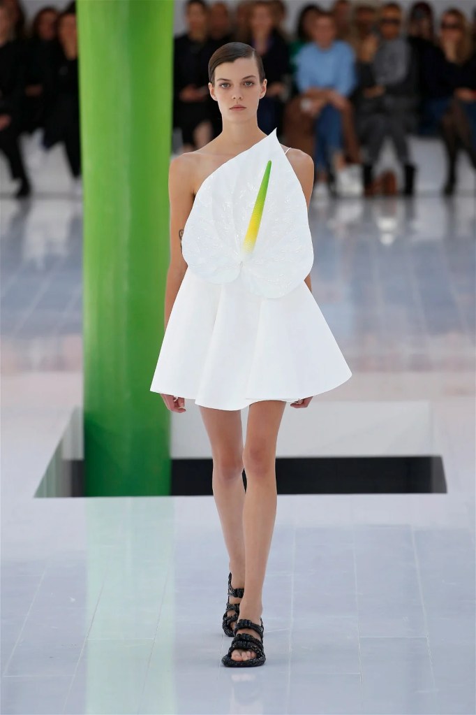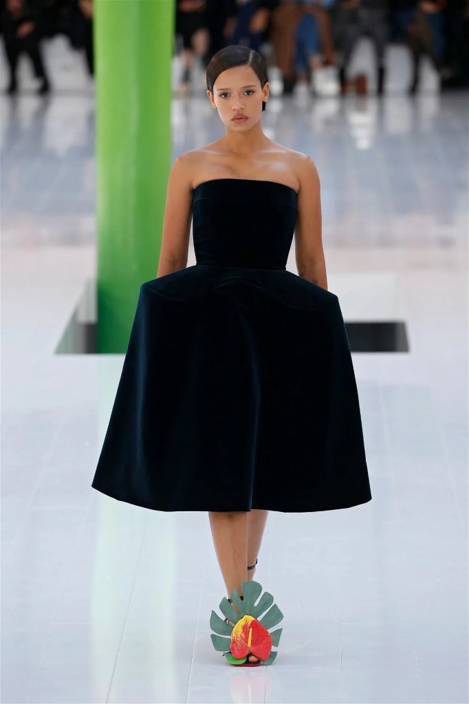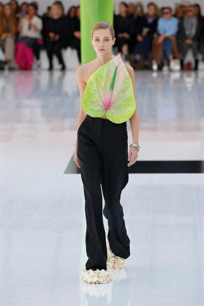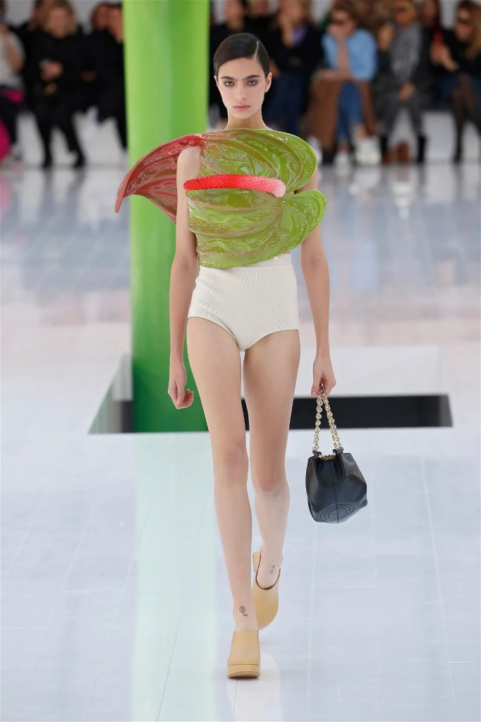 A delightful mind-bend, drawing inspiration from the dreamlike visions of Spanish artist Luis Buñuel. Trompe l’oeil prints blurred the lines between reality and illusion, with garments mimicking skin, feathers, and even flowers. Some stand-out items in this collection were anthurium bustiers, pixelated sweatshirts, velvet pannier dresses, draped cocktail dresses and some pleated mini polo dresses. The collection’s minimal rich nature-inspired details added authenticity and drama.