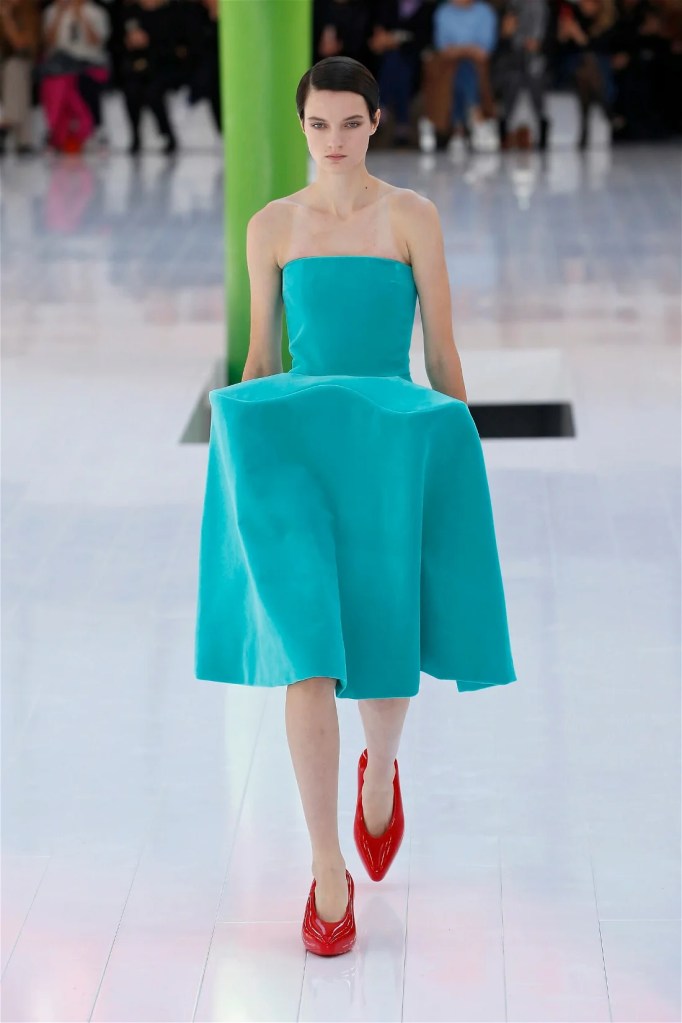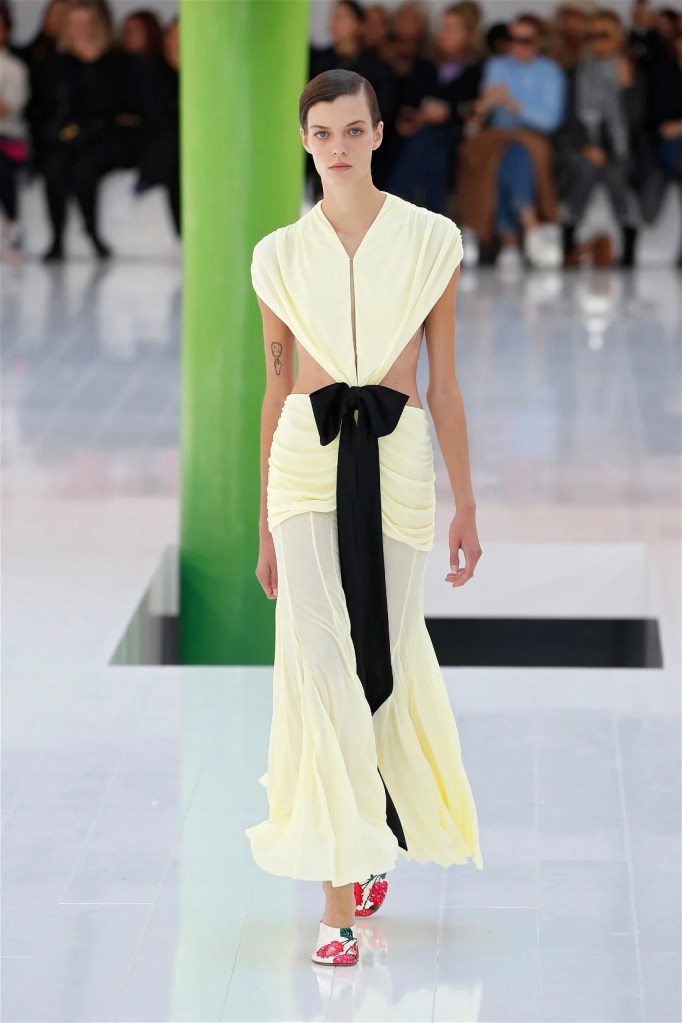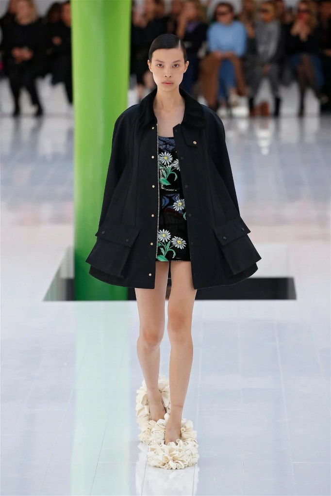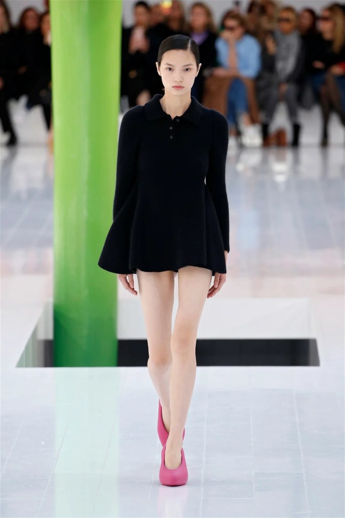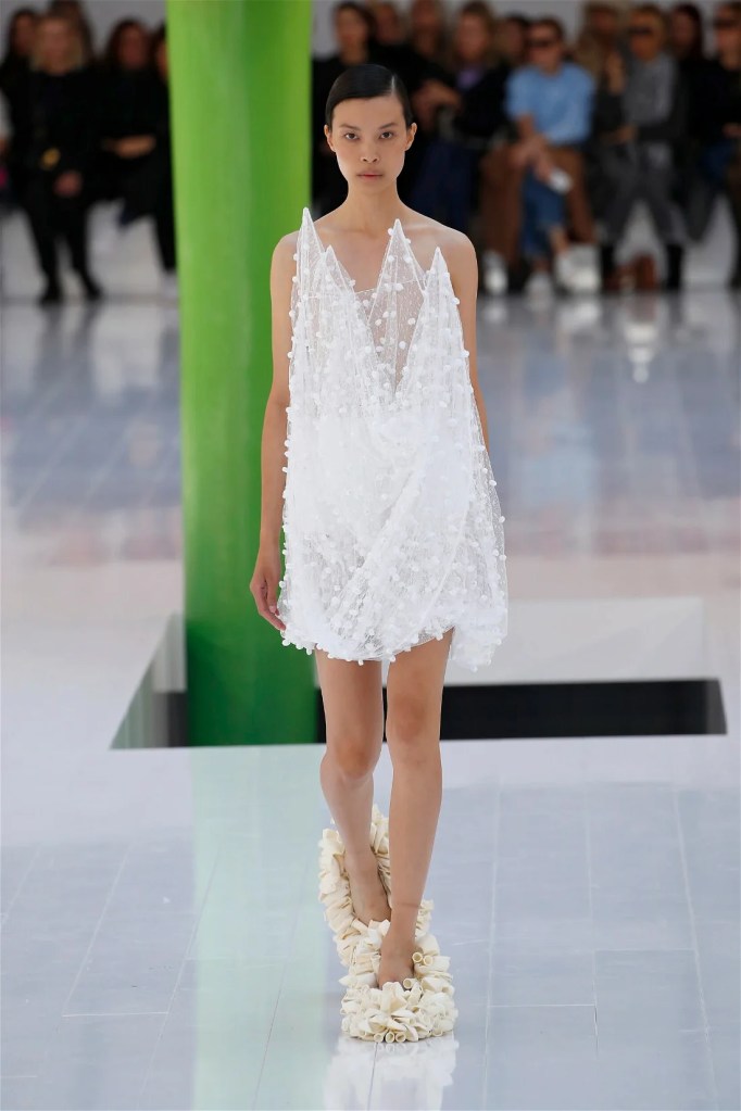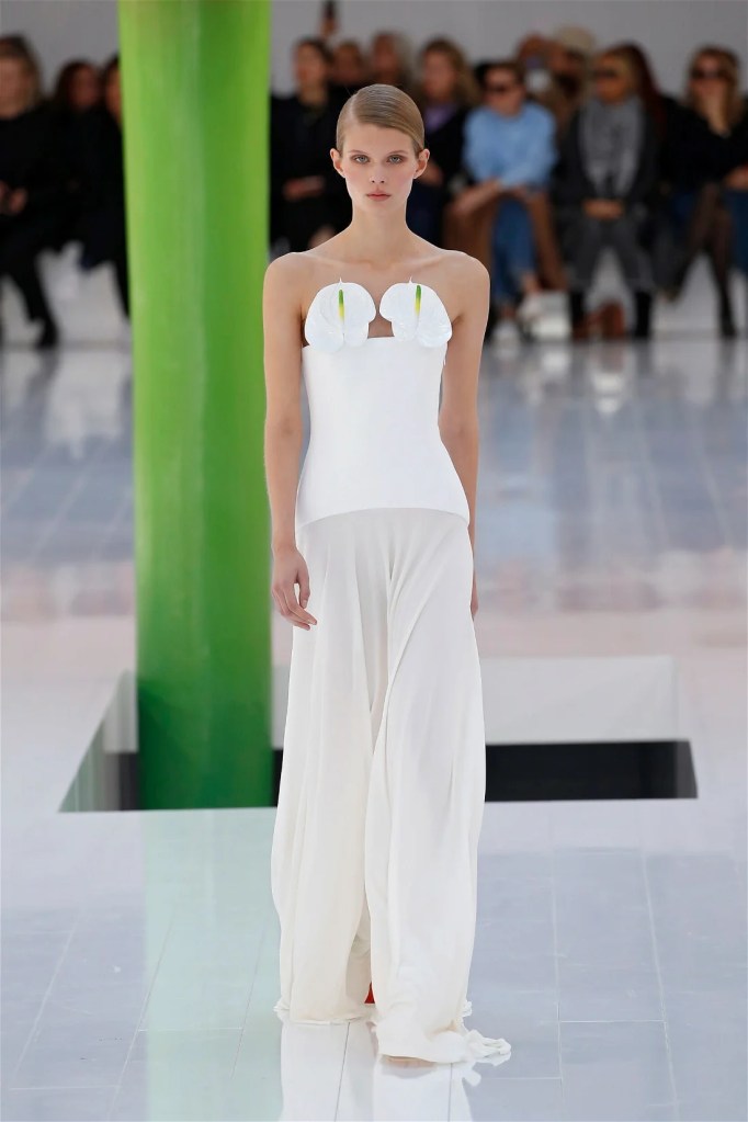 A delightful mind-bend, drawing inspiration from the dreamlike visions of Spanish artist Luis Buñuel. Trompe l’oeil prints blurred the lines between reality and illusion, with garments mimicking skin, feathers, and even flowers. Some stand-out items in this collection were anthurium bustiers, pixelated sweatshirts, velvet pannier dresses, draped cocktail dresses and some pleated mini polo dresses. The collection’s minimal rich nature-inspired details added authenticity and drama.