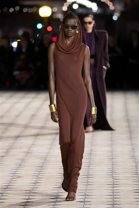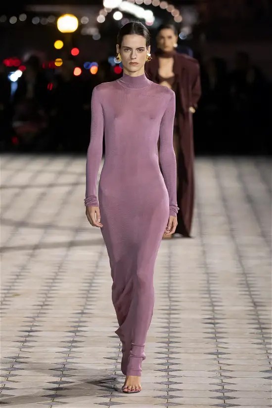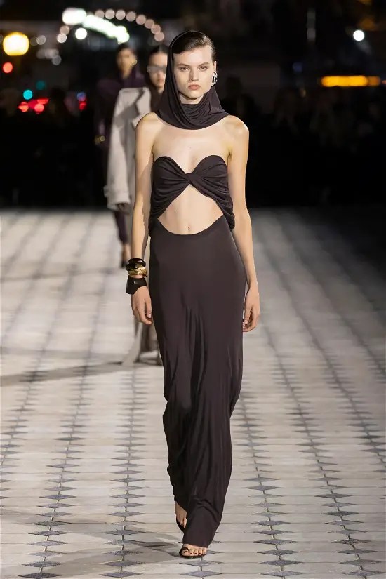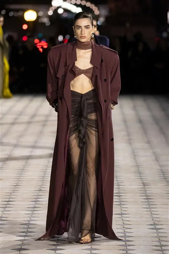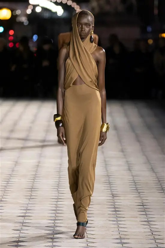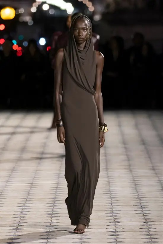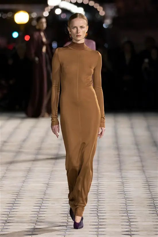 Muted earthy tones – browns, purples, olives – painted slender, monochromatic looks that celebrated the beauty of form with quiet confidence. While lacking the usual vibrancy, the collection exuded a newfound ease and sensuality, leaving an alluringly understated mark.