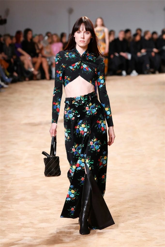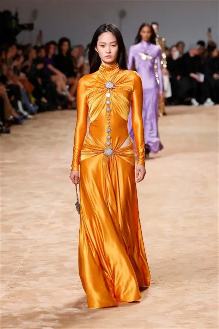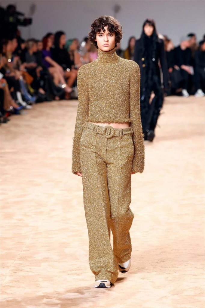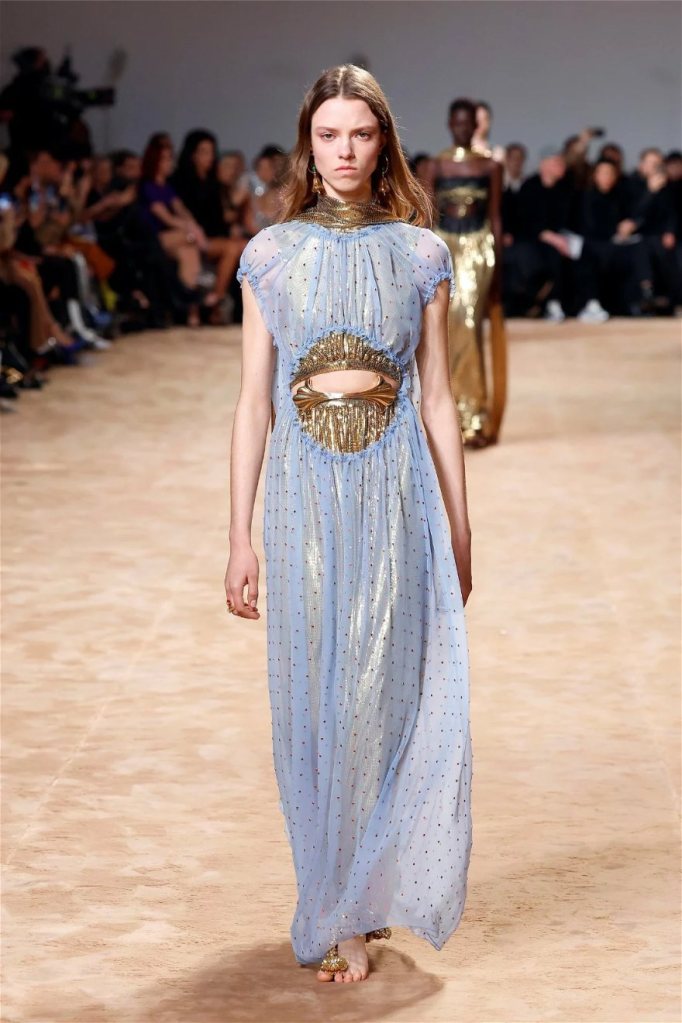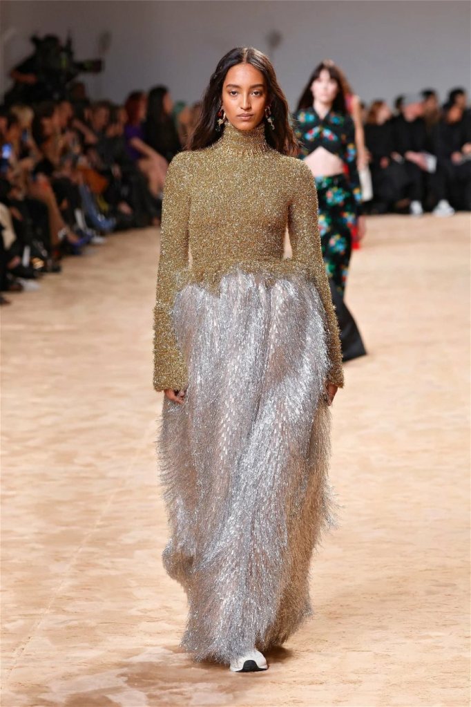 The surreal spirit extends to the closing looks, direct reinterpretations of iconic minidresses, where Rabanne’s fantasy world breaks conventions with inventive garments. Metallic fabrics, ranging in gold, silver, and bronze, dominate the collection, adorning everything from delicate dresses to structured jackets. With chainmail dresses, jingling inventive garments, and Dali-inspired prints, the collection seamlessly marries fantasy with real-world sensibilities, offering a captivating and glamorous journey through Paco Rabanne’s storied legacy.