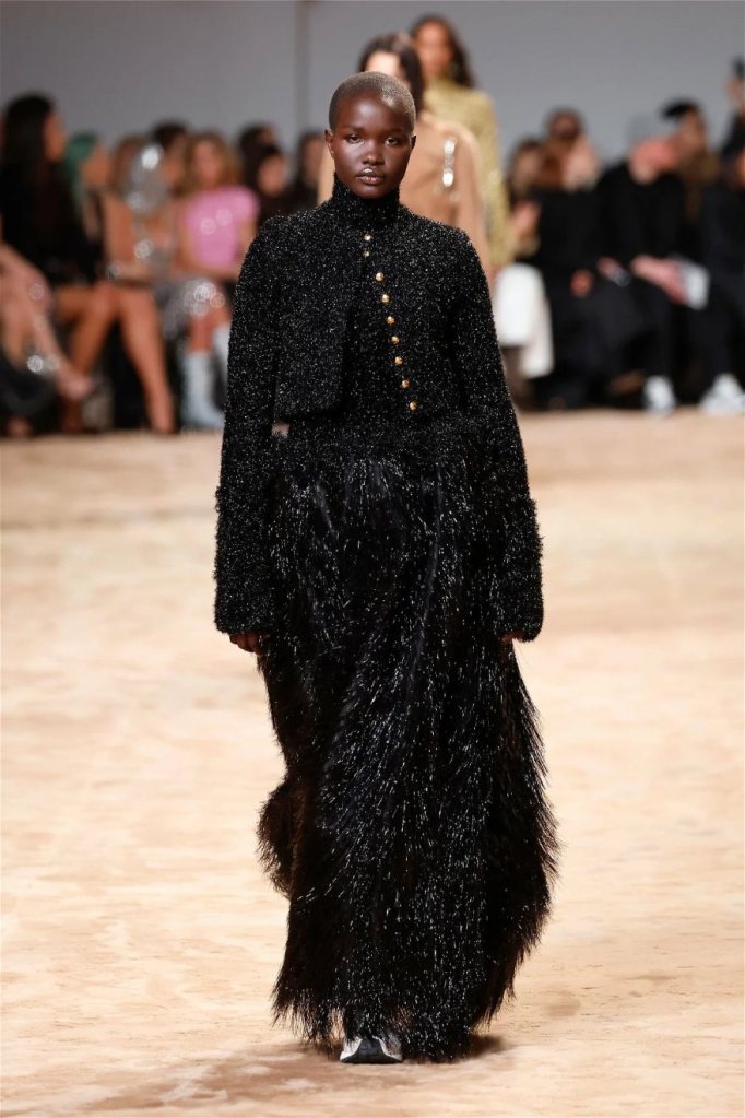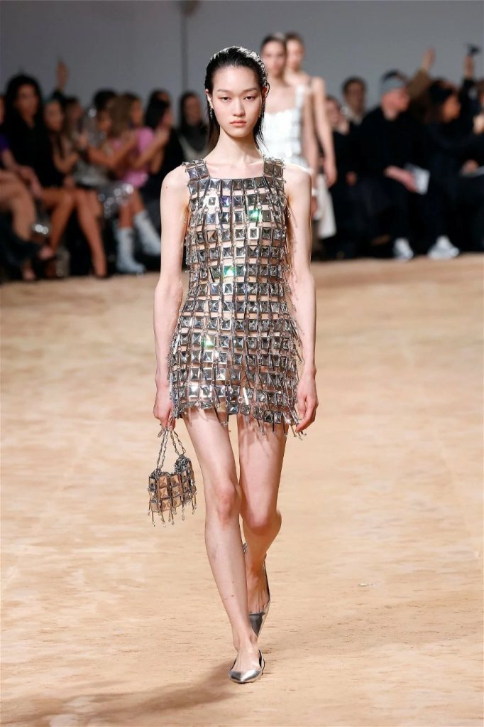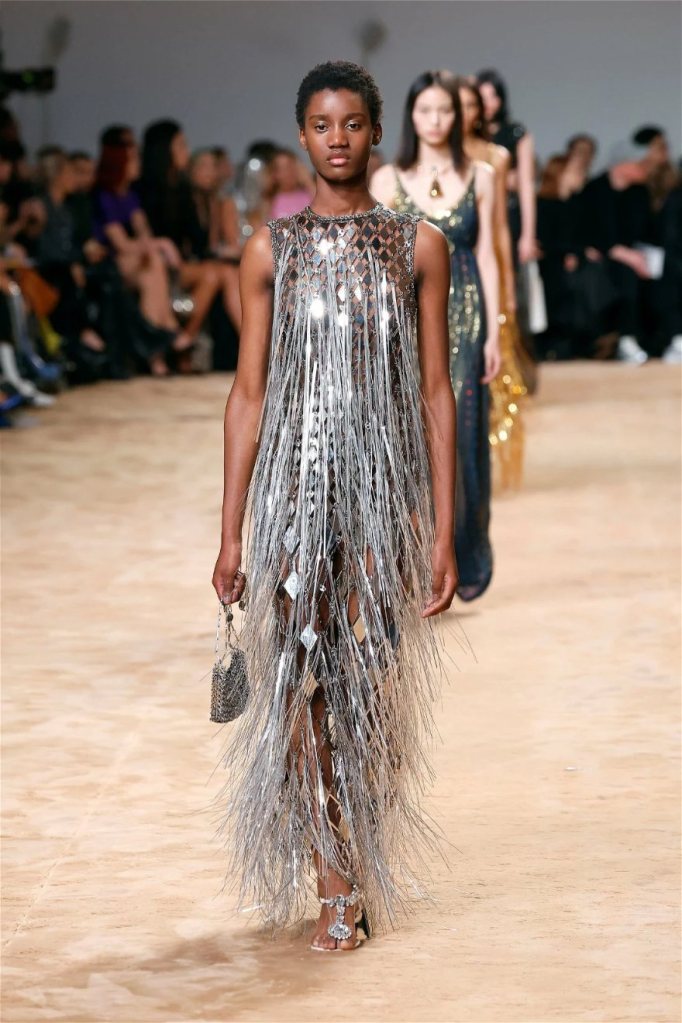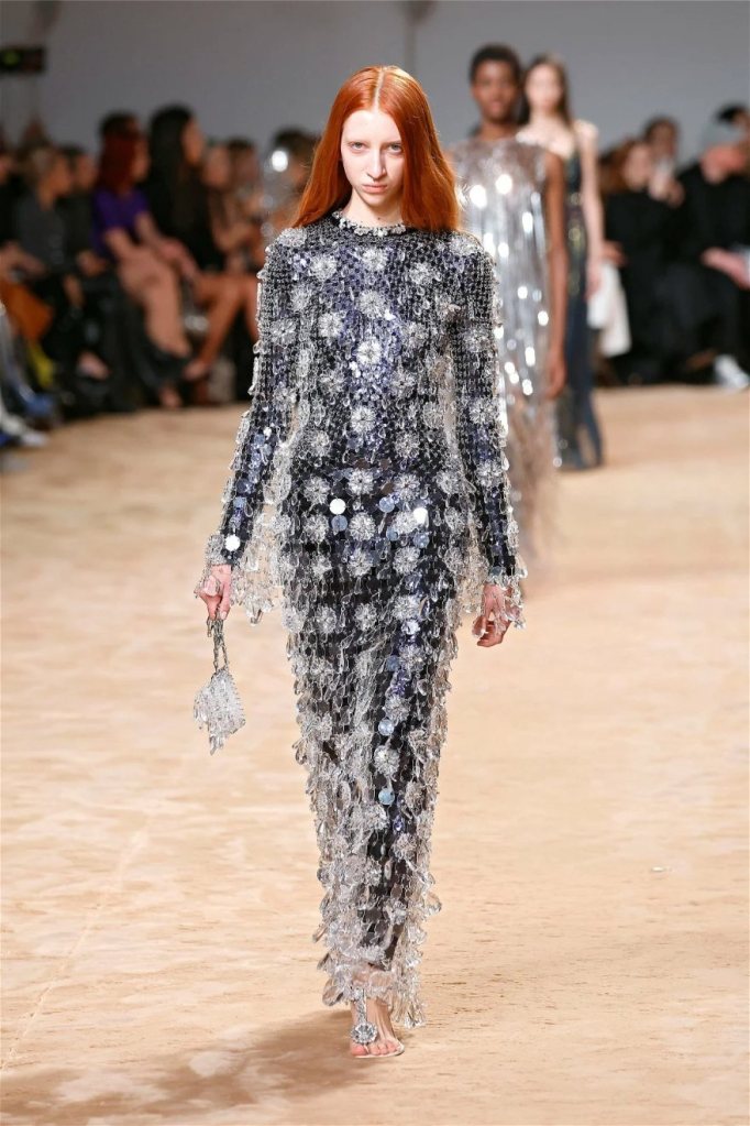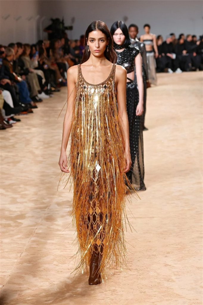 The showcase brilliantly reinterprets Rabanne’s iconic elements—chainmail, feathers, and metallics—in a contemporary light, breathing fresh life into the brand’s signature aesthetics.