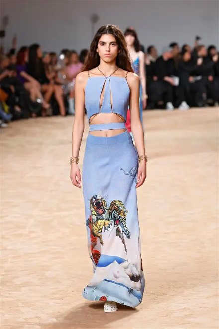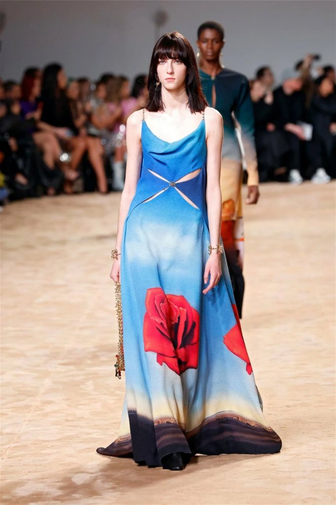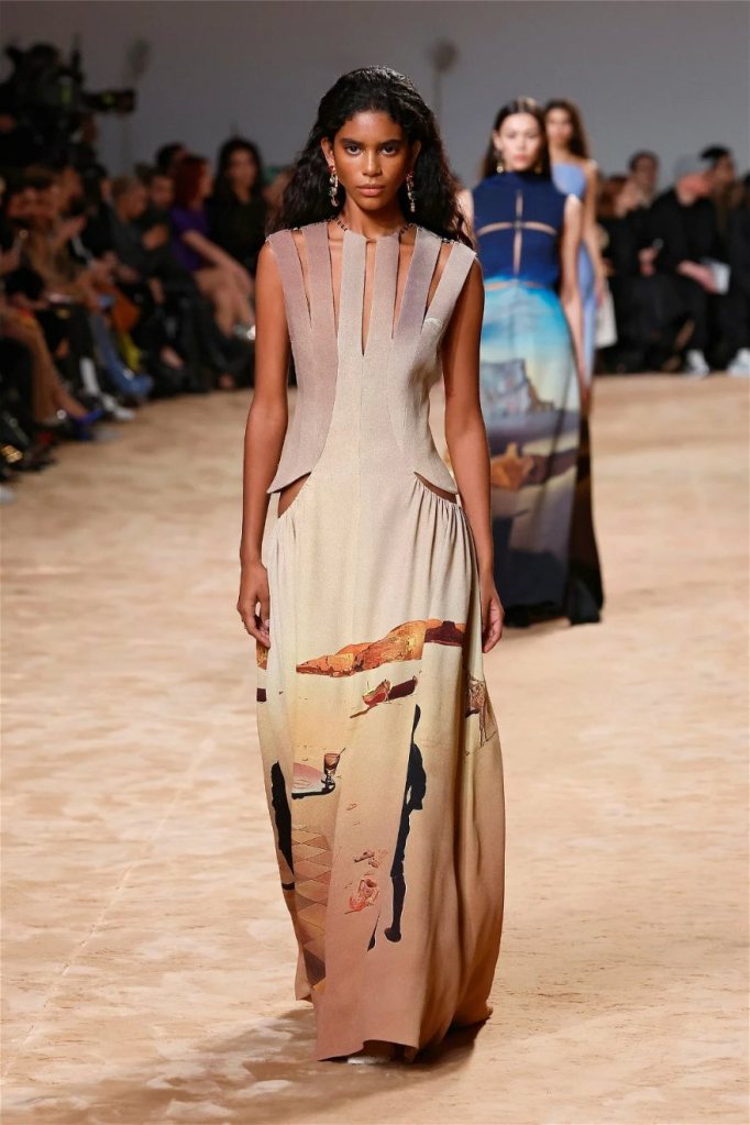 Honoring the late Paco Rabanne, who passed away in February 2023, Dossena masterfully crafts a lineup that echoes Rabanne’s visionary futurism. The collection delves into the exploration of unconventional fabrics and textures, paying homage to the space-age aesthetic of the ’60s. Noteworthy is the incorporation of Salvador Dalí’s paintings on gowns, infusing a touch of retro surrealism into the modern narrative.
