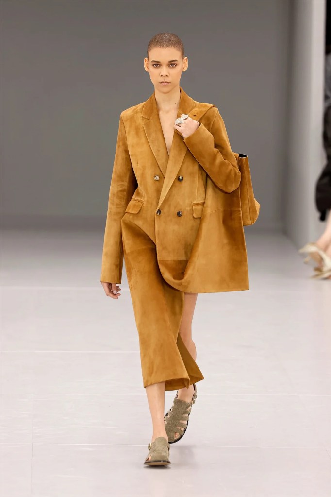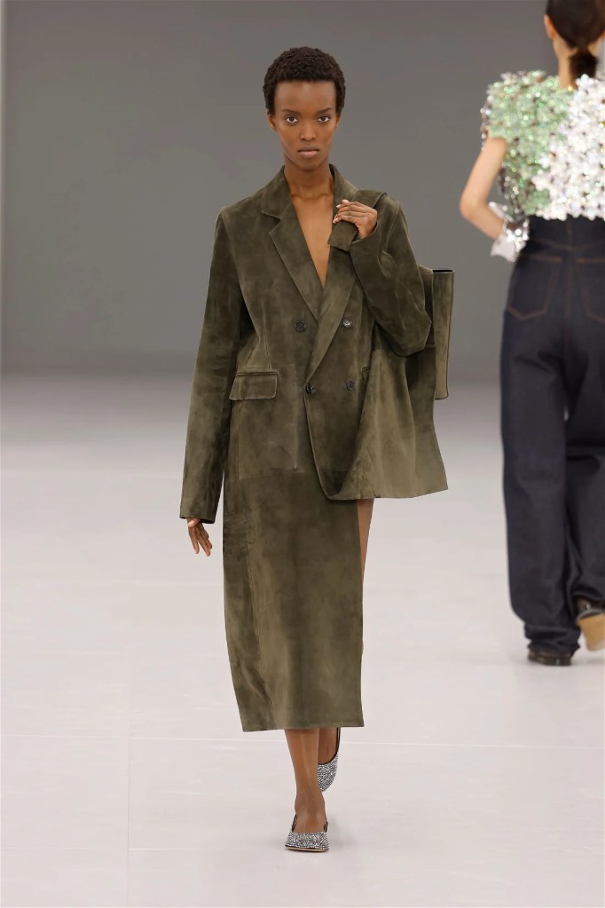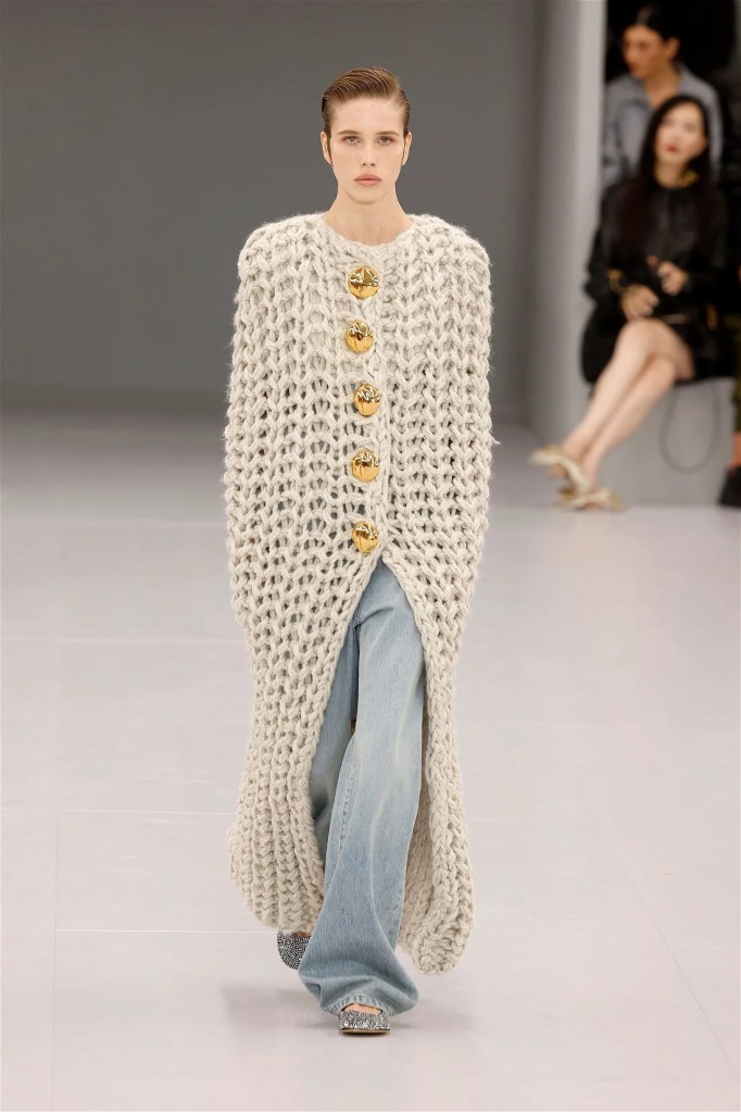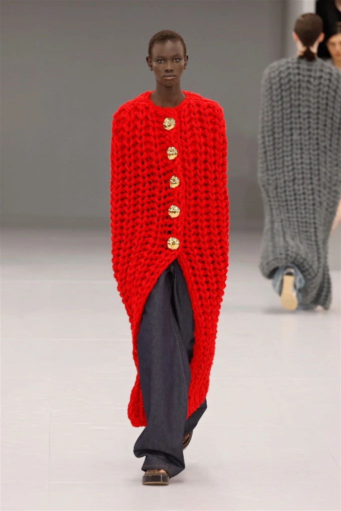 The collection was all about transformation. Leather car coats seamlessly morphed into handbags, while oversized knitwear sported contrasting lapels that hinted at hidden layers. Tailored pencil skirts were given a punkish edge with metallic needle closures. Anderson’s masterful use of colour and texture was evident throughout. Richly hued leathers mingled with delicate fringe dresses, and chunky knits played off against fluid silks. A collaboration with artist Lynda Benglis added a touch of sculptural intrigue. Benglis’s bronze forms adorned the runway, while her organic shapes inspired a line of statement jewellery.