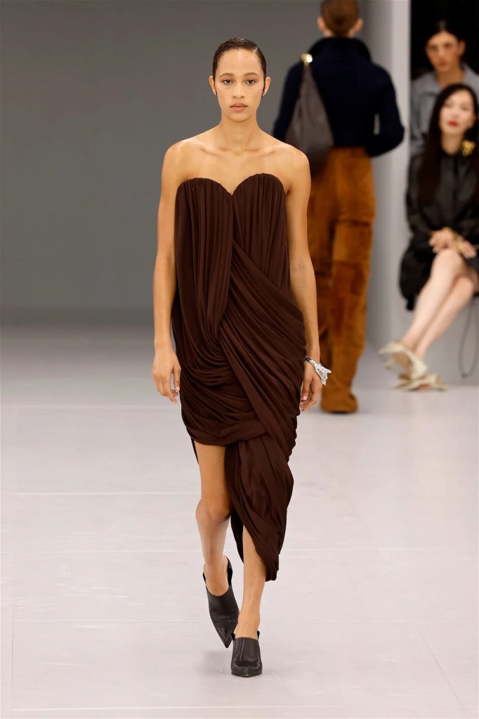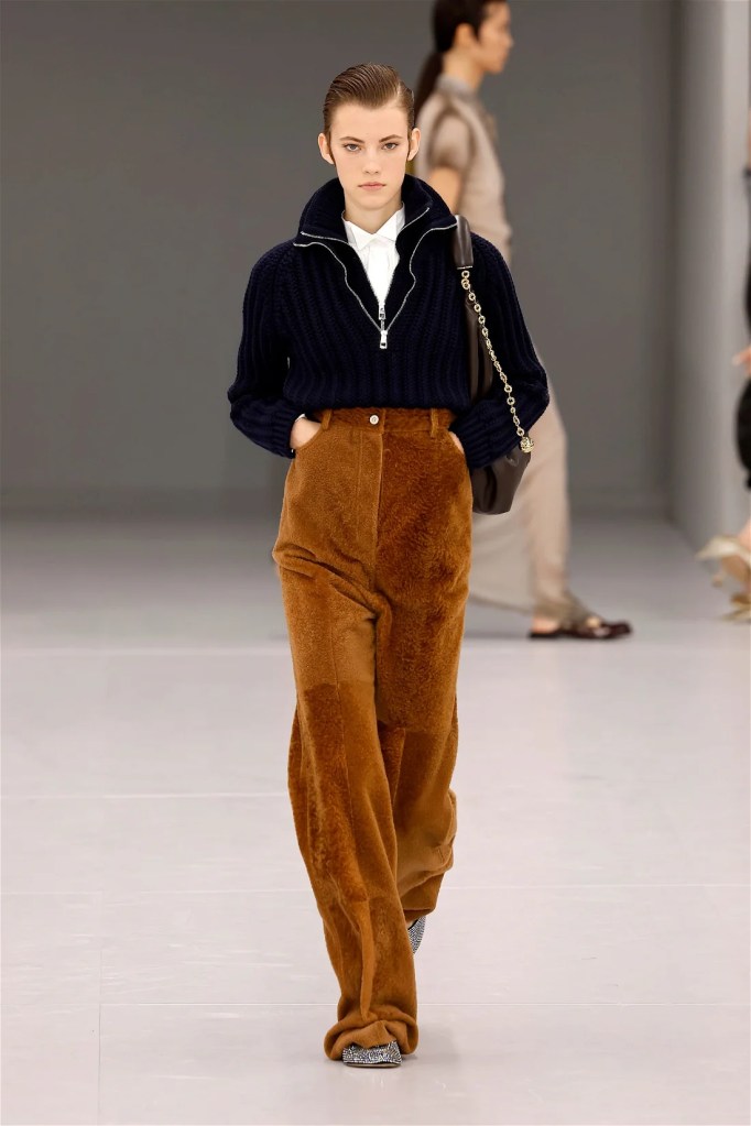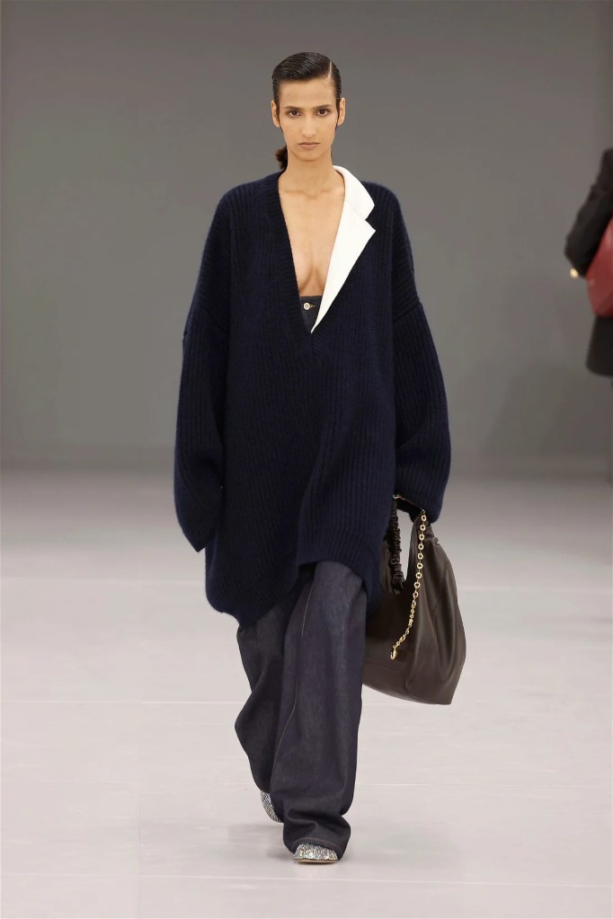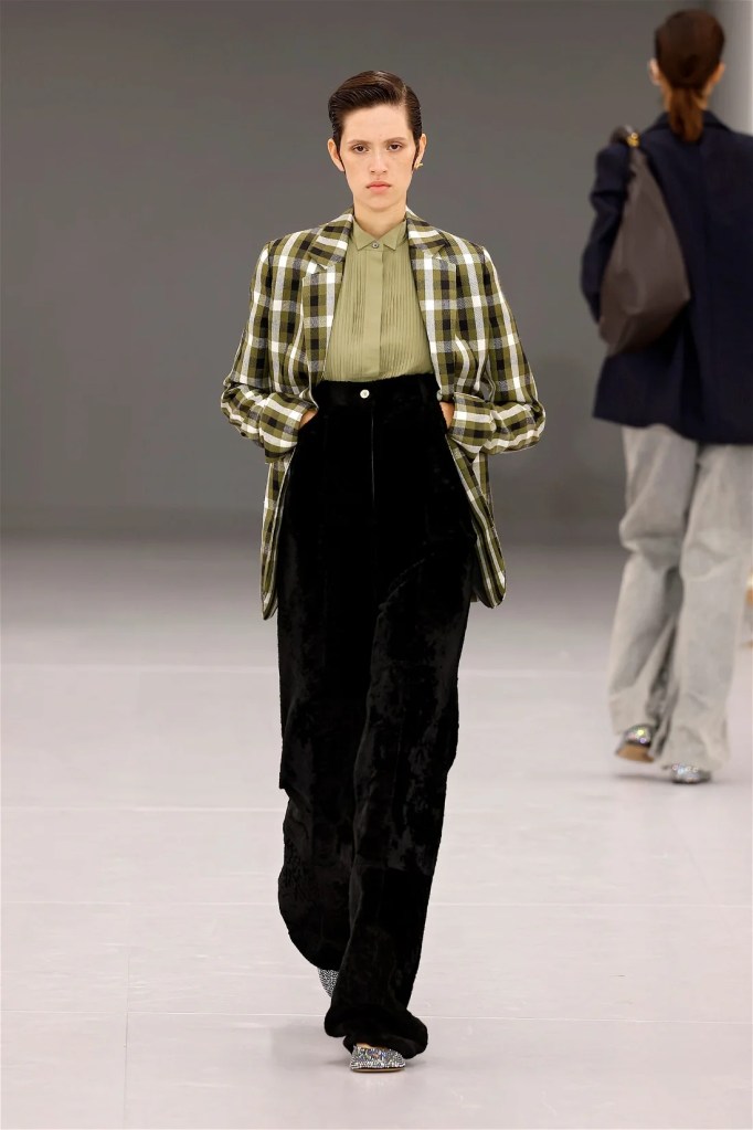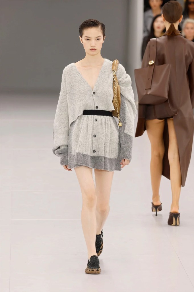The collection was all about transformation. Leather car coats seamlessly morphed into handbags, while oversized knitwear sported contrasting lapels that hinted at hidden layers. Tailored pencil skirts were given a punkish edge with metallic needle closures. Anderson’s masterful use of colour and texture was evident throughout. Richly hued leathers mingled with delicate fringe dresses, and chunky knits played off against fluid silks. A collaboration with artist Lynda Benglis added a touch of sculptural intrigue. Benglis’s bronze forms adorned the runway, while her organic shapes inspired a line of statement jewellery.
