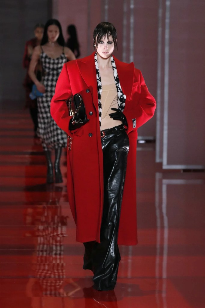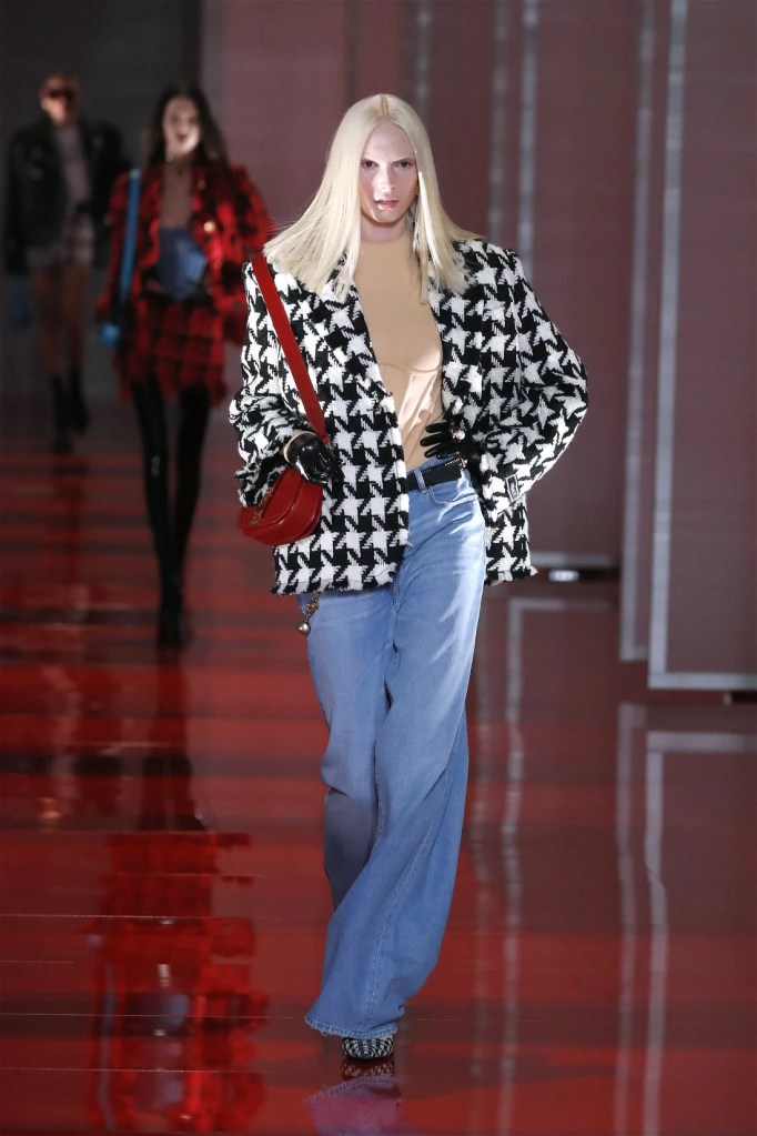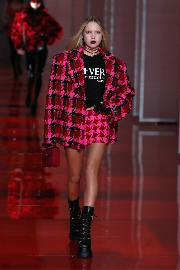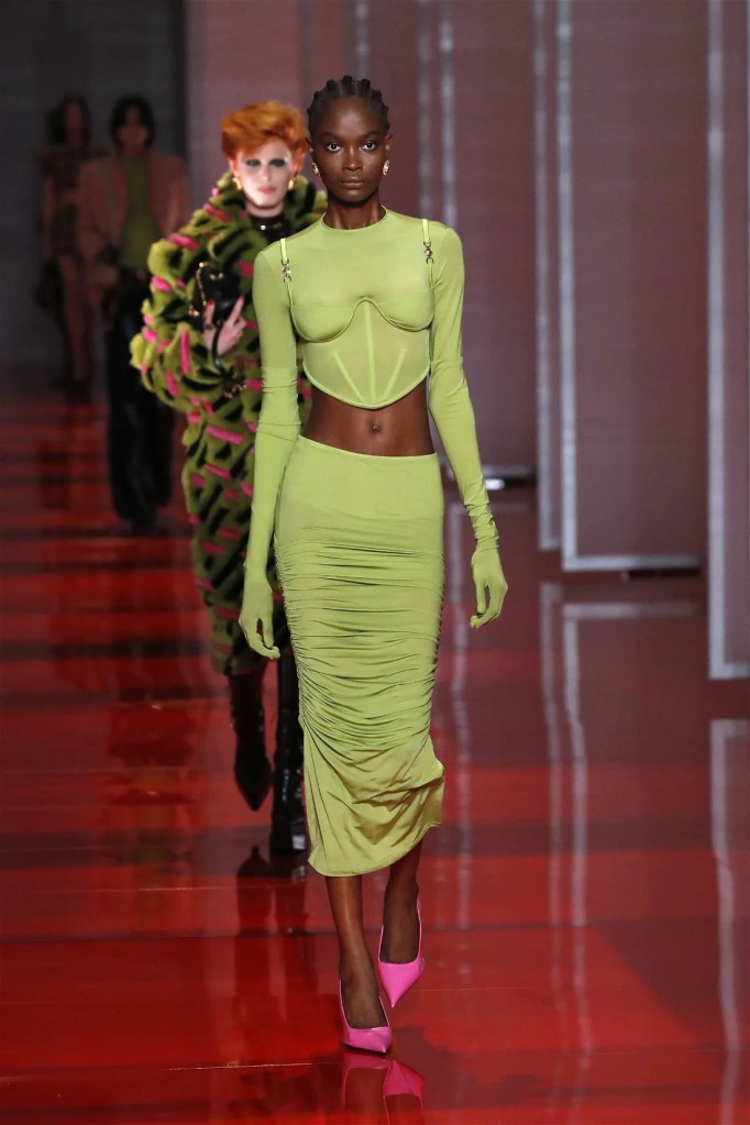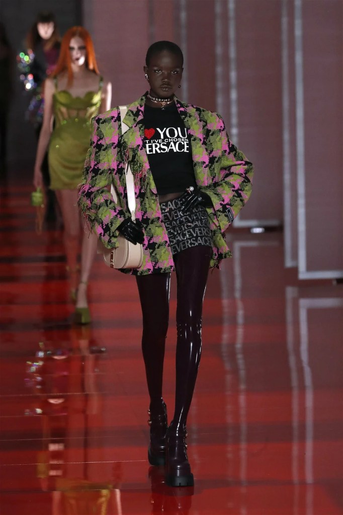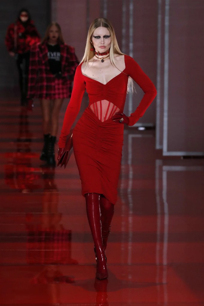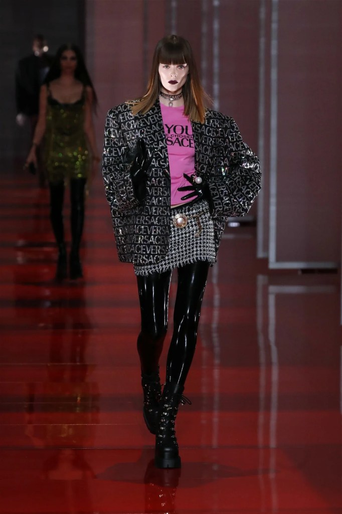 The overall vibe is sleek and sexy, featuring corsets, satin dresses, and latex tights that add an element of allure. Bodycon dresses with daring cutouts, miniskirts paired with over-the-knee boots, and leather jackets casually slung over slinky slip dresses create a bold and contemporary aesthetic. The inclusion of tweed blazers, platform heels, and pearls adds a touch of sophistication. Versace plays with a mix of textures and materials, combining satin and leather with wool and knitwear.