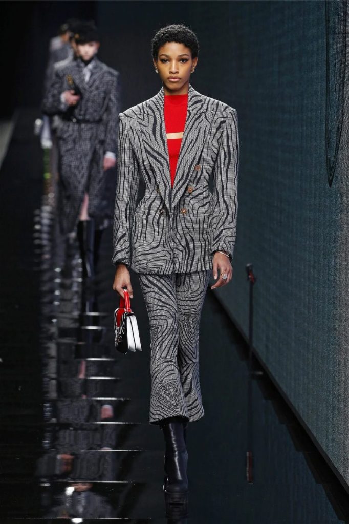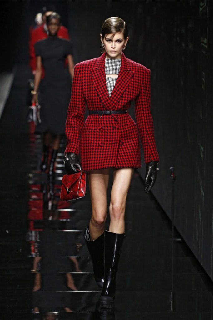 The incorporation of loud prints, metal mesh, and vibrant eveningwear adds a party-ready pizzazz. A well-balanced pop of colour, graphic lines, and accented shoulders enhance the collection’s visual impact. Short sculptural dresses provide some much-needed edge. Noteworthy are the updated versions of the 1990s power blazers, featuring statement prints, clashing colour palettes, and lavish gold embellishments. The half-decent looks were a neon pink pinstripe suit and a silver-metallic cocktail dress worn by Kendall Jenner.