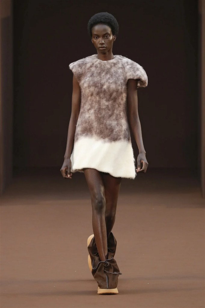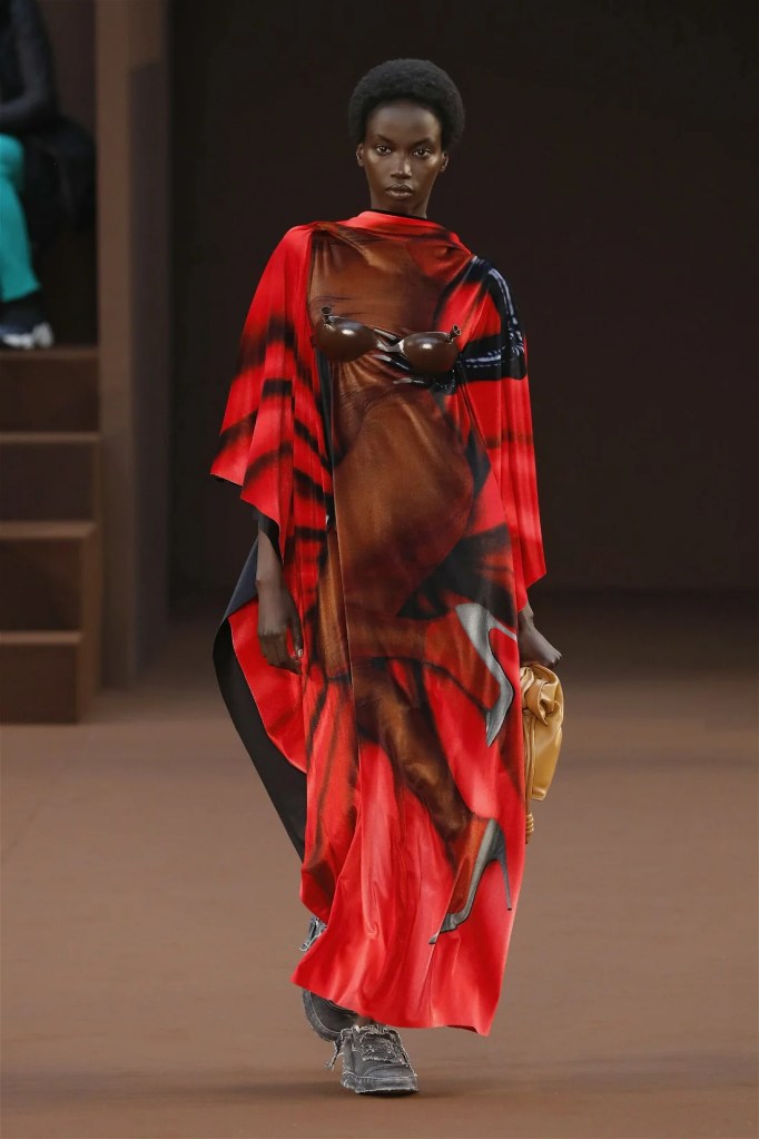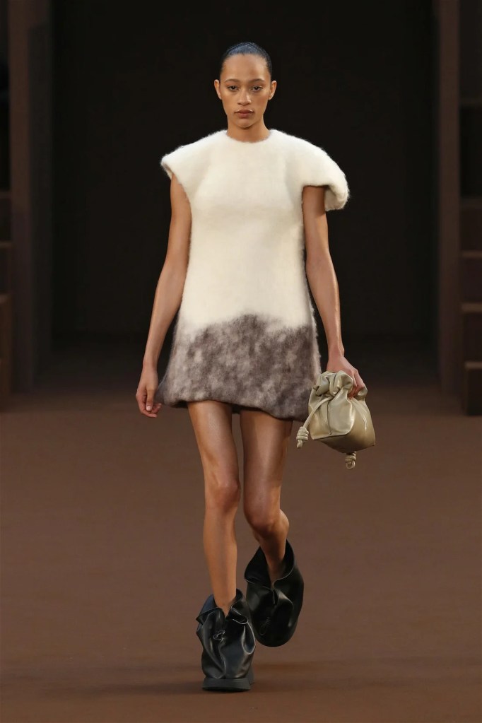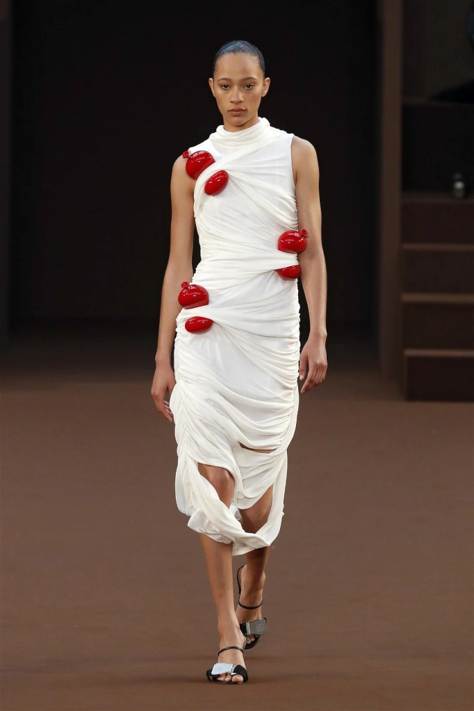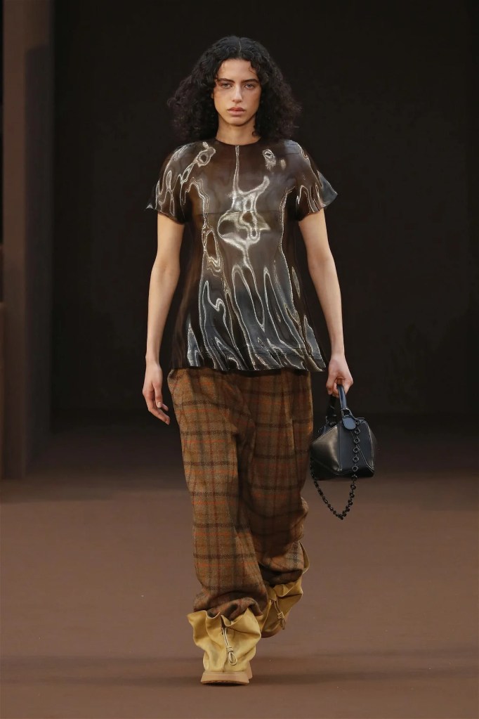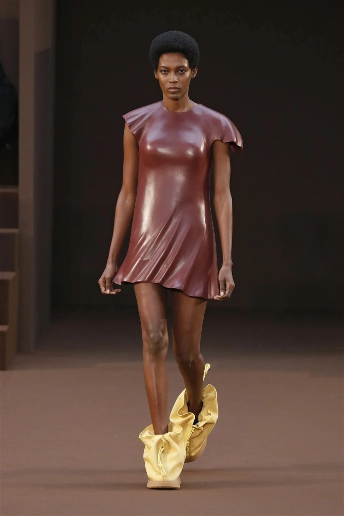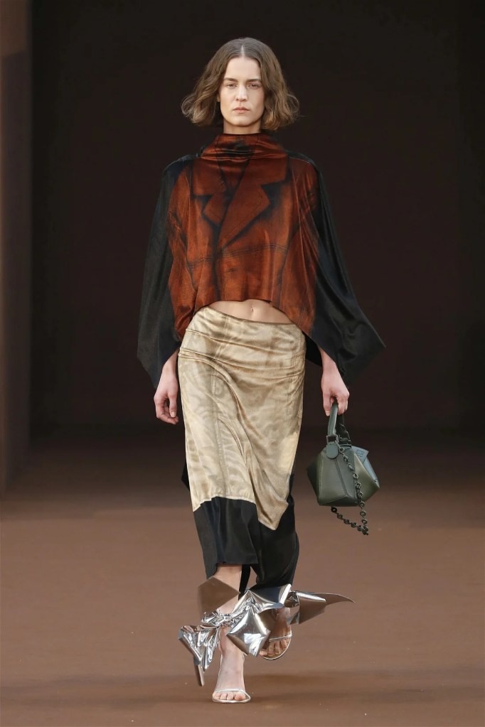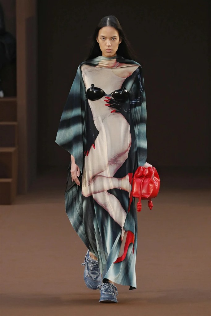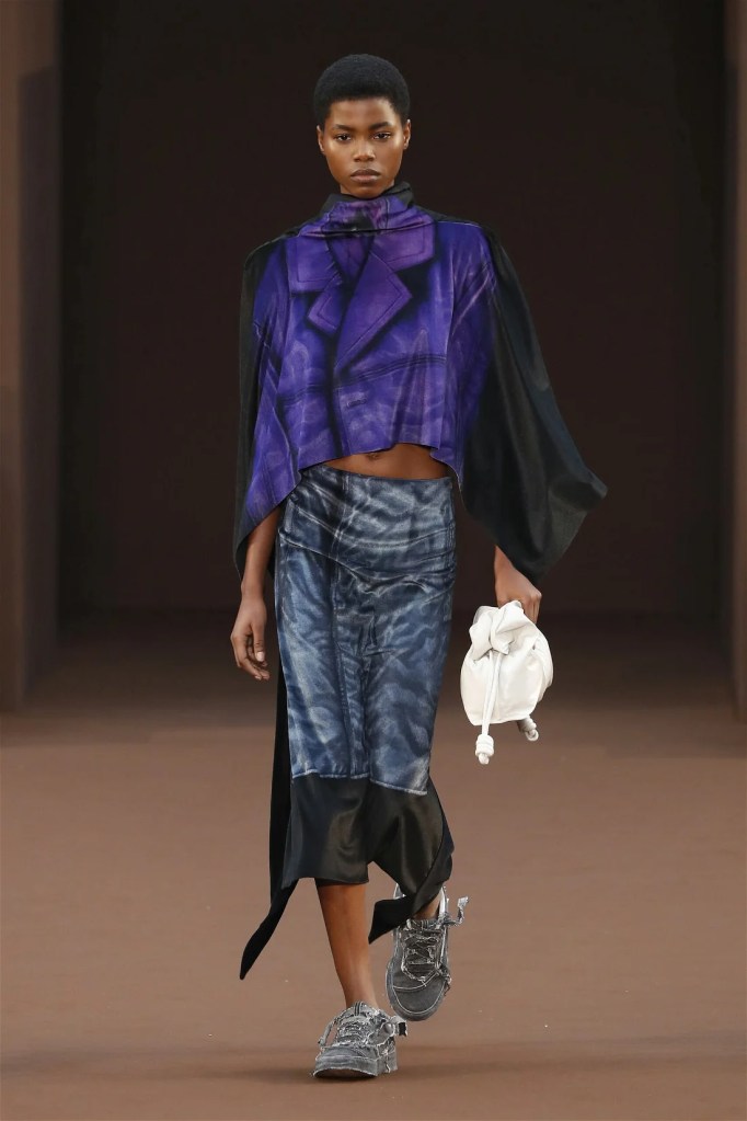 Leathery T-shirts and raw-edged shorts juxtaposed against intricate fringed dresses challenged expectations. Anderson’s signature trompe l’oeil tricks continued, with sweaters mimicking paint splatters and skirts resembling crumpled paper. Shoes and bags mirrored the collection’s boldness, featuring outlandish shapes and materials. The surrealism is amusing and the experimentation, brilliant!