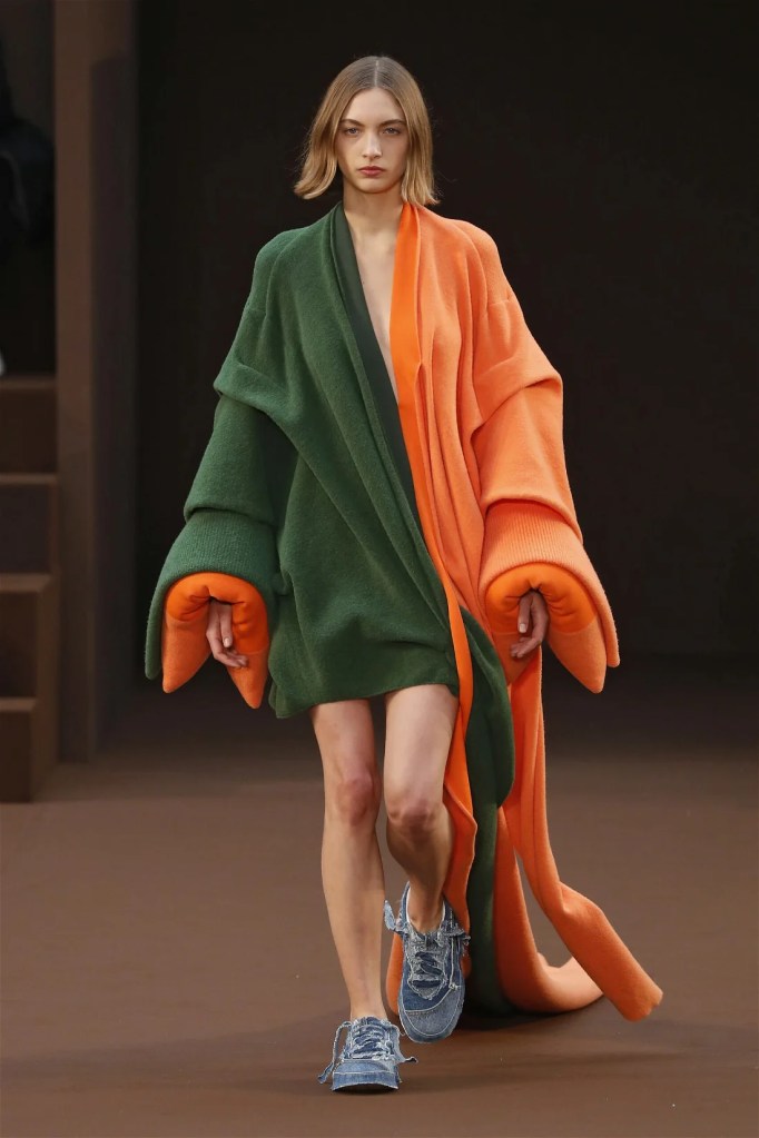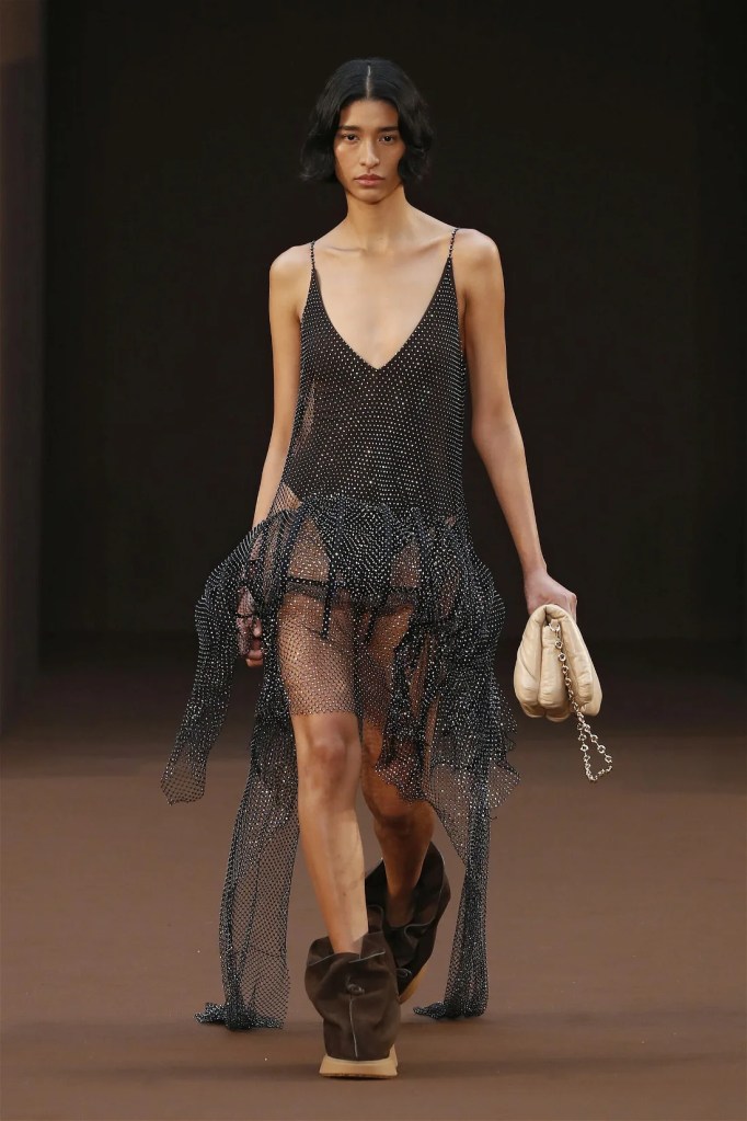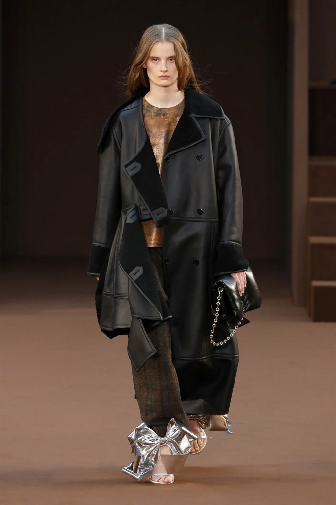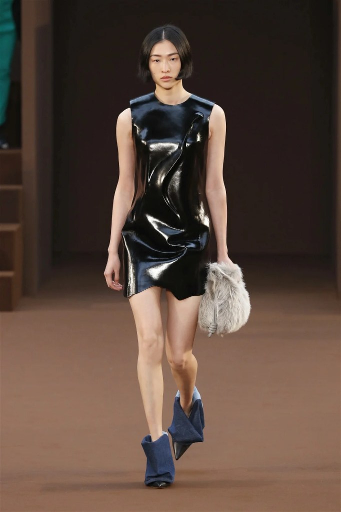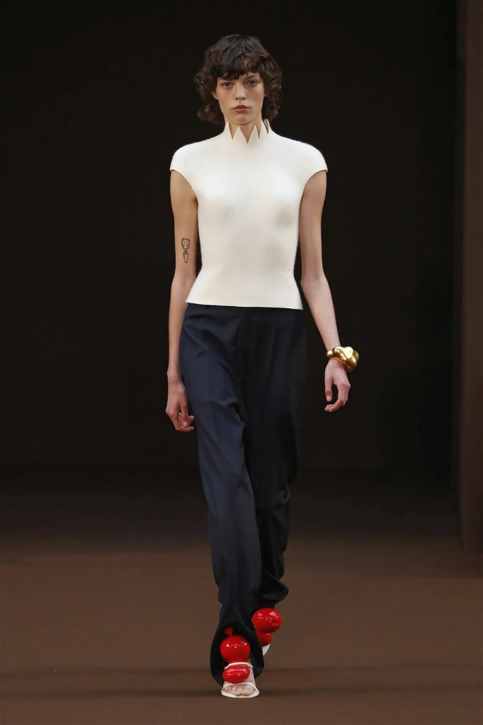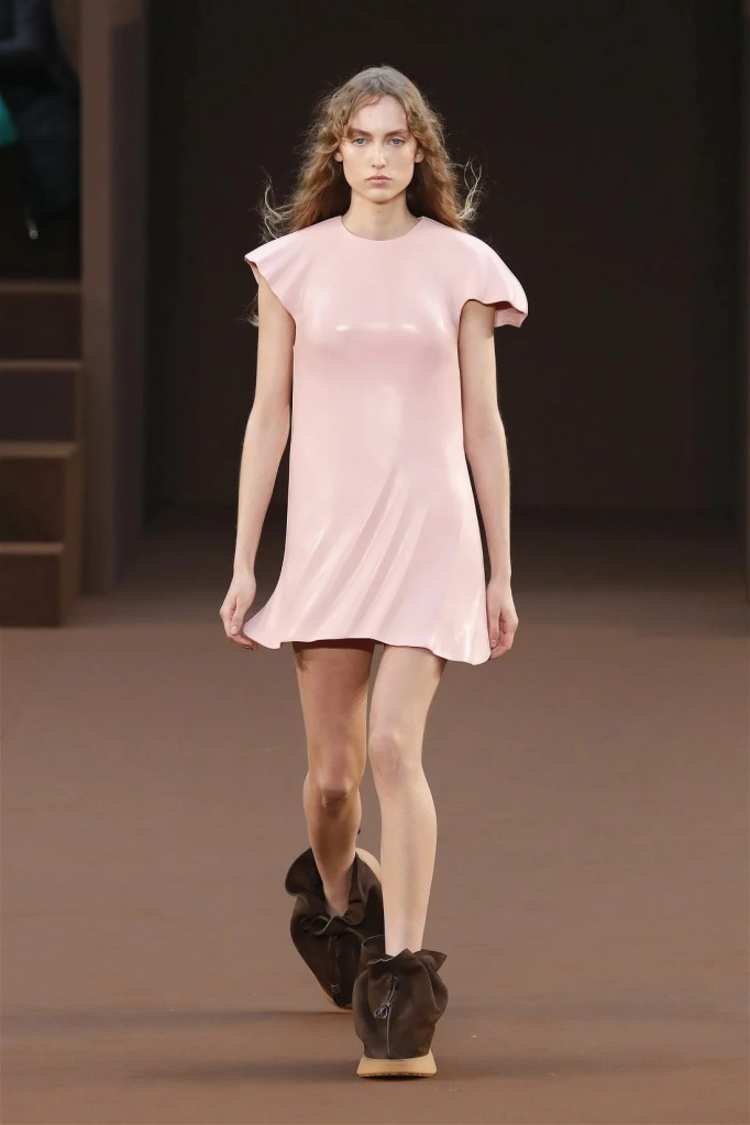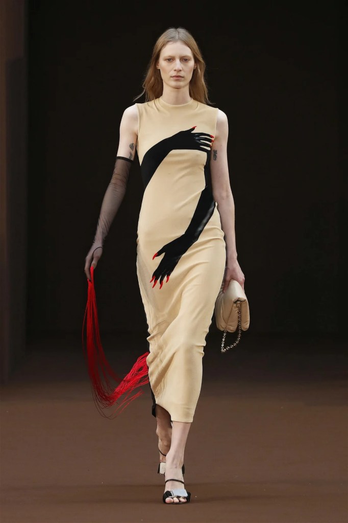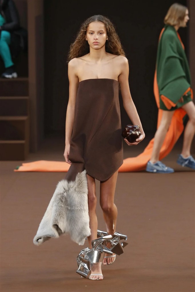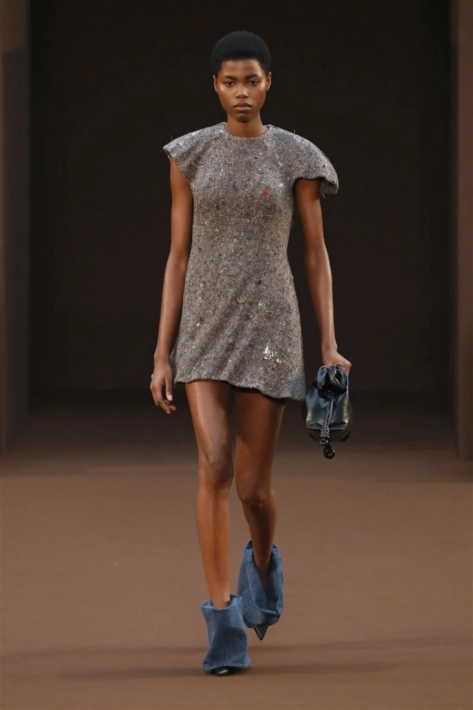 Leathery T-shirts and raw-edged shorts juxtaposed against intricate fringed dresses challenged expectations. Anderson’s signature trompe l’oeil tricks continued, with sweaters mimicking paint splatters and skirts resembling crumpled paper. Shoes and bags mirrored the collection’s boldness, featuring outlandish shapes and materials. The surrealism is amusing and the experimentation, brilliant!