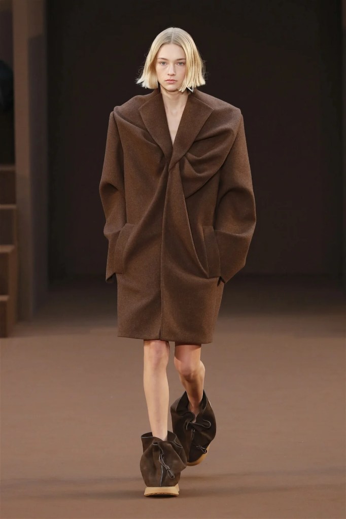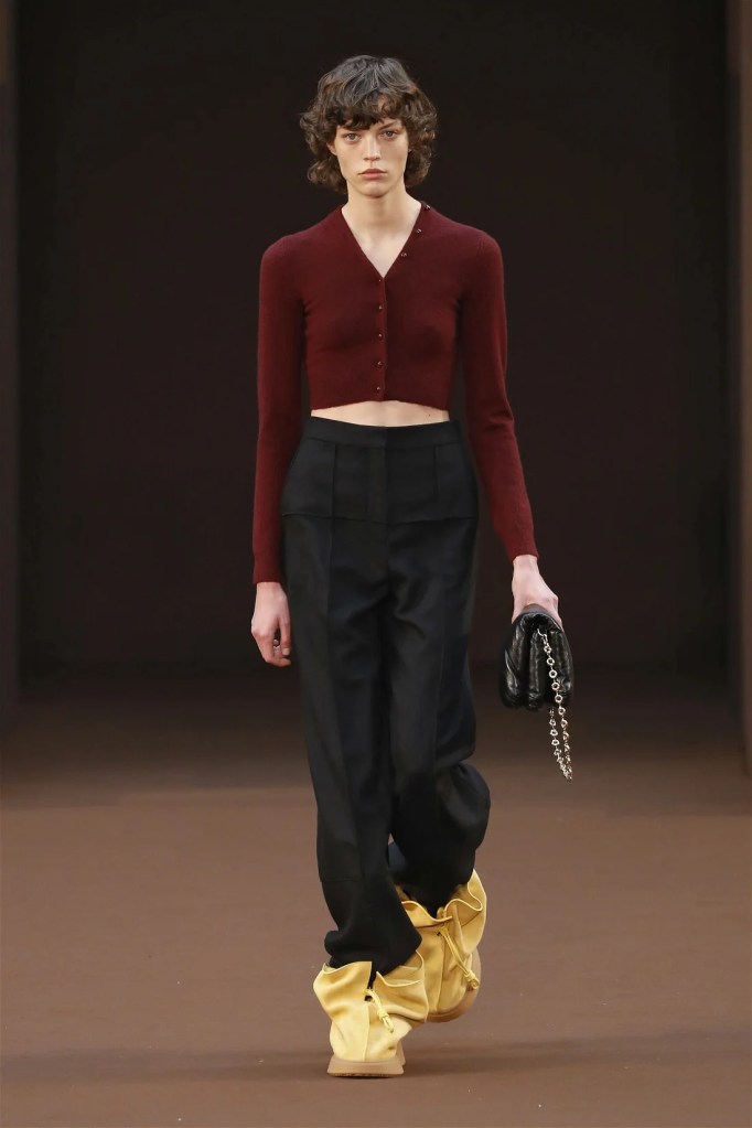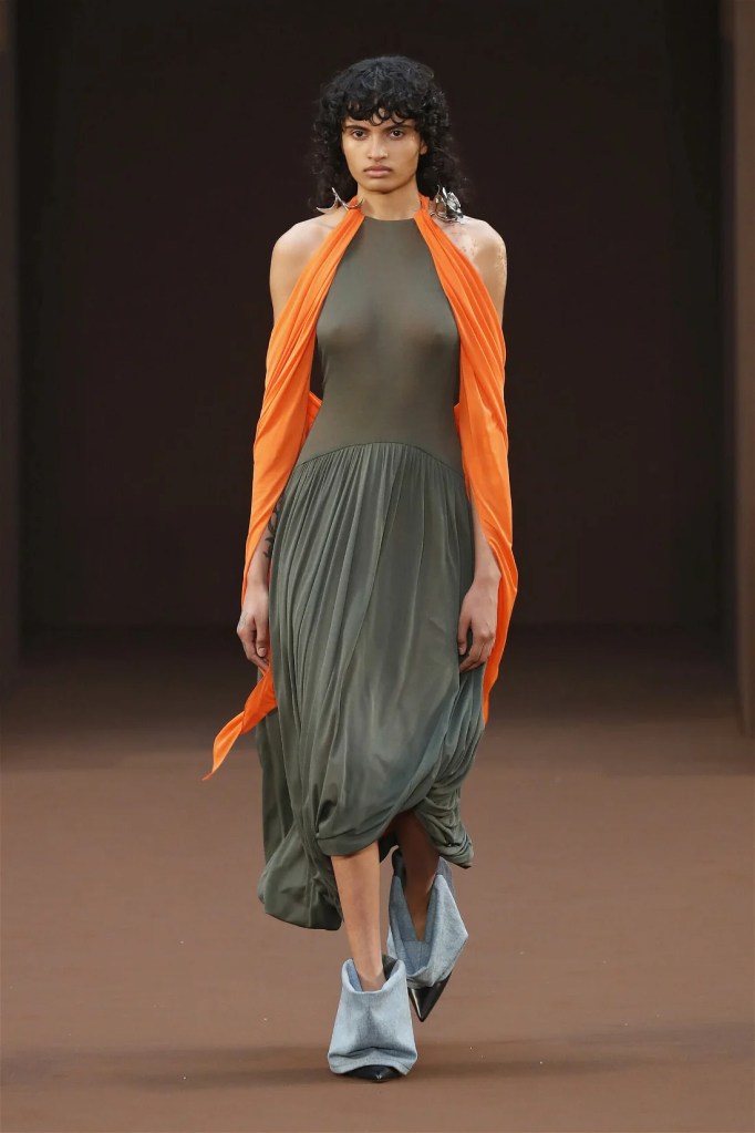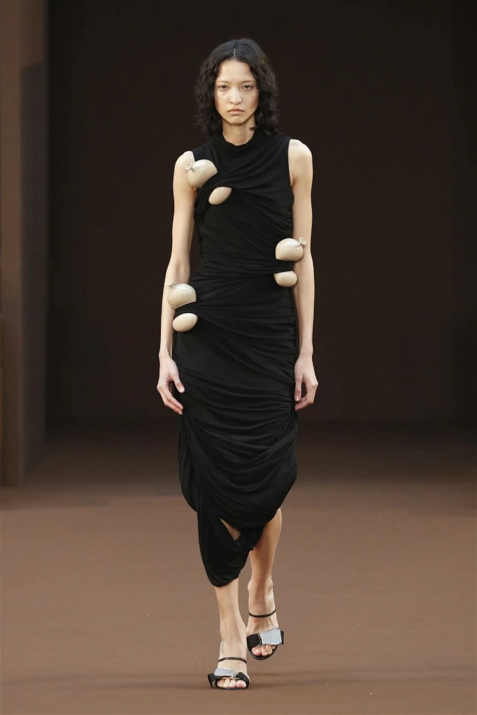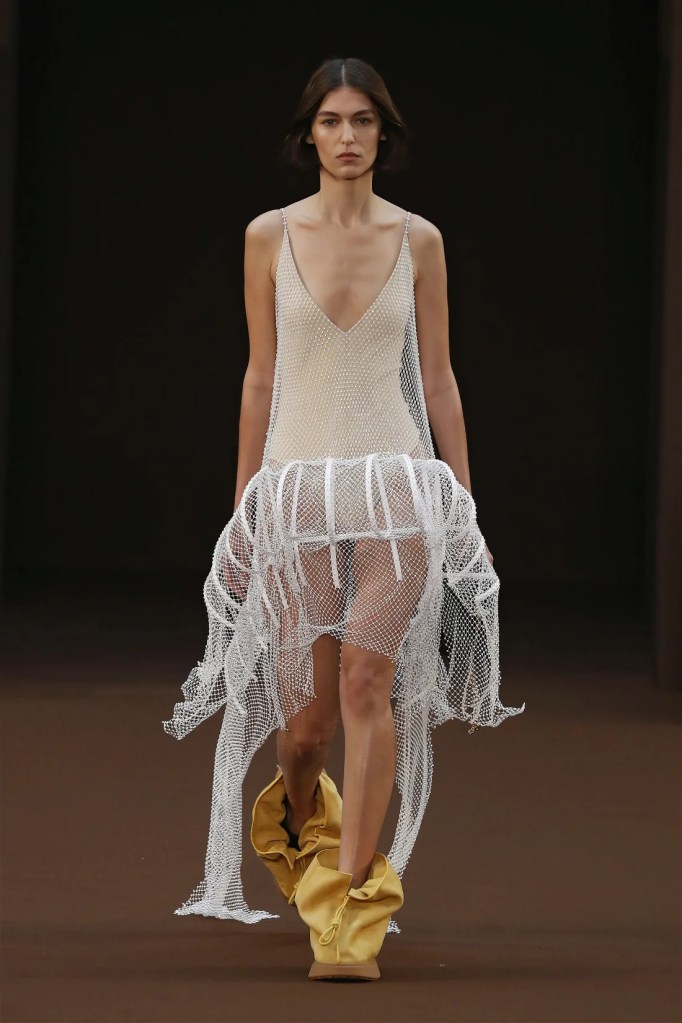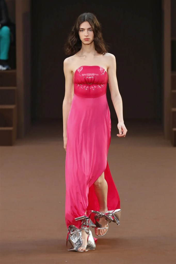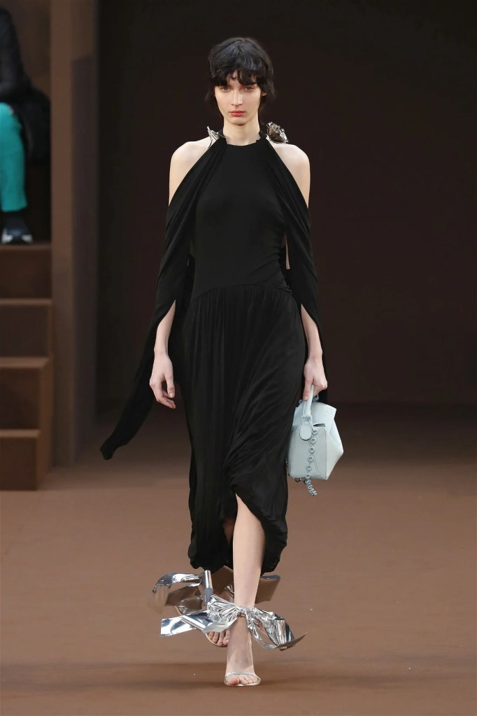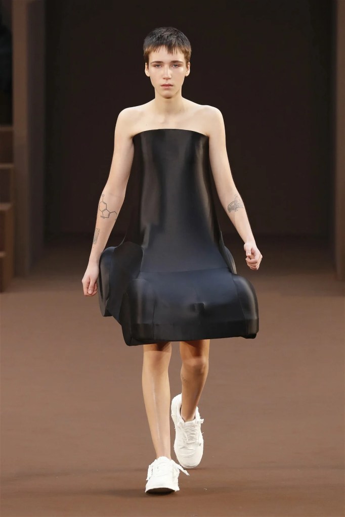 Leathery T-shirts and raw-edged shorts juxtaposed against intricate fringed dresses challenged expectations. Anderson’s signature trompe l’oeil tricks continued, with sweaters mimicking paint splatters and skirts resembling crumpled paper. Shoes and bags mirrored the collection’s boldness, featuring outlandish shapes and materials. The surrealism is amusing and the experimentation, brilliant!