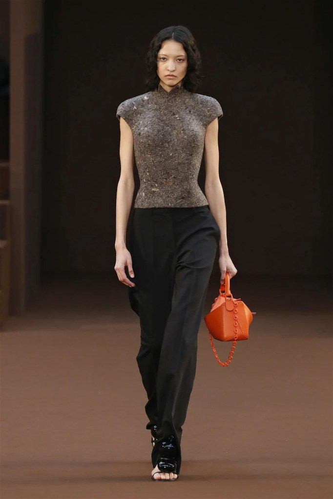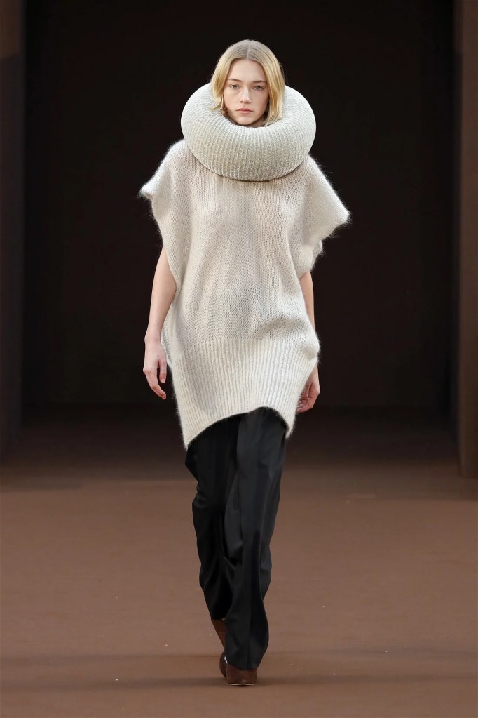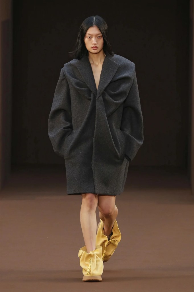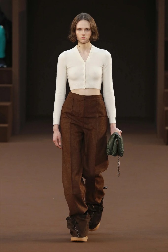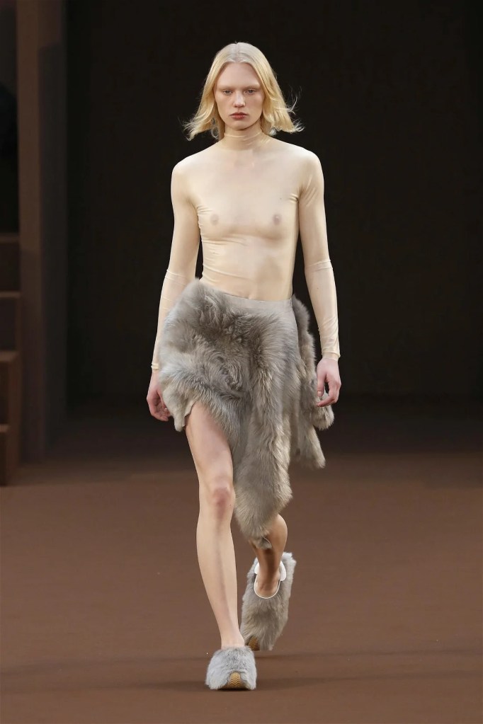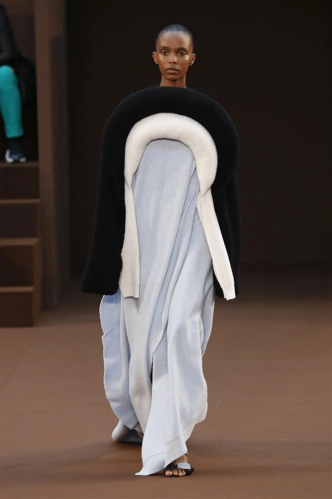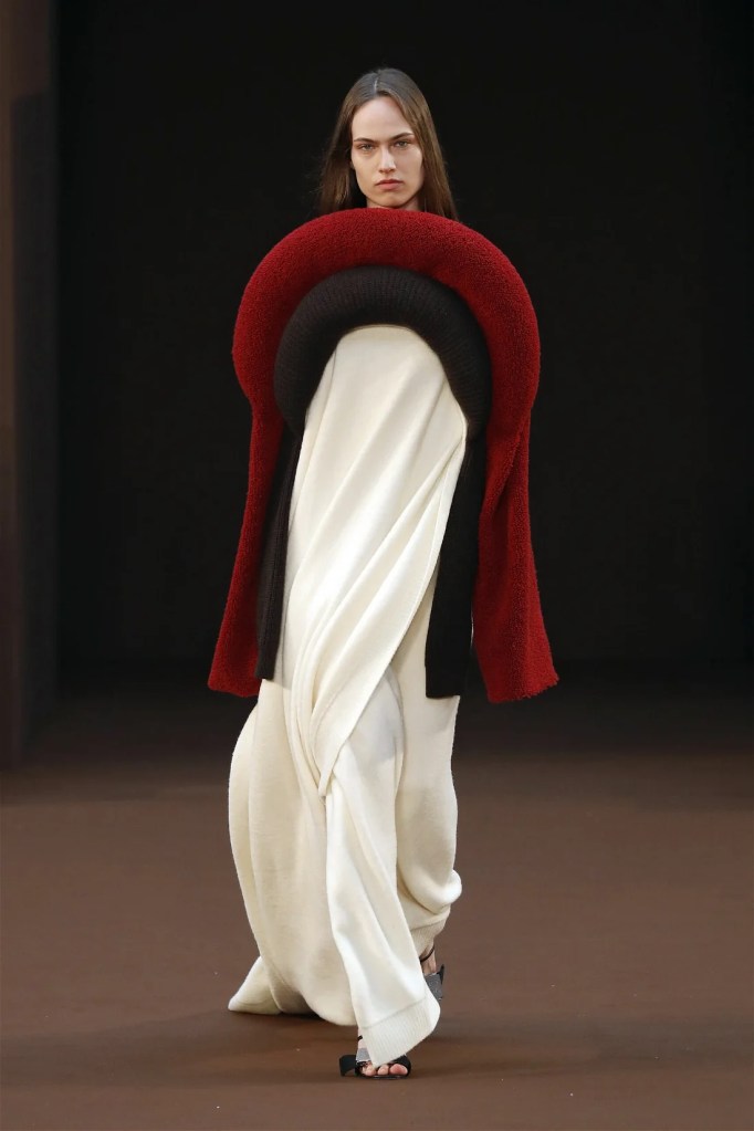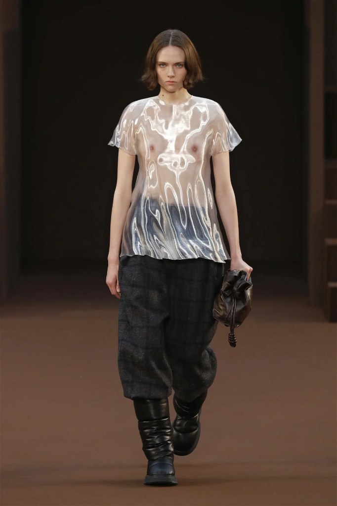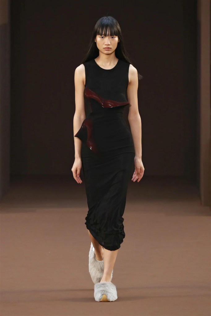 Leathery T-shirts and raw-edged shorts juxtaposed against intricate fringed dresses challenged expectations. Anderson’s signature trompe l’oeil tricks continued, with sweaters mimicking paint splatters and skirts resembling crumpled paper. Shoes and bags mirrored the collection’s boldness, featuring outlandish shapes and materials. The surrealism is amusing and the experimentation, brilliant!