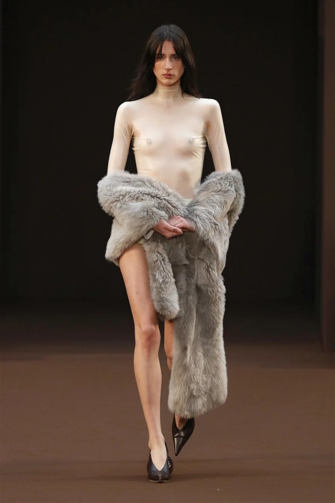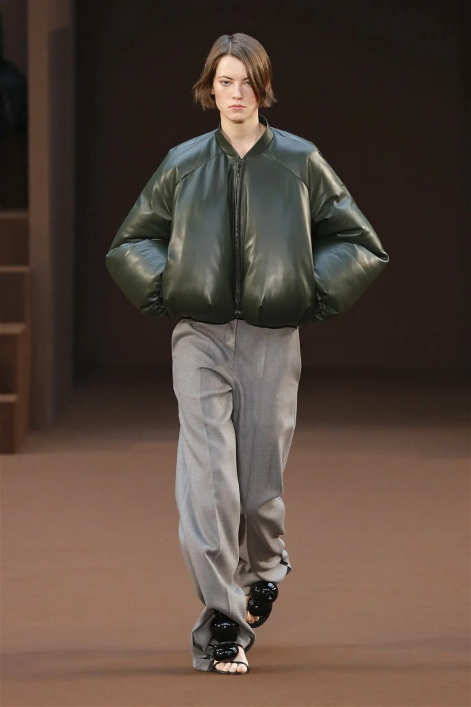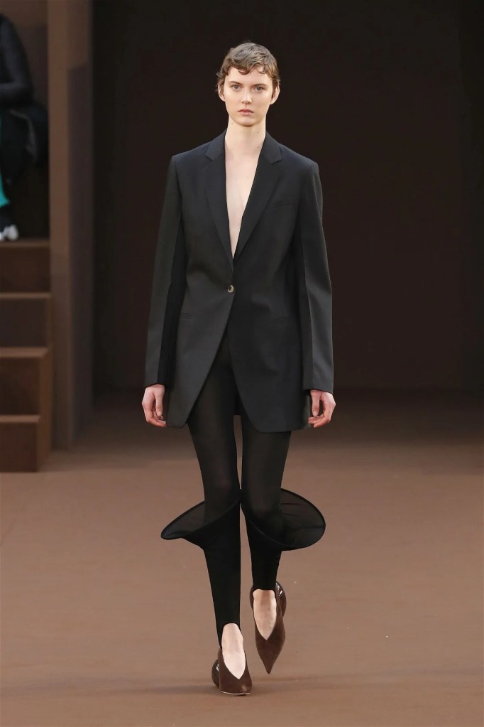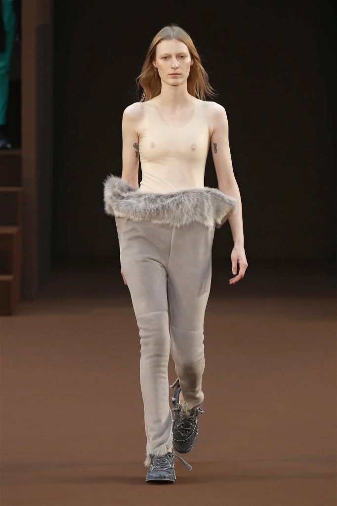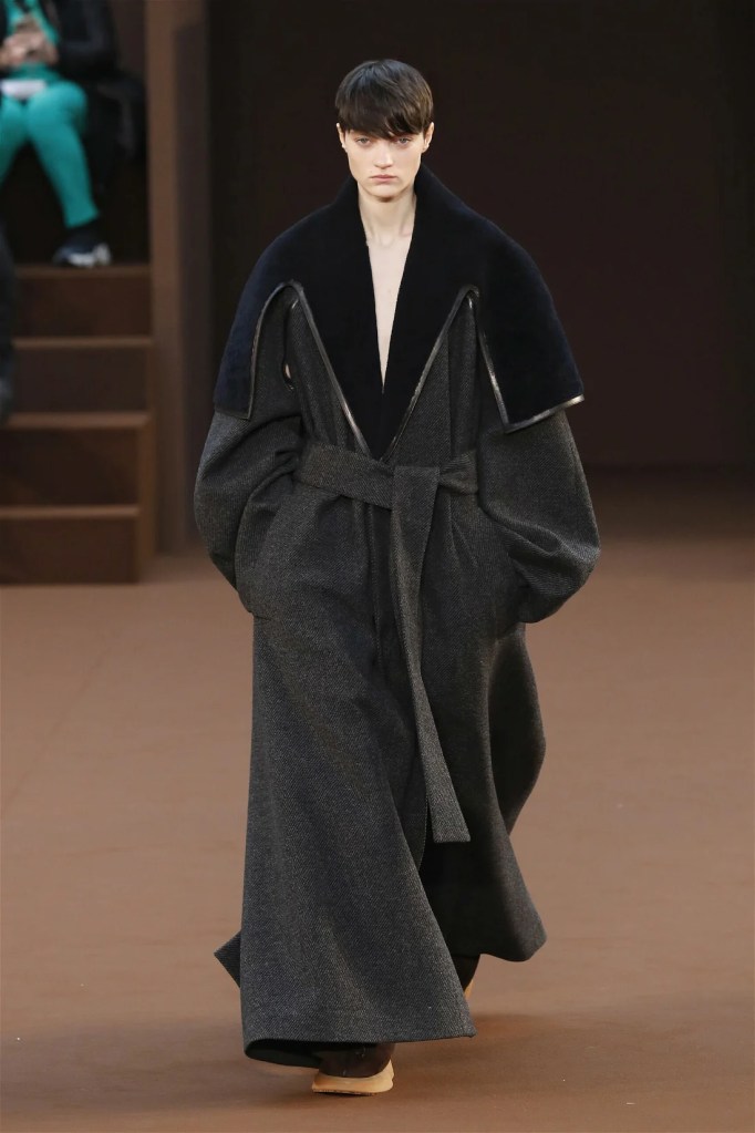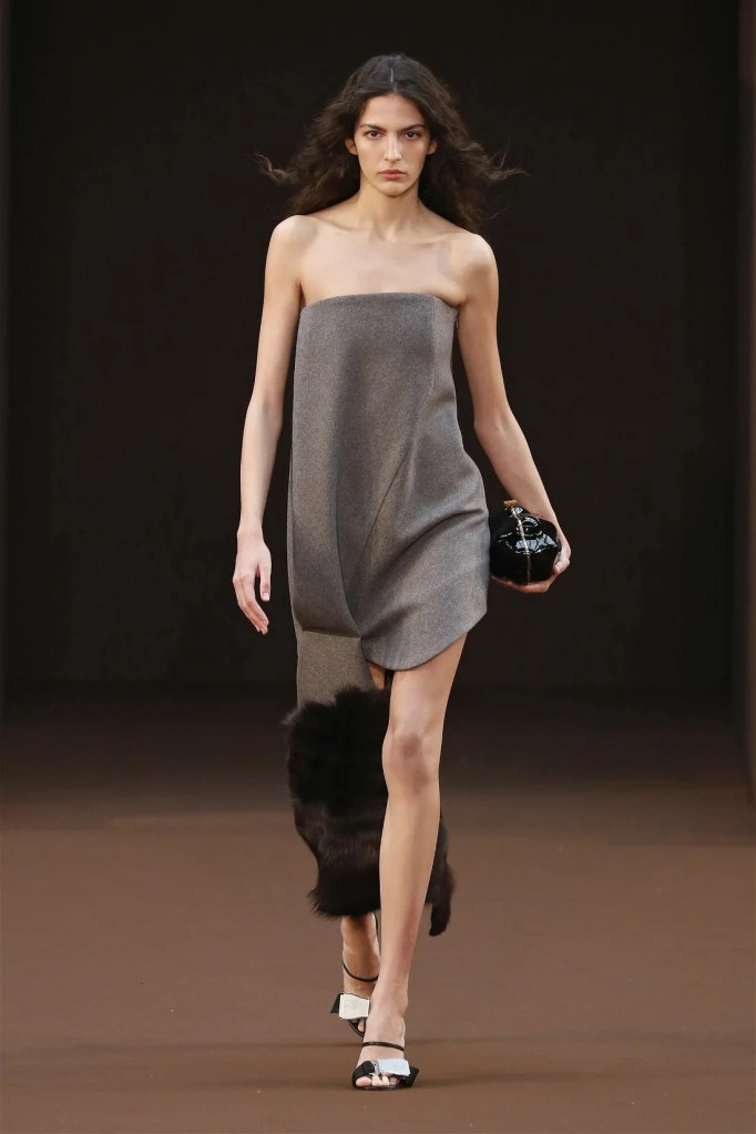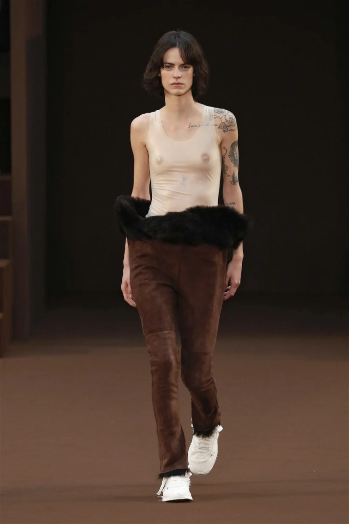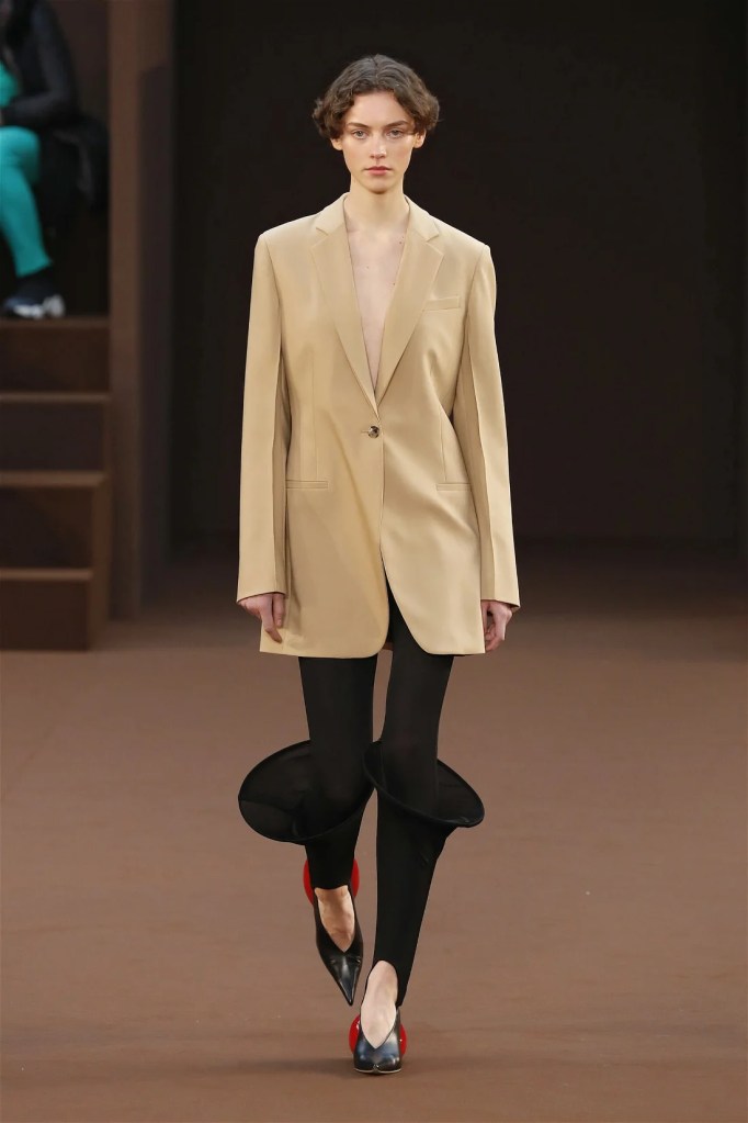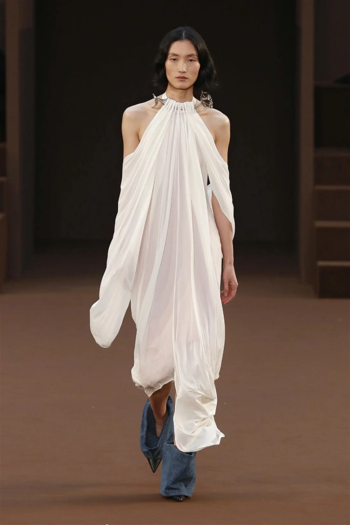 Leathery T-shirts and raw-edged shorts juxtaposed against intricate fringed dresses challenged expectations. Anderson’s signature trompe l’oeil tricks continued, with sweaters mimicking paint splatters and skirts resembling crumpled paper. Shoes and bags mirrored the collection’s boldness, featuring outlandish shapes and materials. The surrealism is amusing and the experimentation, brilliant!