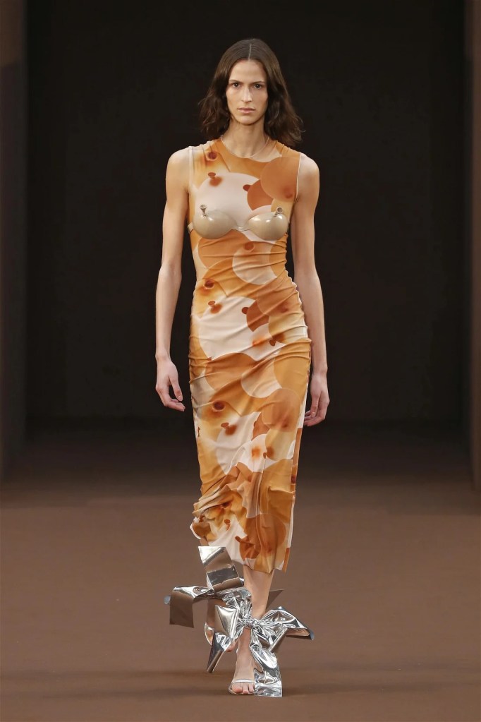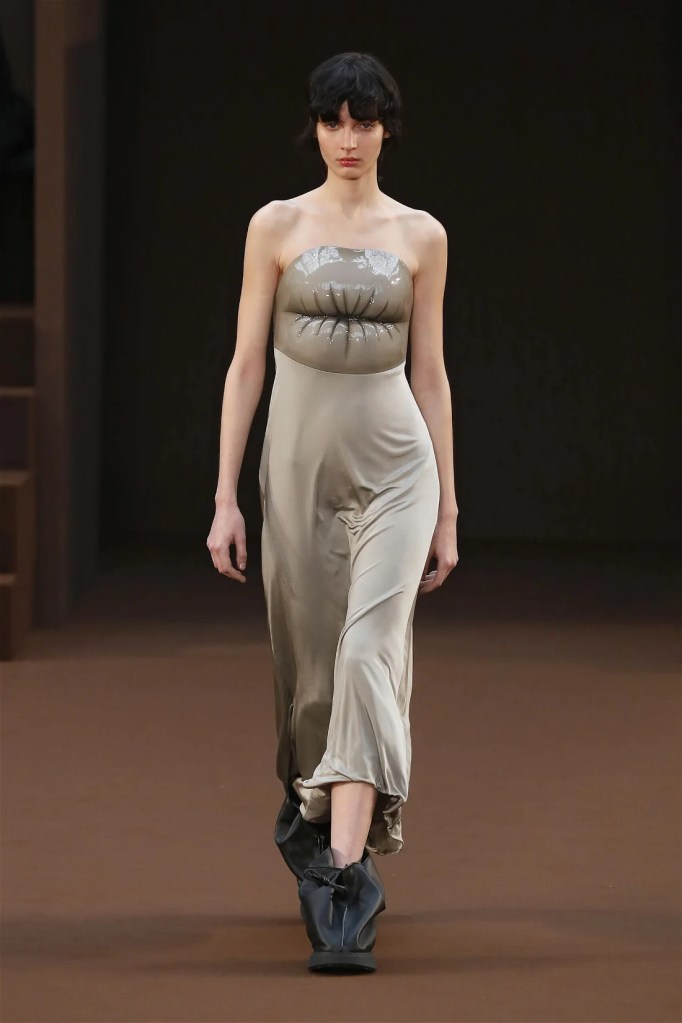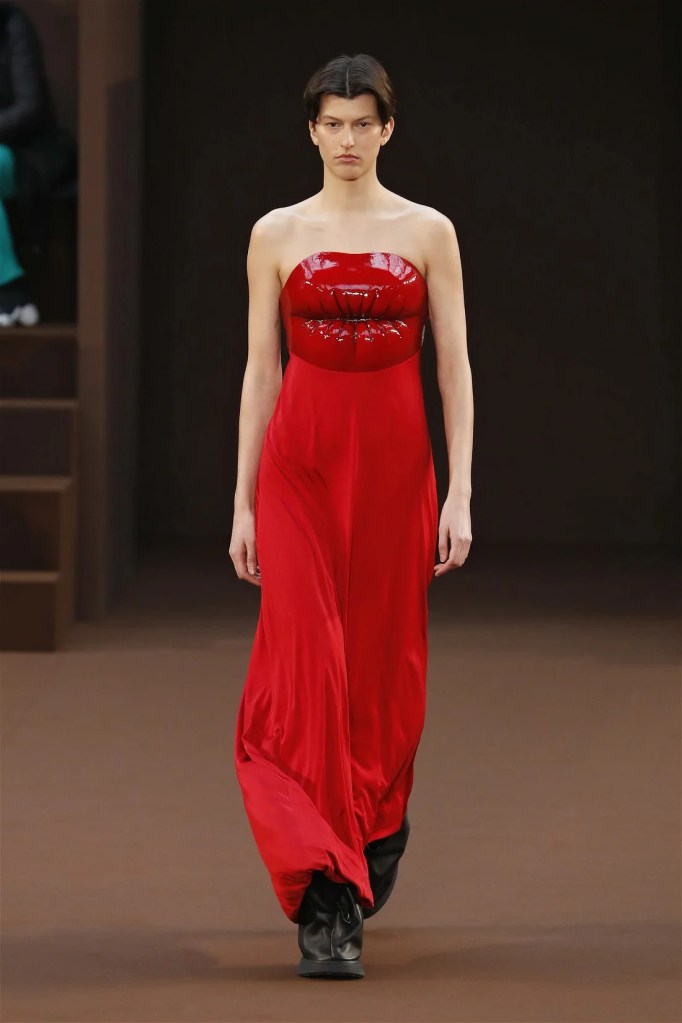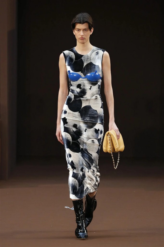 Boring is a word that I think I would never use to describe Loewe, especially with Jonathan Anderson at the helm. Loewe makes us laugh and makes us wonder. Call it absurdity but it’s fashion at a level we haven’t fully comprehended yet. Balloon boobs, silver bowed heels, high heels inside dresses, car-shaped hemlines and lip-shaped bust lines; if this sounds weird then you must see the clothes.
