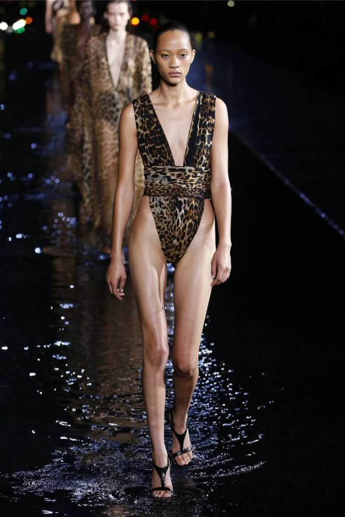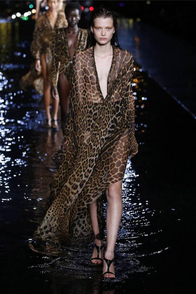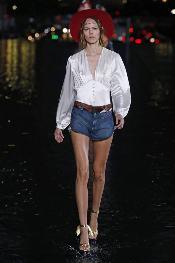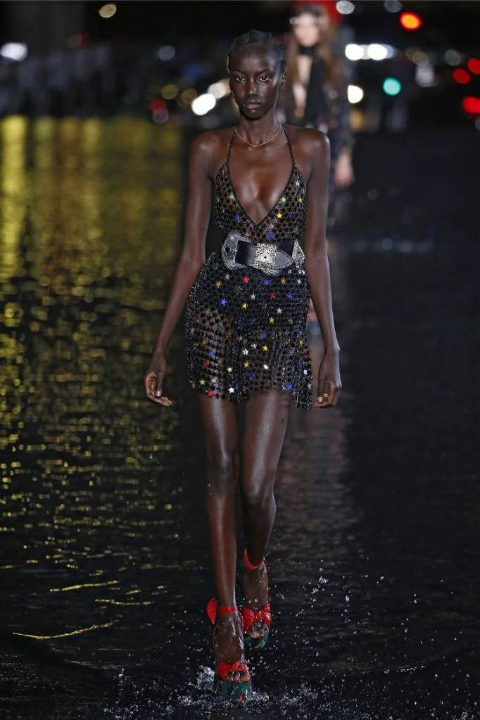 The Saint Laurent collection draws inspiration from the 1978 Opium fragrance launch party, seamlessly blending the brand’s signature rocker-chic aesthetic with subtle medieval references. Sharp tailoring and bold silhouettes dominate the runway, showcasing a diverse range of garments. The collection features a strong lineup of swimsuits, velvet blazers, sheer blouses, Le Smoking tuxedos, corset-waisted pants, and tiny dresses. While the pieces exude an undeniable allure, the sheer volume of 95 looks feels overwhelming, diluting the impact of individual pieces. Despite this, Saint Laurent maintains its reputation for pushing boundaries and delivering a fusion of timeless and sensual garments.