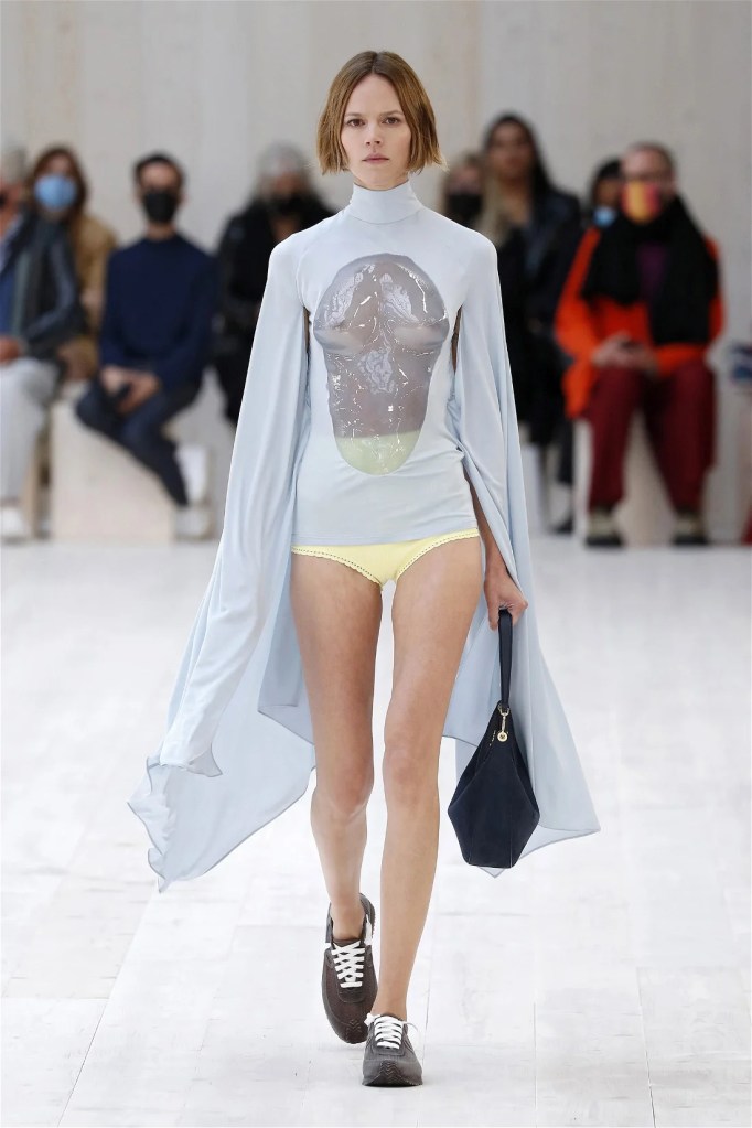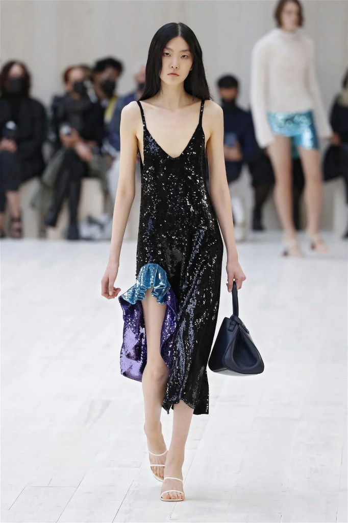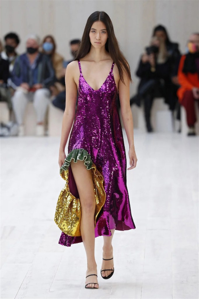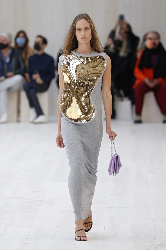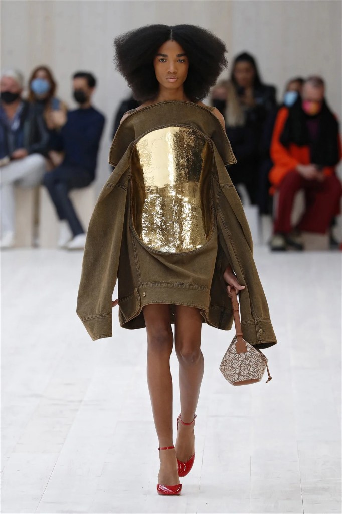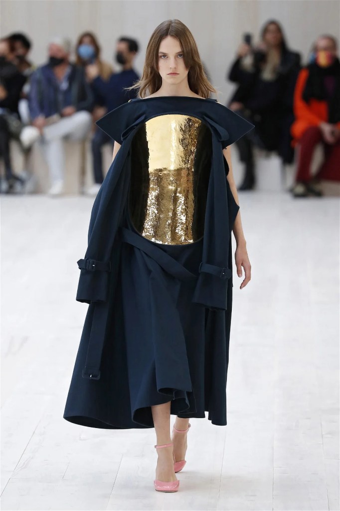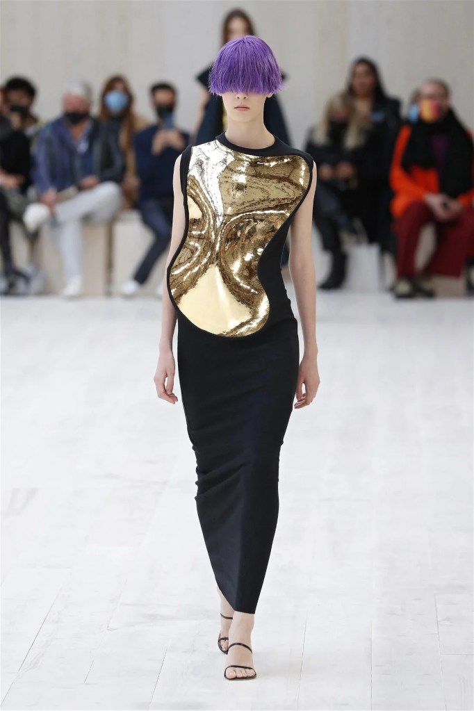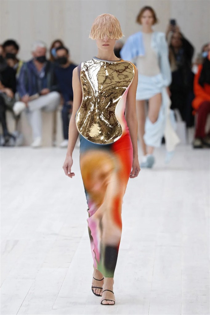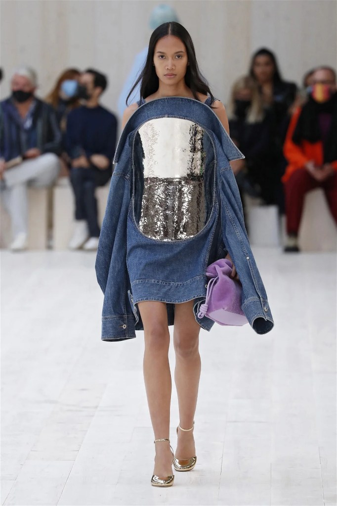 Well, Jonathan Anderson’s mind is fascinating, it is truly a godly experience for the eyes, brain and heart. Drenched in surrealism, irony, escapism, experimentation and as the brand called it “neurotic, psychedelic, completely hysterical.” The collection was all that and much more. The collection had so many highlights it’s hard to keep track of; trench coats worn backwards, dresses with sculptural shimmery metallic breastplates, denim dresses some reconstructed as backward dresses, sequined slit dresses with leg holes, dresses draped to perfection, Turtle-neck sheath maxis with clear resin breastplates.
