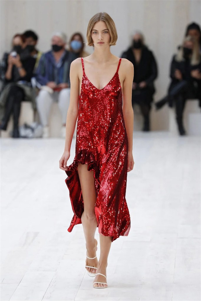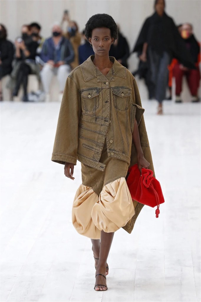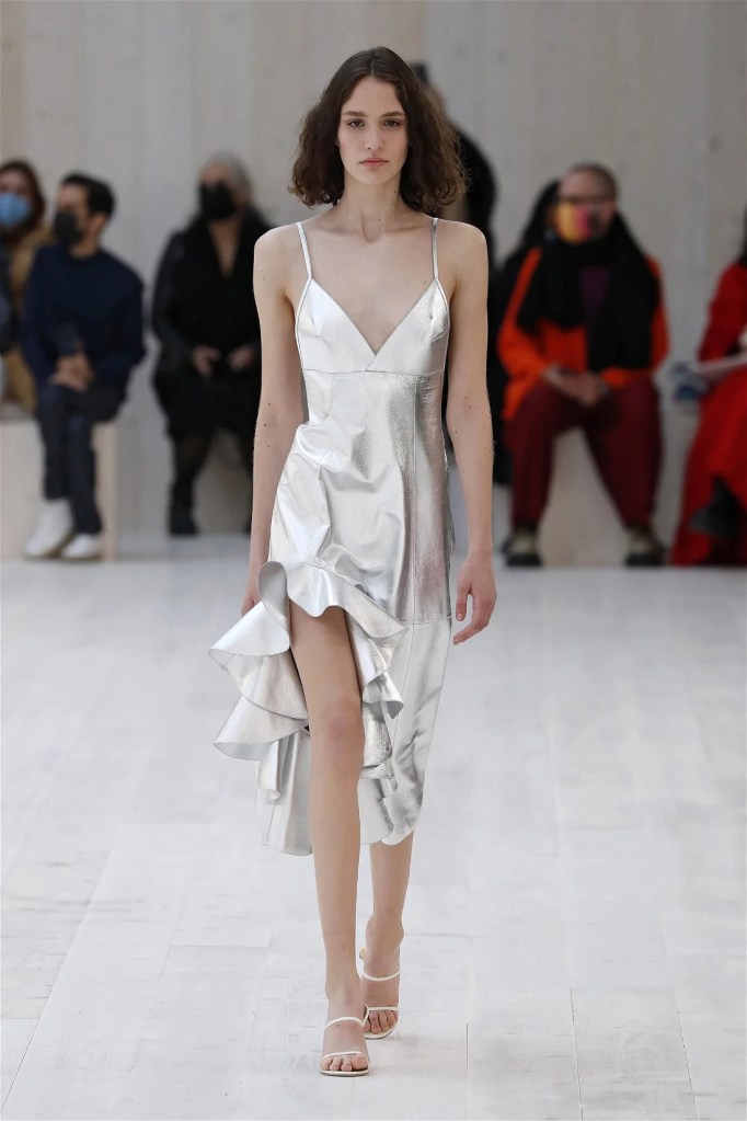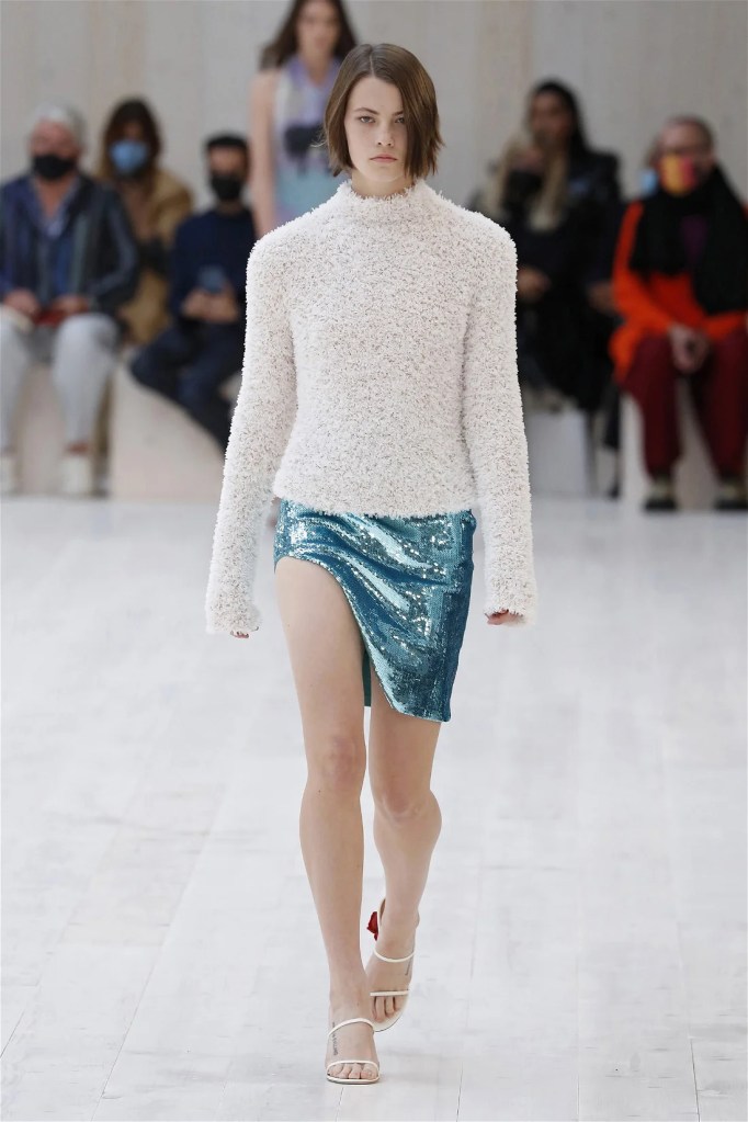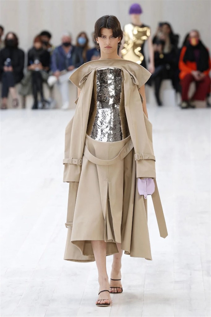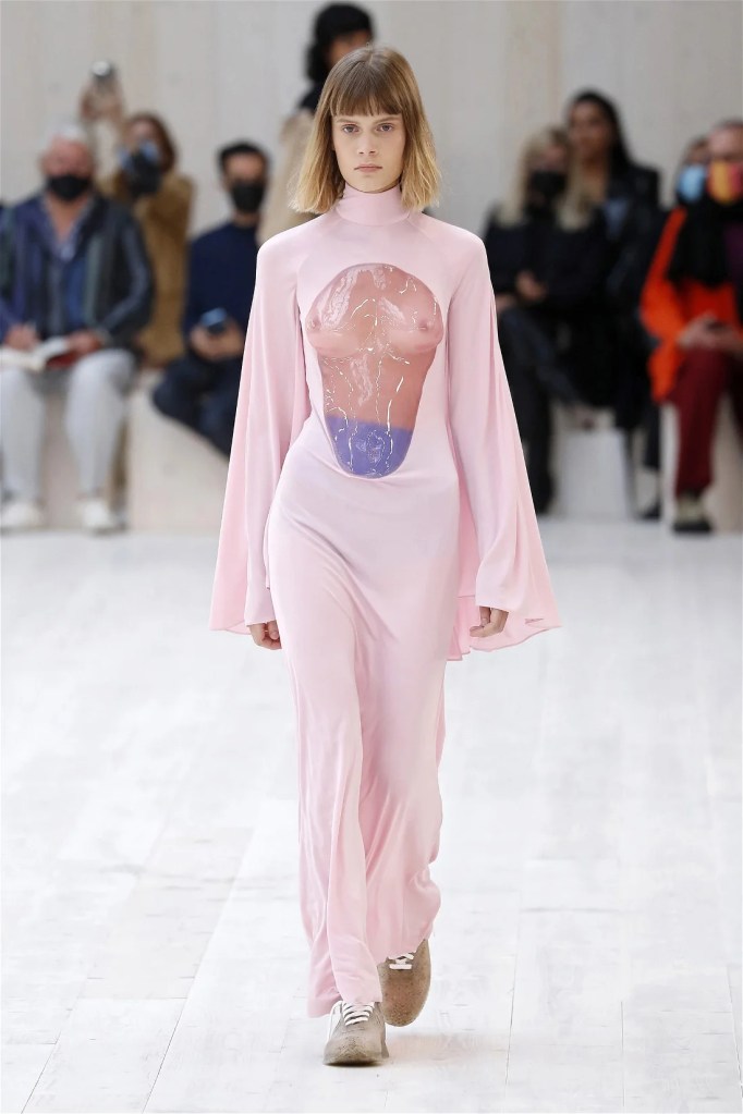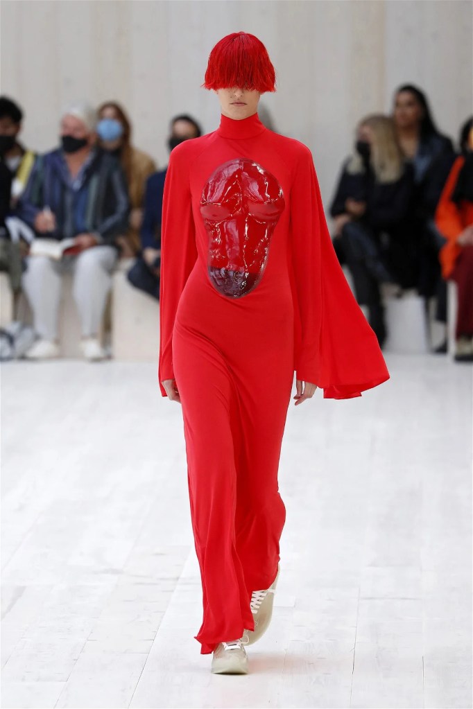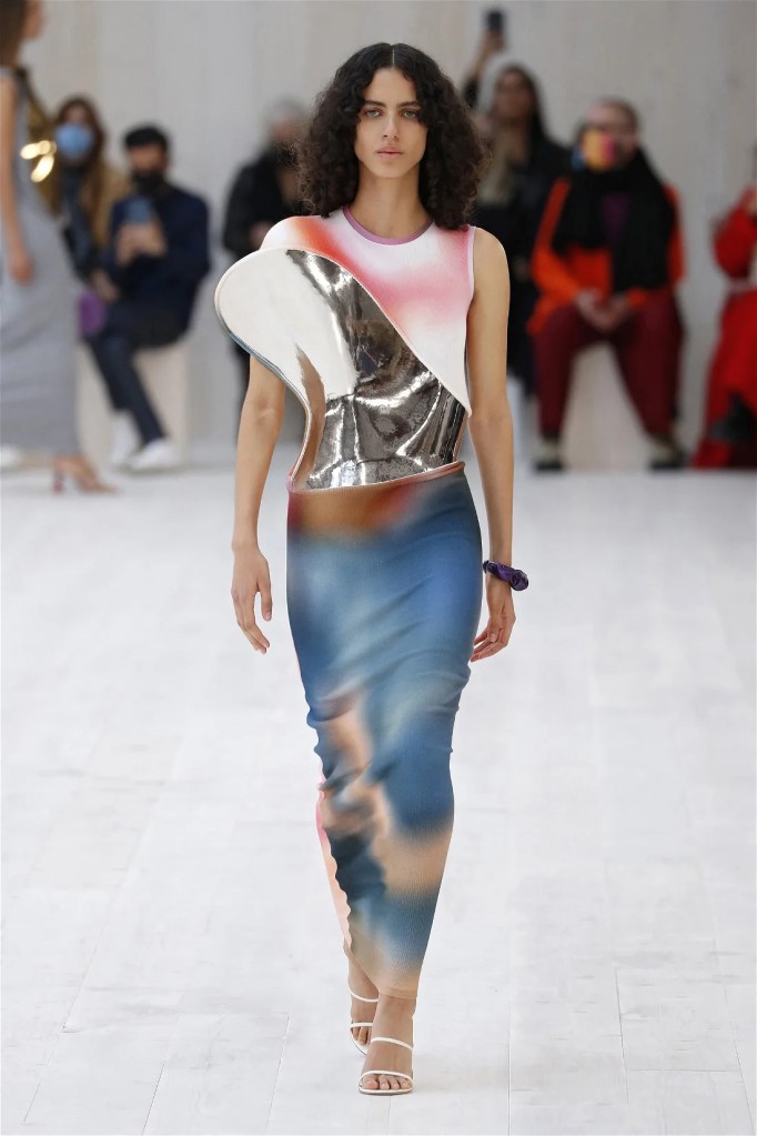 Well, Jonathan Anderson’s mind is fascinating, it is truly a godly experience for the eyes, brain and heart. Drenched in surrealism, irony, escapism, experimentation and as the brand called it “neurotic, psychedelic, completely hysterical.” The collection was all that and much more. The collection had so many highlights it’s hard to keep track of; trench coats worn backwards, dresses with sculptural shimmery metallic breastplates, denim dresses some reconstructed as backward dresses, sequined slit dresses with leg holes, dresses draped to perfection, Turtle-neck sheath maxis with clear resin breastplates.