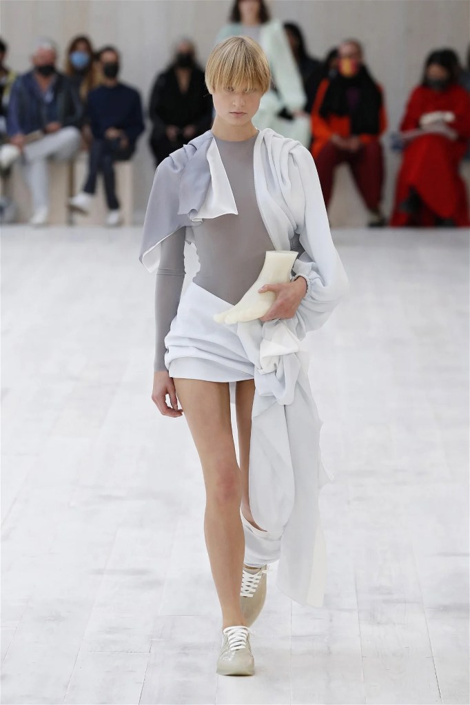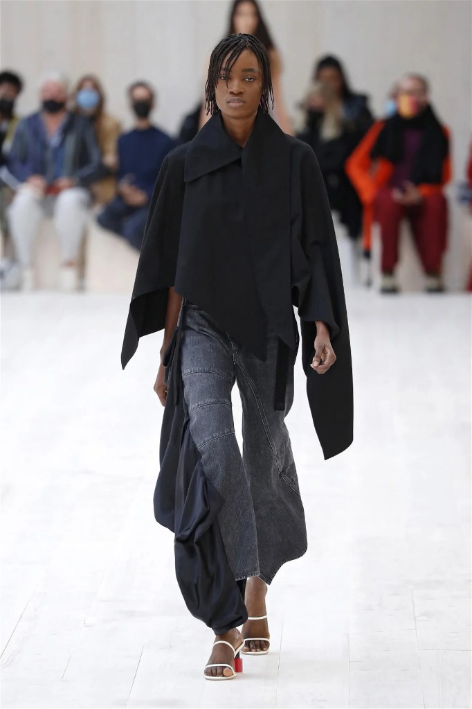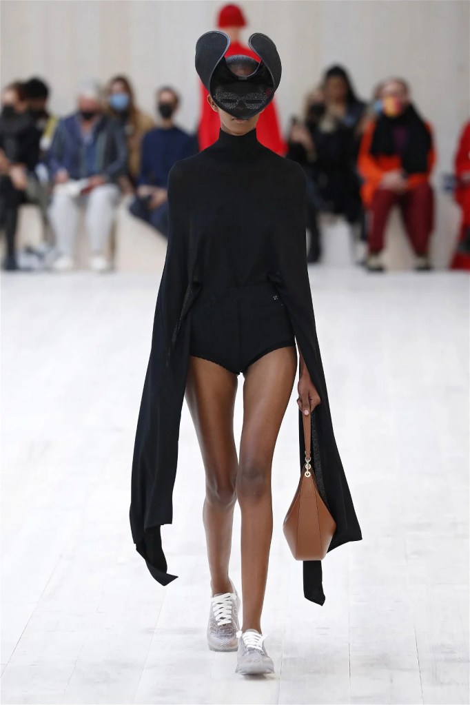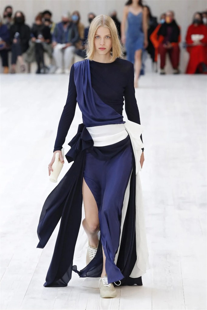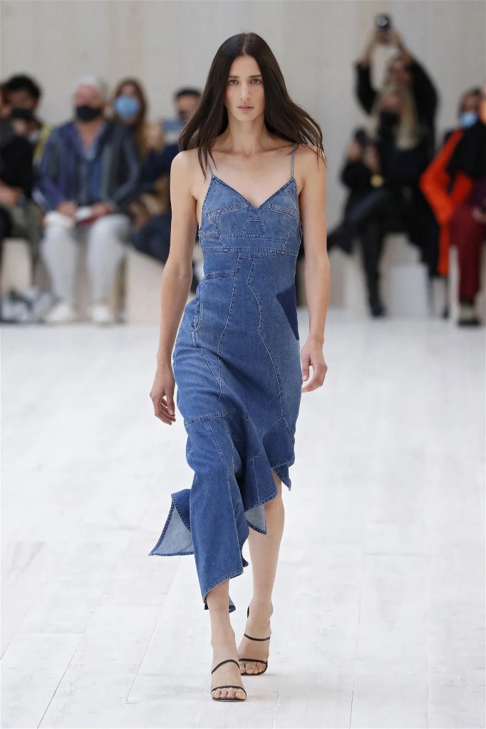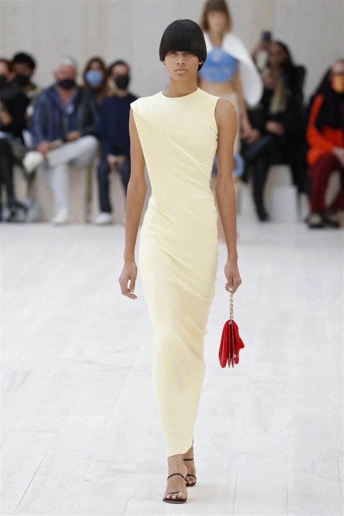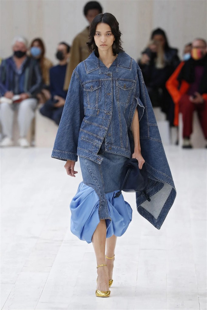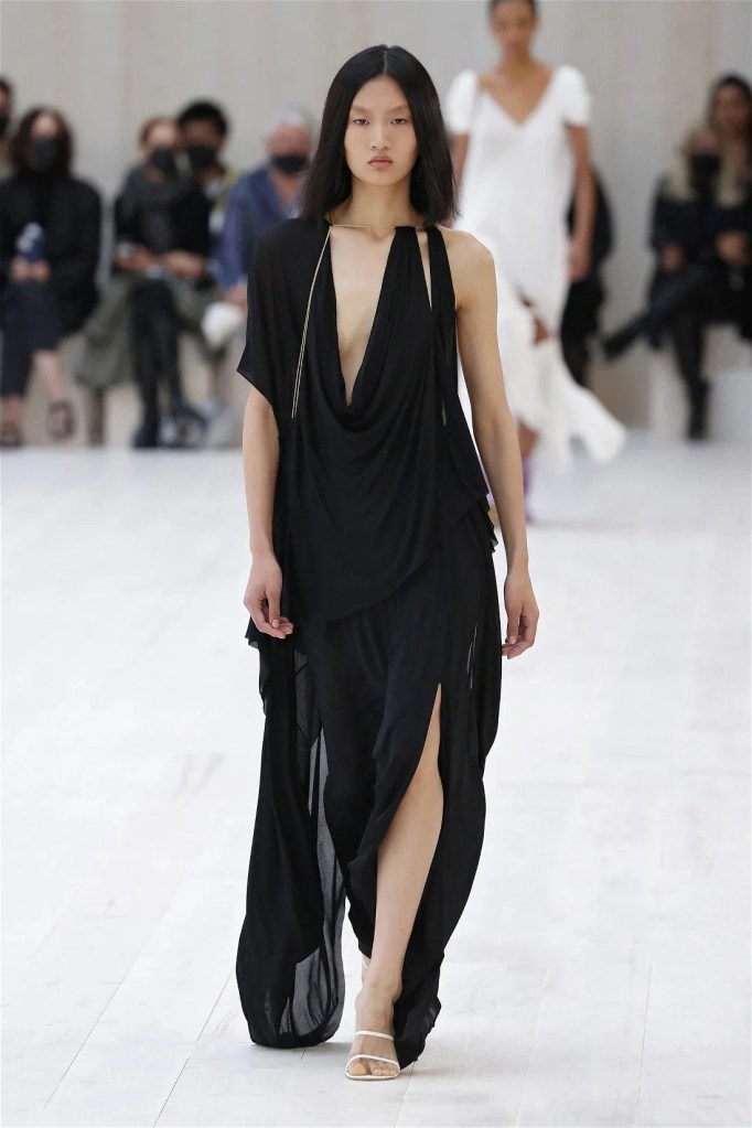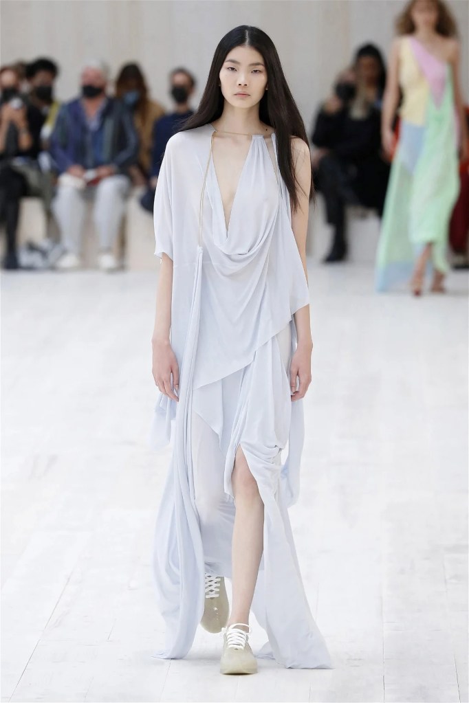 Well, Jonathan Anderson’s mind is fascinating, it is truly a godly experience for the eyes, brain and heart. Drenched in surrealism, irony, escapism, experimentation and as the brand called it “neurotic, psychedelic, completely hysterical.” The collection was all that and much more. The collection had so many highlights it’s hard to keep track of; trench coats worn backwards, dresses with sculptural shimmery metallic breastplates, denim dresses some reconstructed as backward dresses, sequined slit dresses with leg holes, dresses draped to perfection, Turtle-neck sheath maxis with clear resin breastplates.