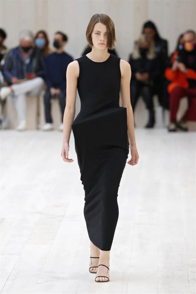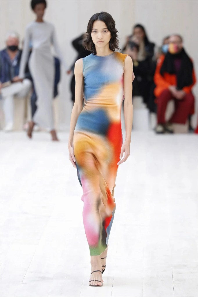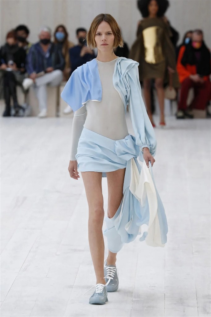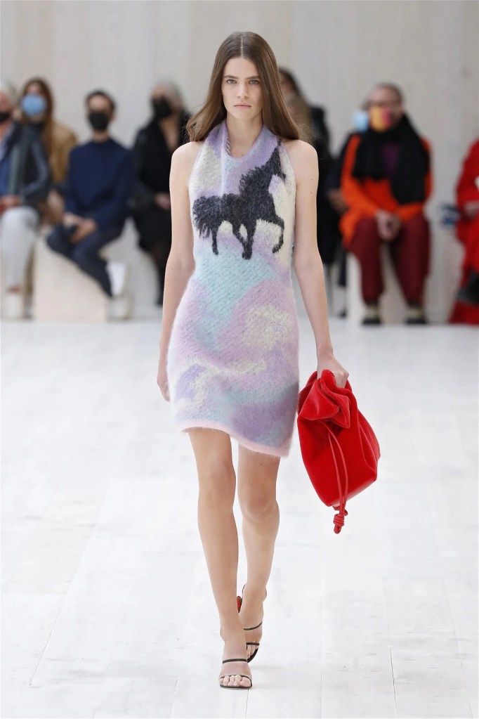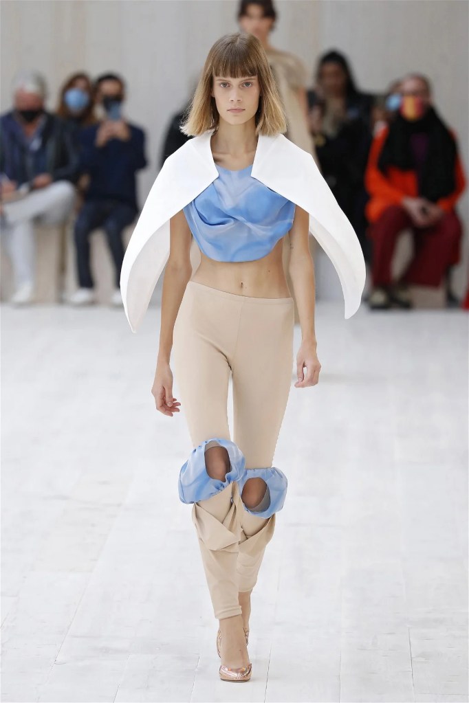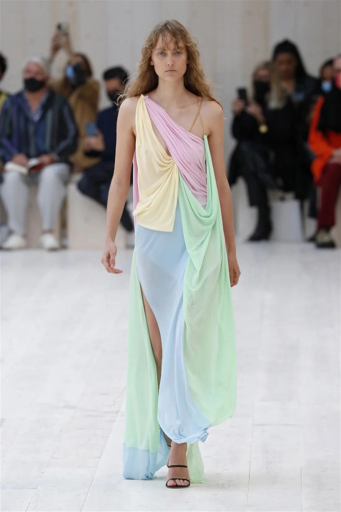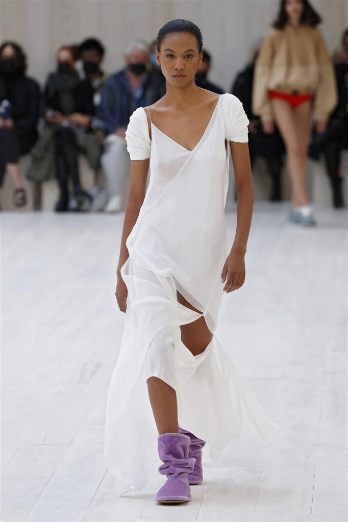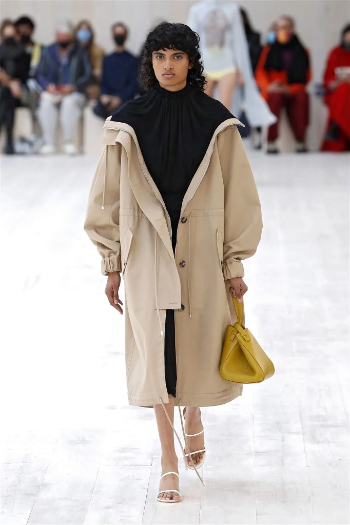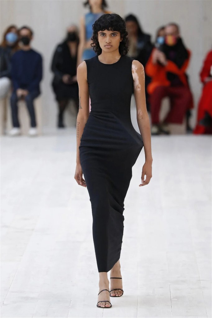 Well, Jonathan Anderson’s mind is fascinating, it is truly a godly experience for the eyes, brain and heart. Drenched in surrealism, irony, escapism, experimentation and as the brand called it “neurotic, psychedelic, completely hysterical.” The collection was all that and much more. The collection had so many highlights it’s hard to keep track of; trench coats worn backwards, dresses with sculptural shimmery metallic breastplates, denim dresses some reconstructed as backward dresses, sequined slit dresses with leg holes, dresses draped to perfection, Turtle-neck sheath maxis with clear resin breastplates.