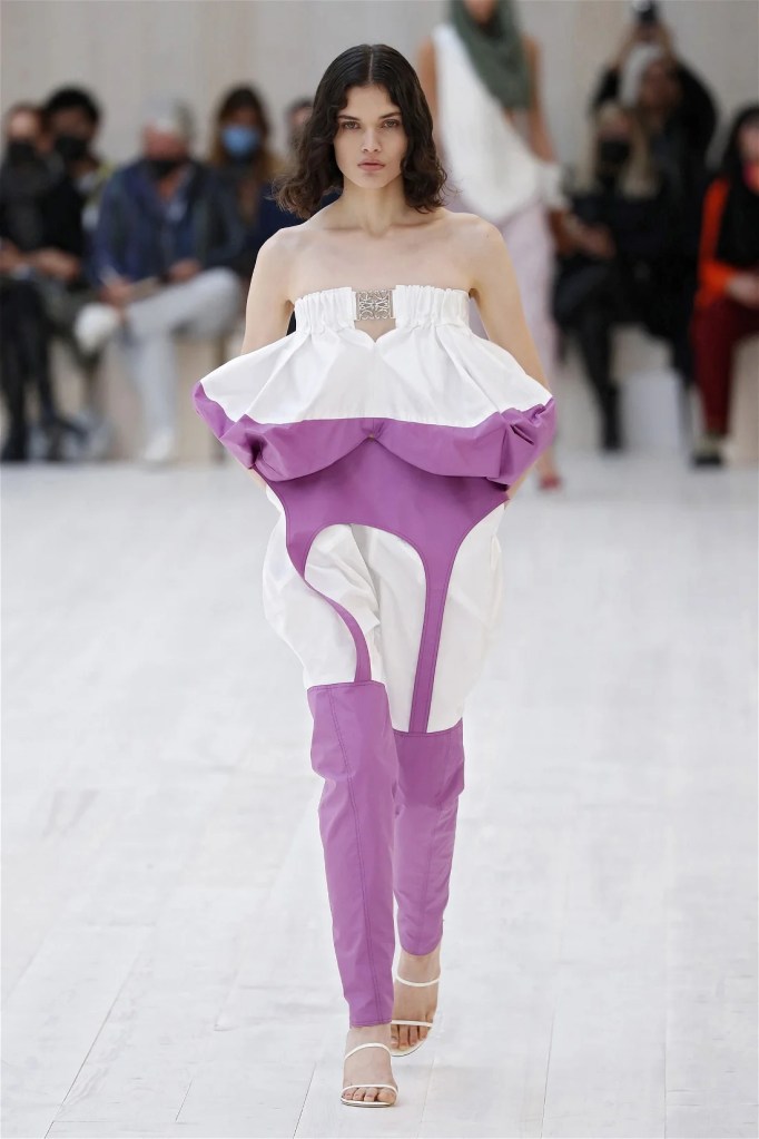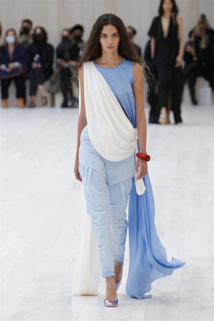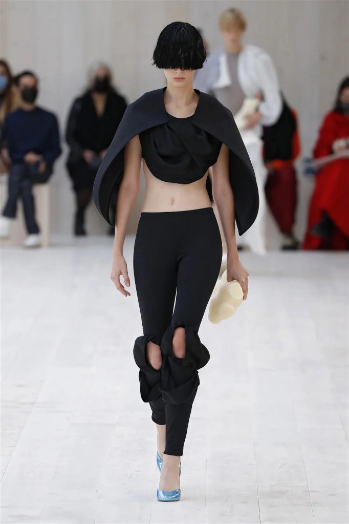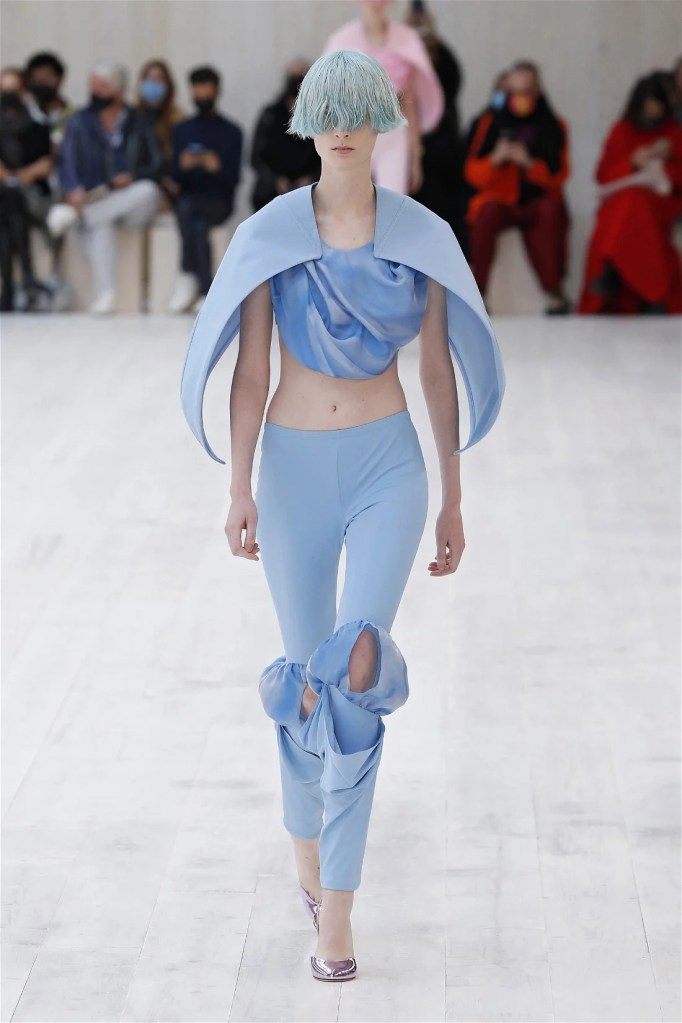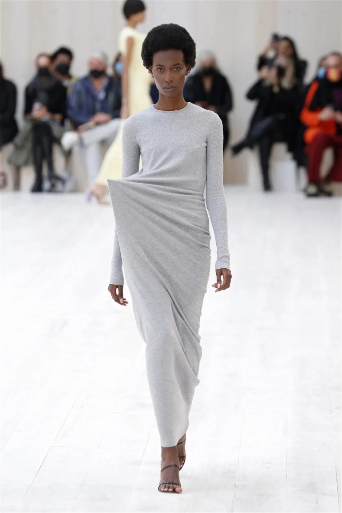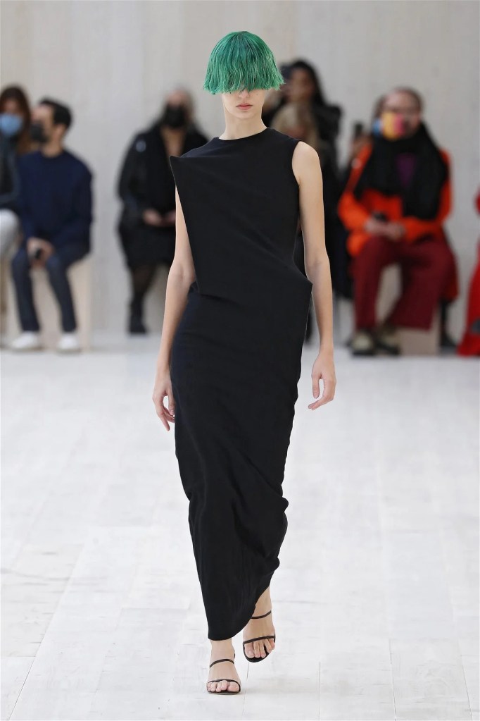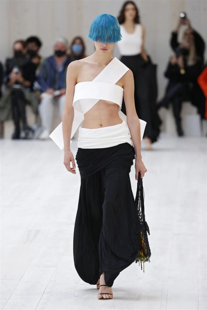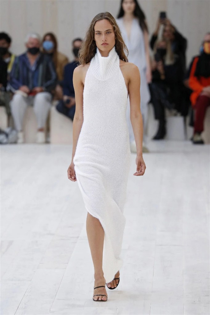Well, Jonathan Anderson’s mind is fascinating, it is truly a godly experience for the eyes, brain and heart. Drenched in surrealism, irony, escapism, experimentation and as the brand called it “neurotic, psychedelic, completely hysterical.” The collection was all that and much more. The collection had so many highlights it’s hard to keep track of; trench coats worn backwards, dresses with sculptural shimmery metallic breastplates, denim dresses some reconstructed as backward dresses, sequined slit dresses with leg holes, dresses draped to perfection, Turtle-neck sheath maxis with clear resin breastplates.