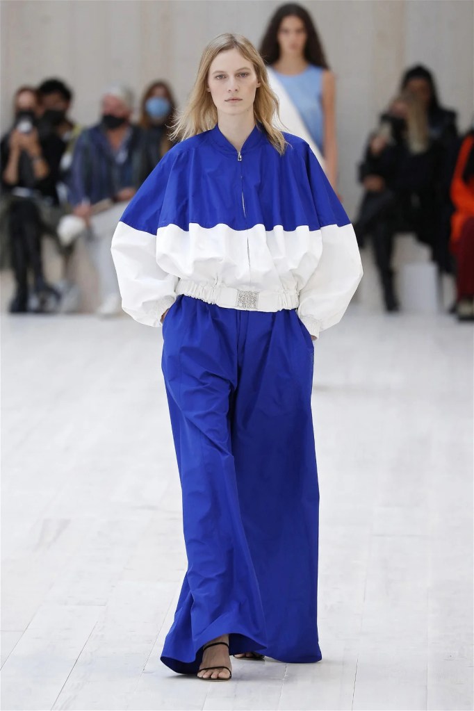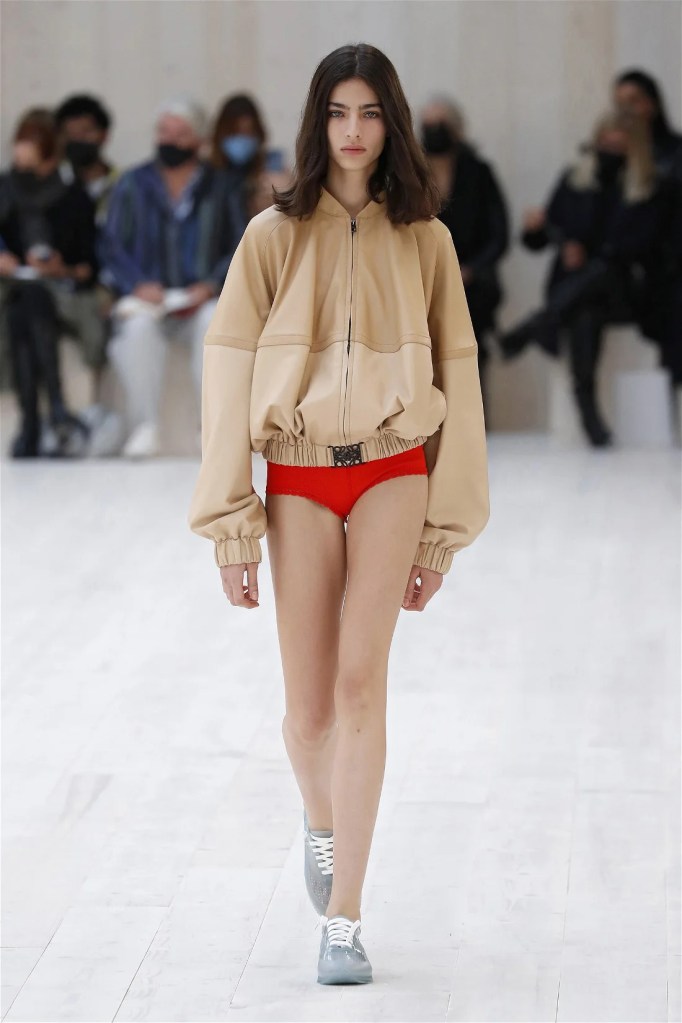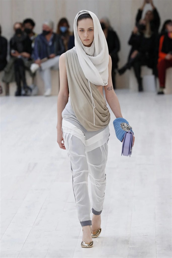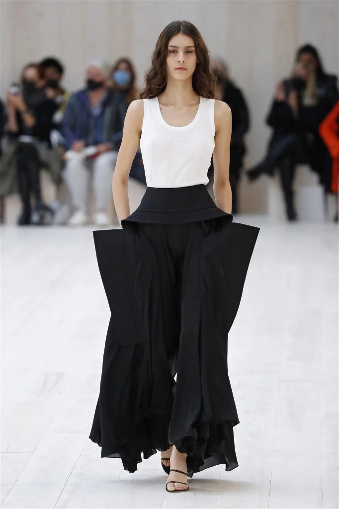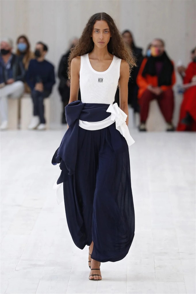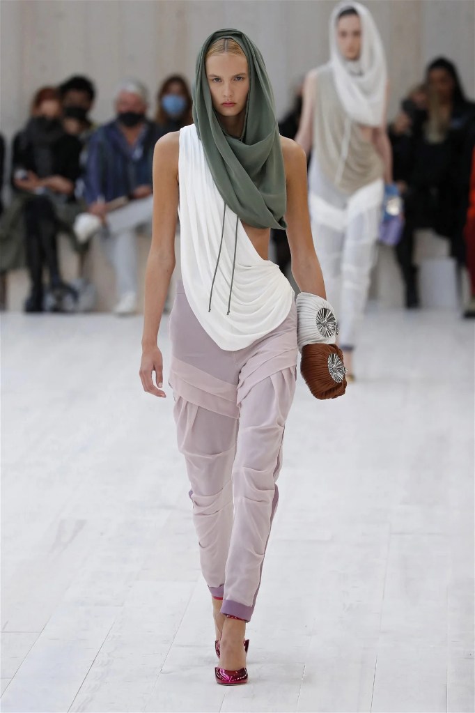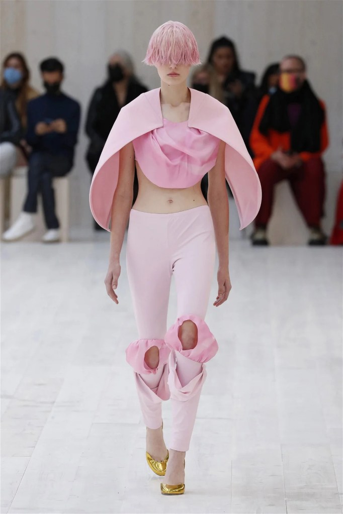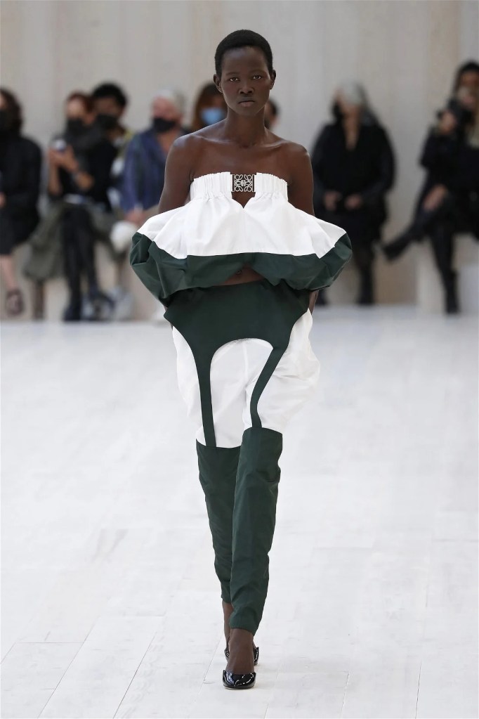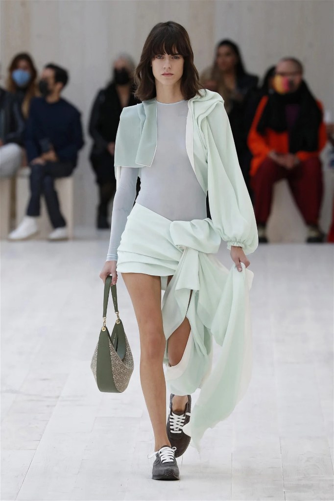 Well, Jonathan Anderson’s mind is fascinating, it is truly a godly experience for the eyes, brain and heart. Drenched in surrealism, irony, escapism, experimentation and as the brand called it “neurotic, psychedelic, completely hysterical.” The collection was all that and much more. The collection had so many highlights it’s hard to keep track of; trench coats worn backwards, dresses with sculptural shimmery metallic breastplates, denim dresses some reconstructed as backward dresses, sequined slit dresses with leg holes, dresses draped to perfection, Turtle-neck sheath maxis with clear resin breastplates.