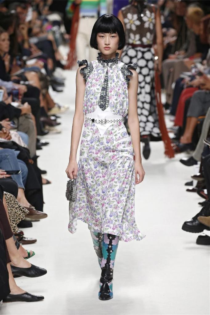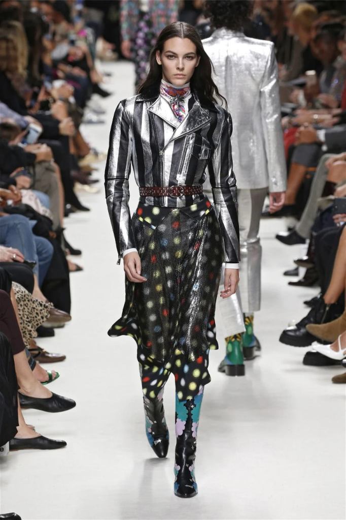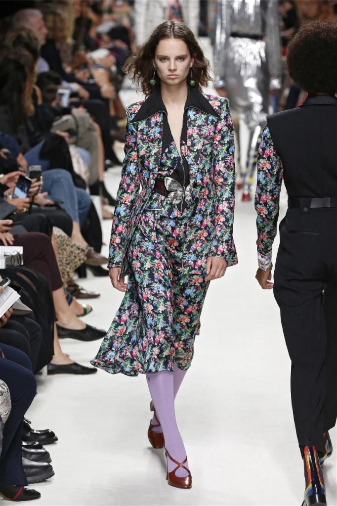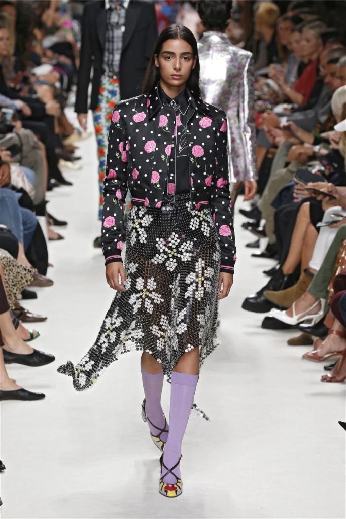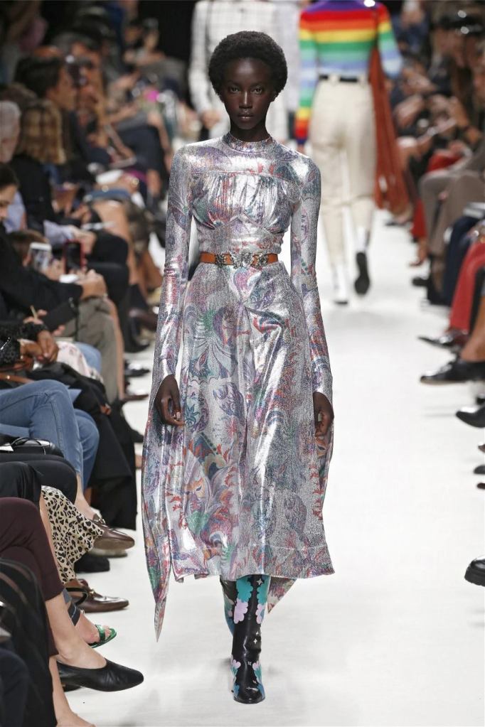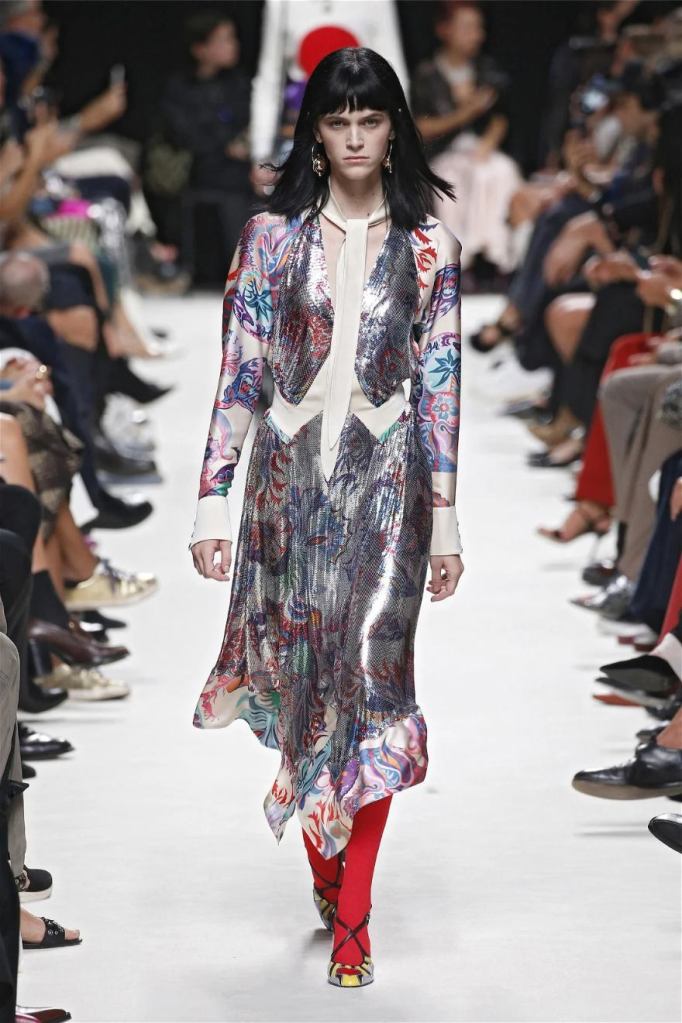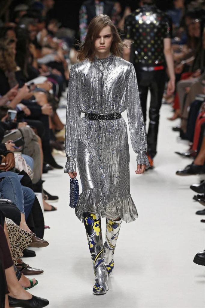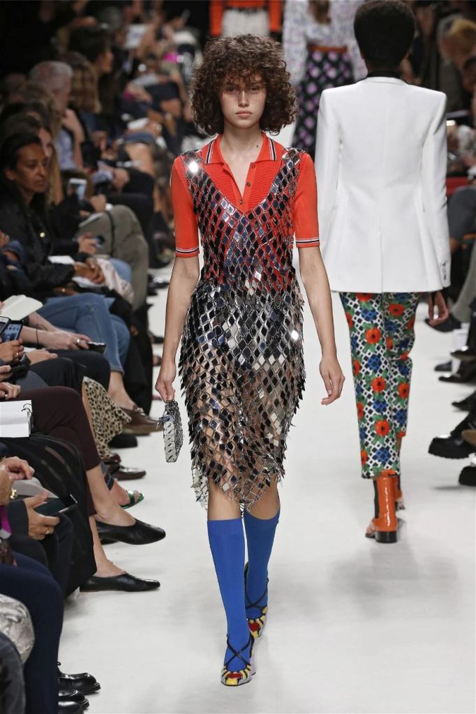 This collection takes a vibrant leap back in time, drawing inspiration from the 1960s and 1970s. The runway was awash in a kaleidoscope of color and texture, infused with a carefree spirit. Prints explode in a psychedelic symphony, dominating garments in swirling florals, geometric patterns, and funky graphic motifs. Chainmail, a signature Rabanne element, adds a touch of edgy opulence.