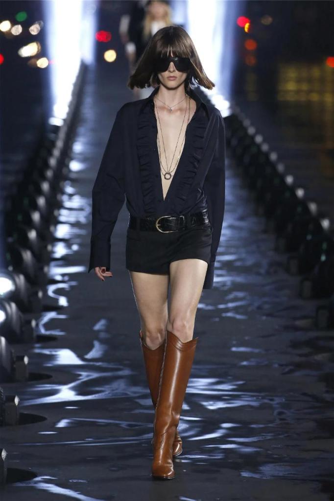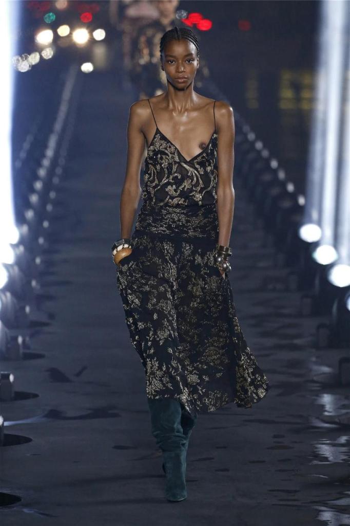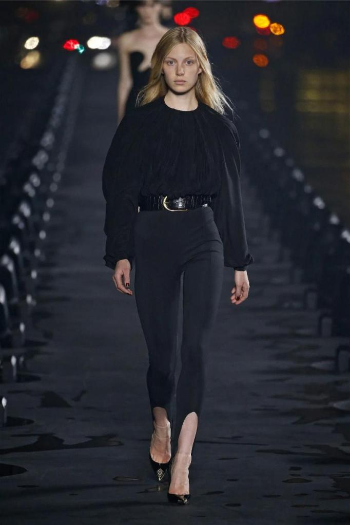 This cillection danced into a 70s disco dream, channeling a contemporary take on the label’s most iconic motifs. The energy on the runway mirrored the clothes – high-octane and unapologetically glamorous. The garments showcased feather-light dresses, flowing chiffon blouses, peasant smocks, pleated skirts, off-the-shoulder necklines, and billowing pants in chic boot looks. Gender fluidity took center stage, with classic tailoring subverted into a playful mix of masculine and feminine. While the inspiration was vintage, the execution felt fresh and relevant, proving Saint Laurent’s mastery of reinterpreting the past for the present.