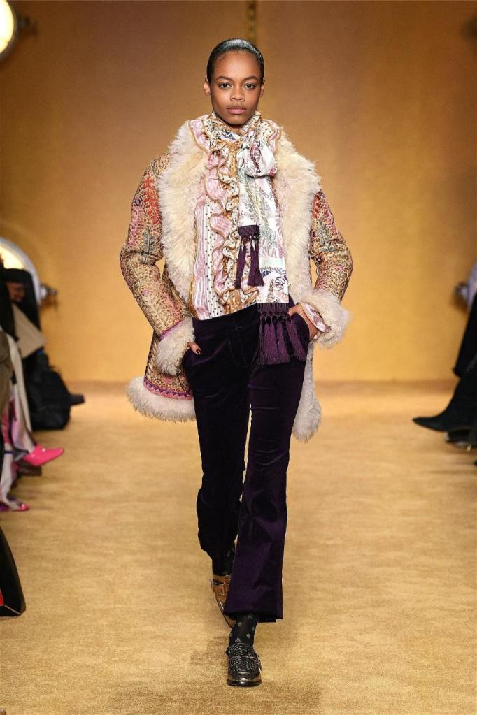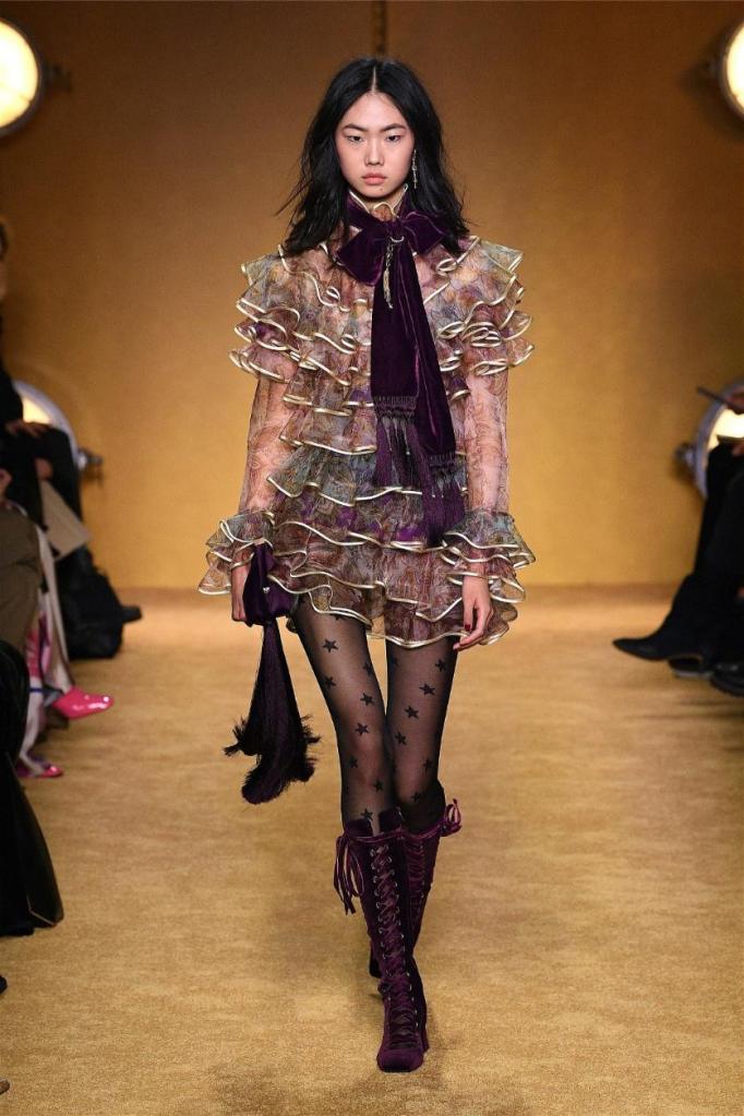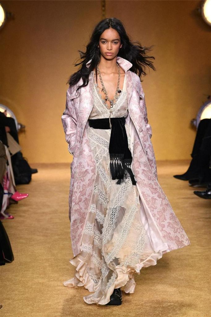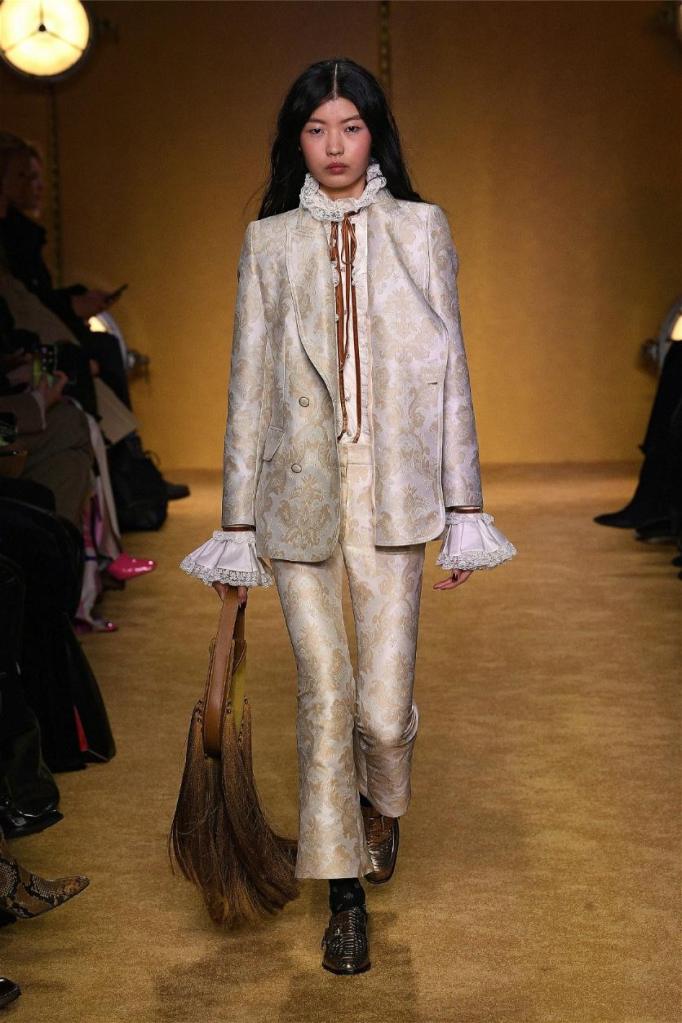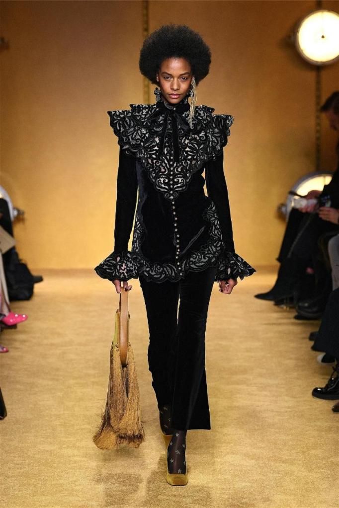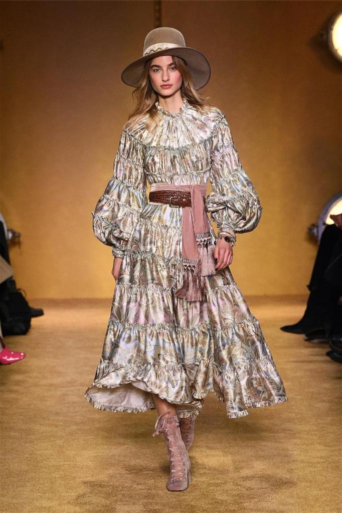 ‘Lady Beetle’ seamlessly weaves together elements of superstition, fortune telling, and lucky charms into gorgeous clothes. Bold 70s disco vibes pulsate through romantic prints, tiered layers cascading with playful ruffles. Vibrant hues and eye-catching patterns, from graffiti-ed pronouncements of “magic” and “clairvoyant” to swirling florals, imbue a playful spirit. The juxtaposition of playful textures, ranging from soft to hard, adds depth and intrigue.