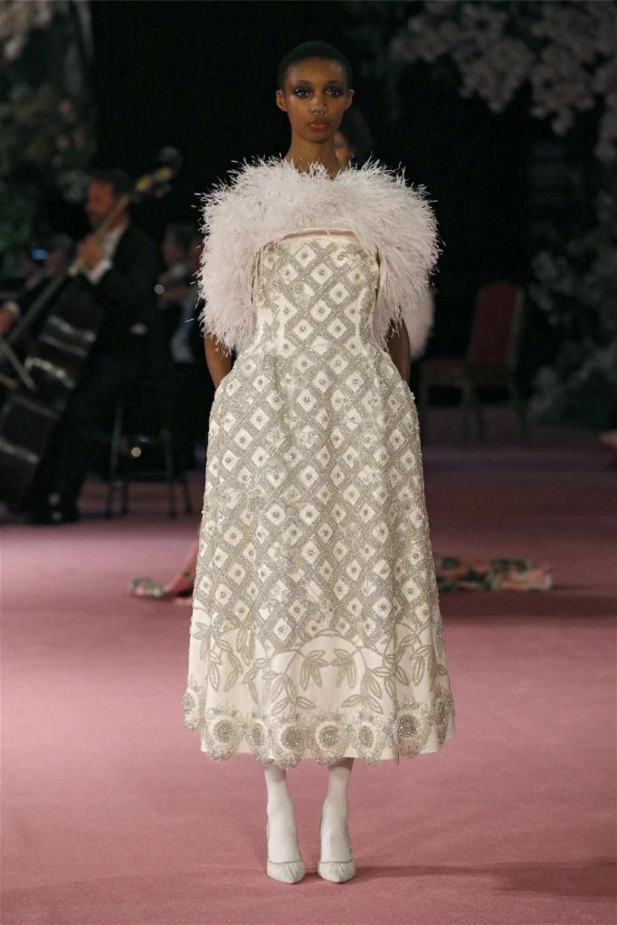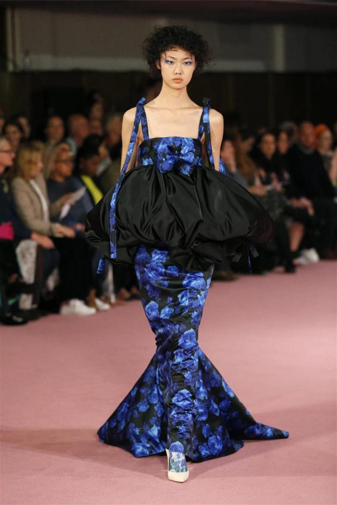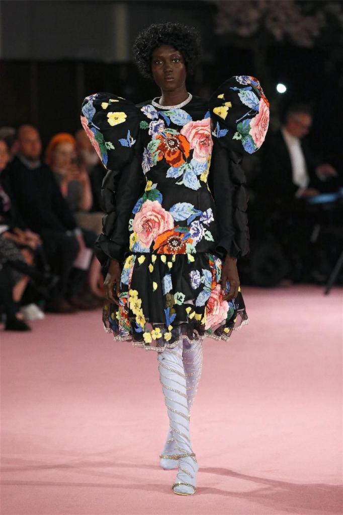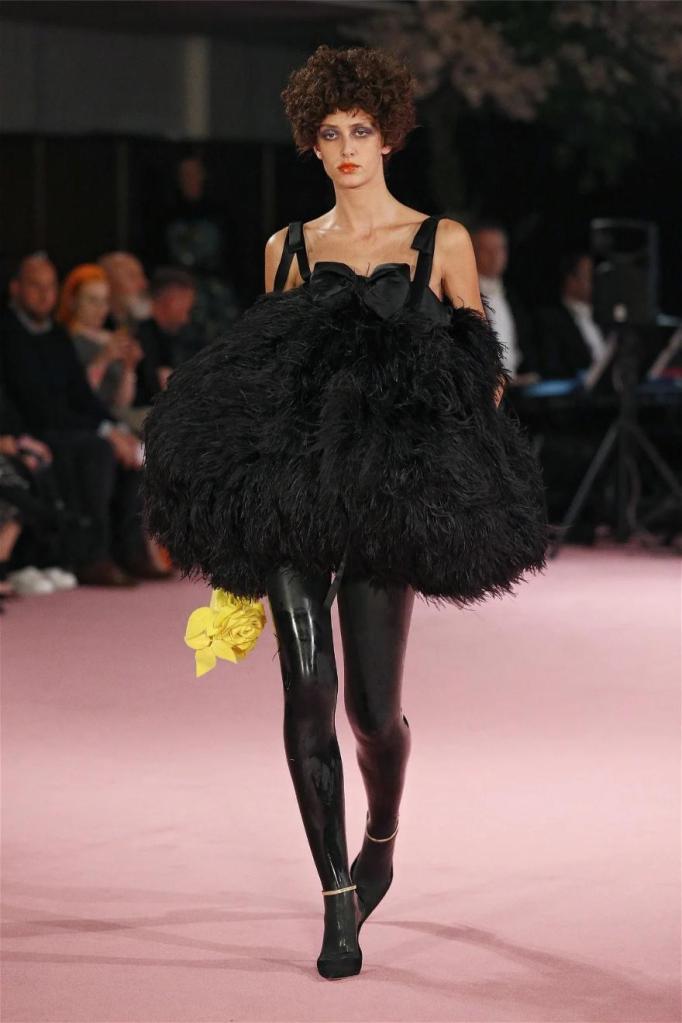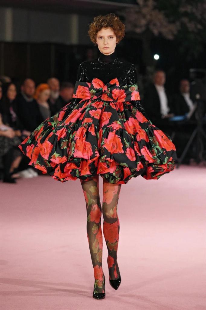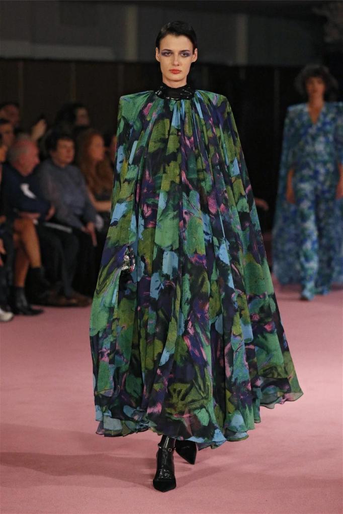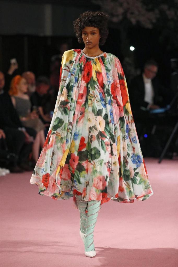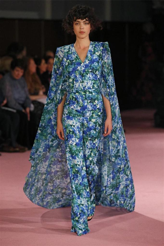 This was maximalism on high, a riot of colour and texture that dared you not to be dazzled. It was a technicolour escape. Inspired by Hockney’s sun-drenched landscapes and Fellini’s whimsical dreams, Quinn spun a world of oversized florals, jewel-toned silks, and feather-fringed grandeur. Gowns ballooned like clouds, dresses bloomed with vibrant life, and sequins glistened hard. Think sweeping capes, ballroom skirts, and bodices cinched to accentuate an air of aristocratic hauteur.