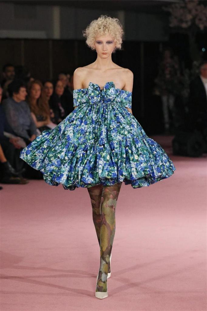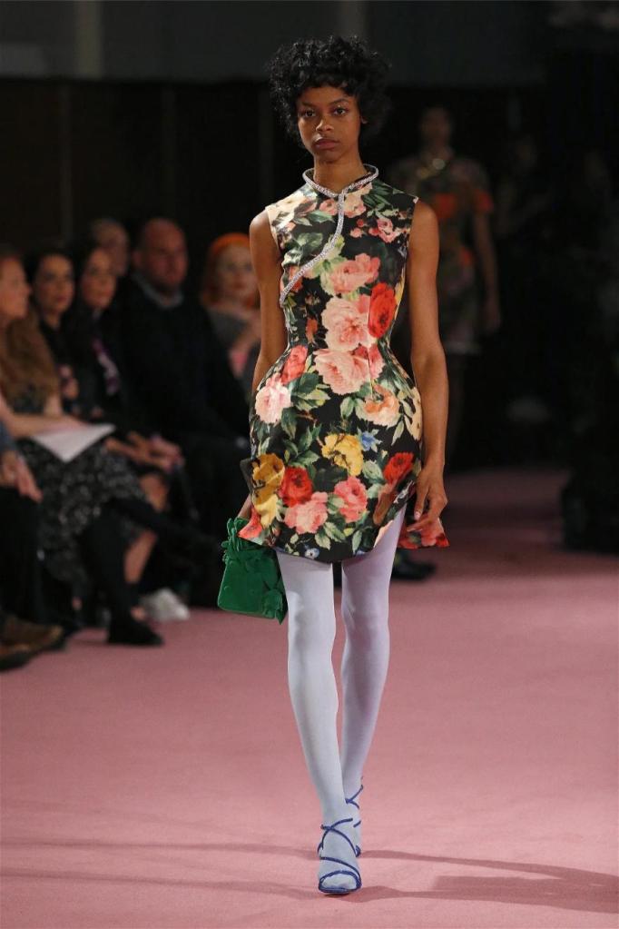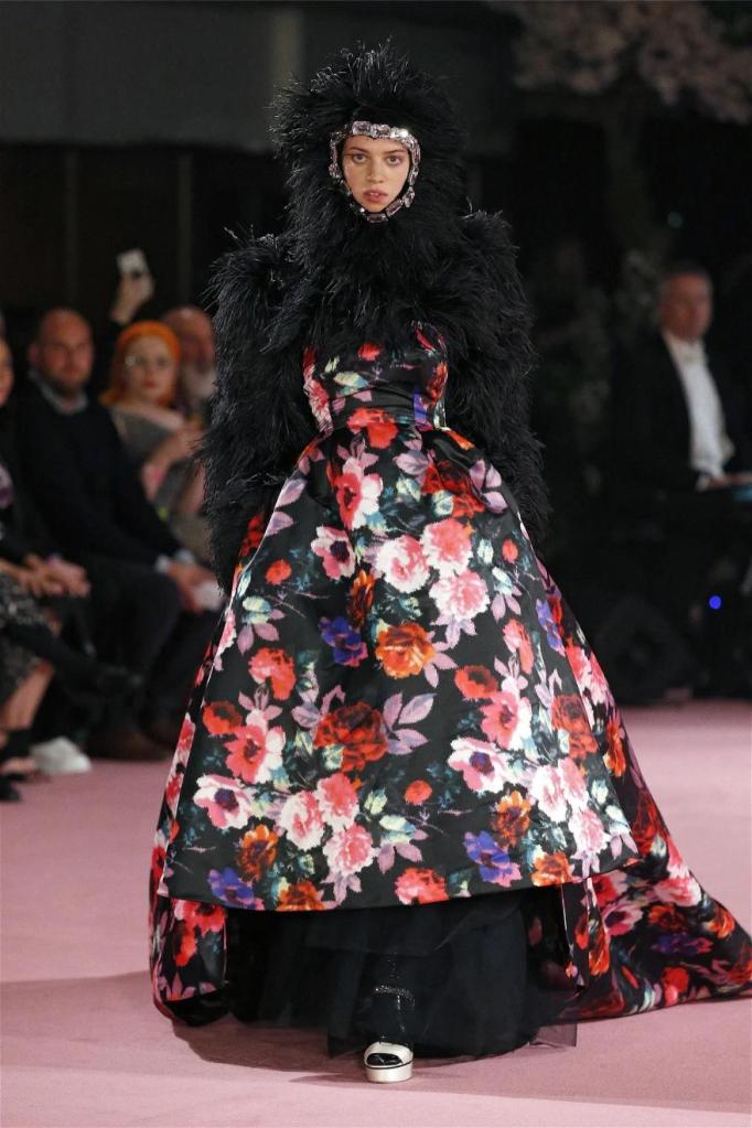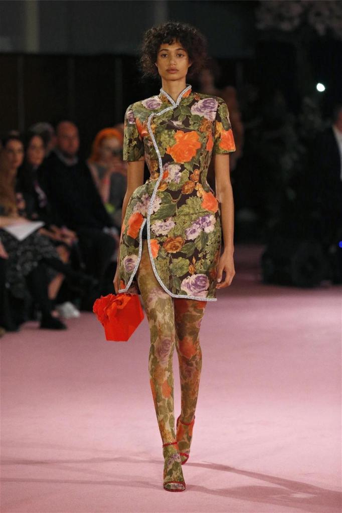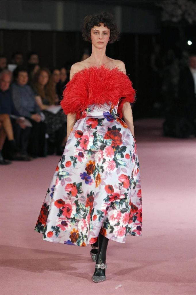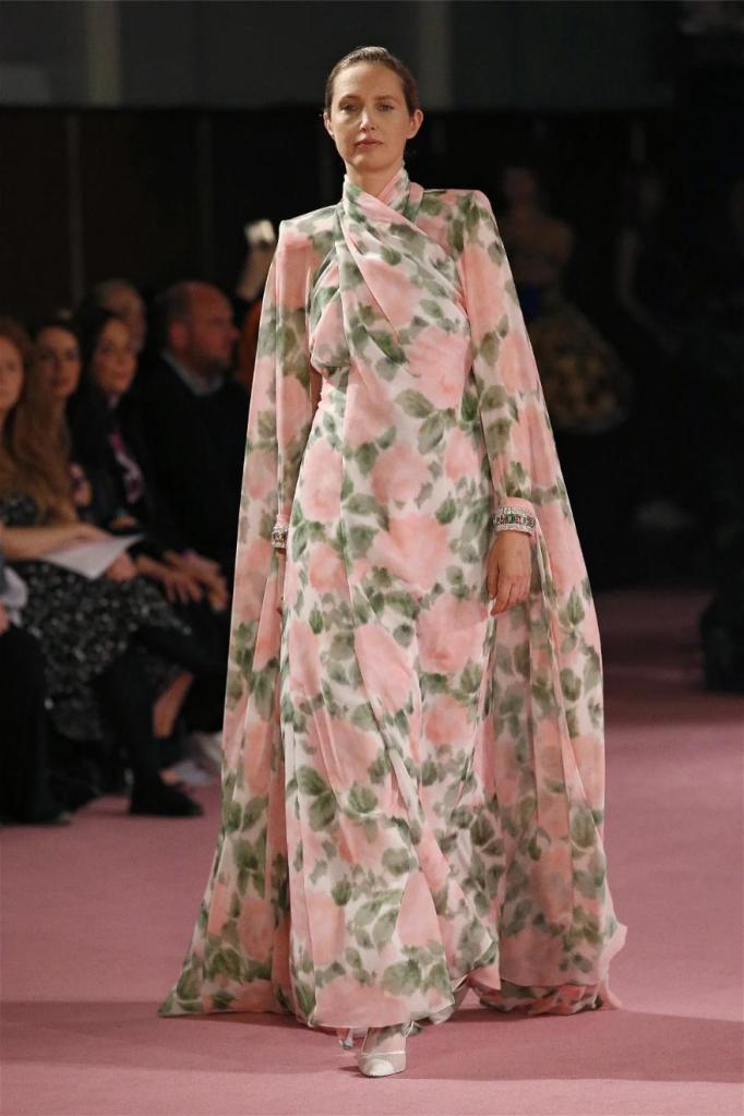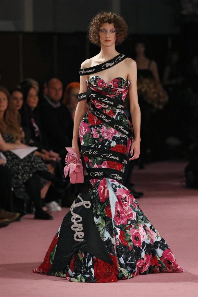 This was maximalism on high, a riot of colour and texture that dared you not to be dazzled. It was a technicolour escape. Inspired by Hockney’s sun-drenched landscapes and Fellini’s whimsical dreams, Quinn spun a world of oversized florals, jewel-toned silks, and feather-fringed grandeur. Gowns ballooned like clouds, dresses bloomed with vibrant life, and sequins glistened hard. Think sweeping capes, ballroom skirts, and bodices cinched to accentuate an air of aristocratic hauteur.