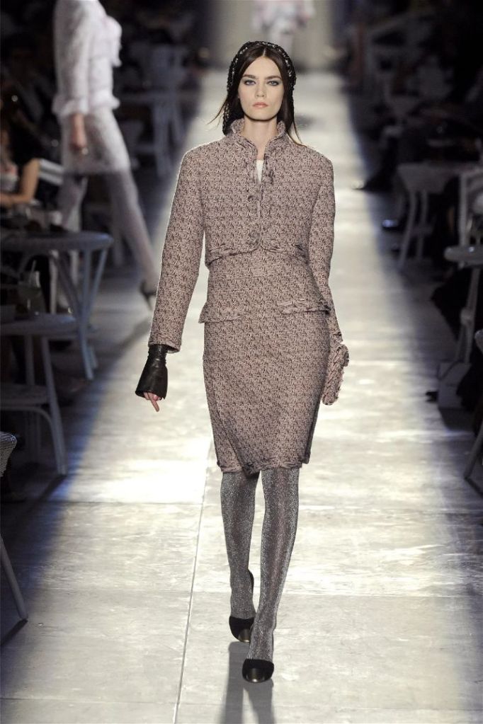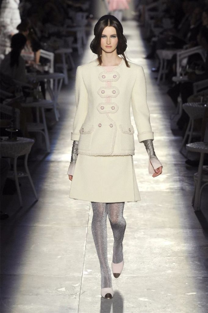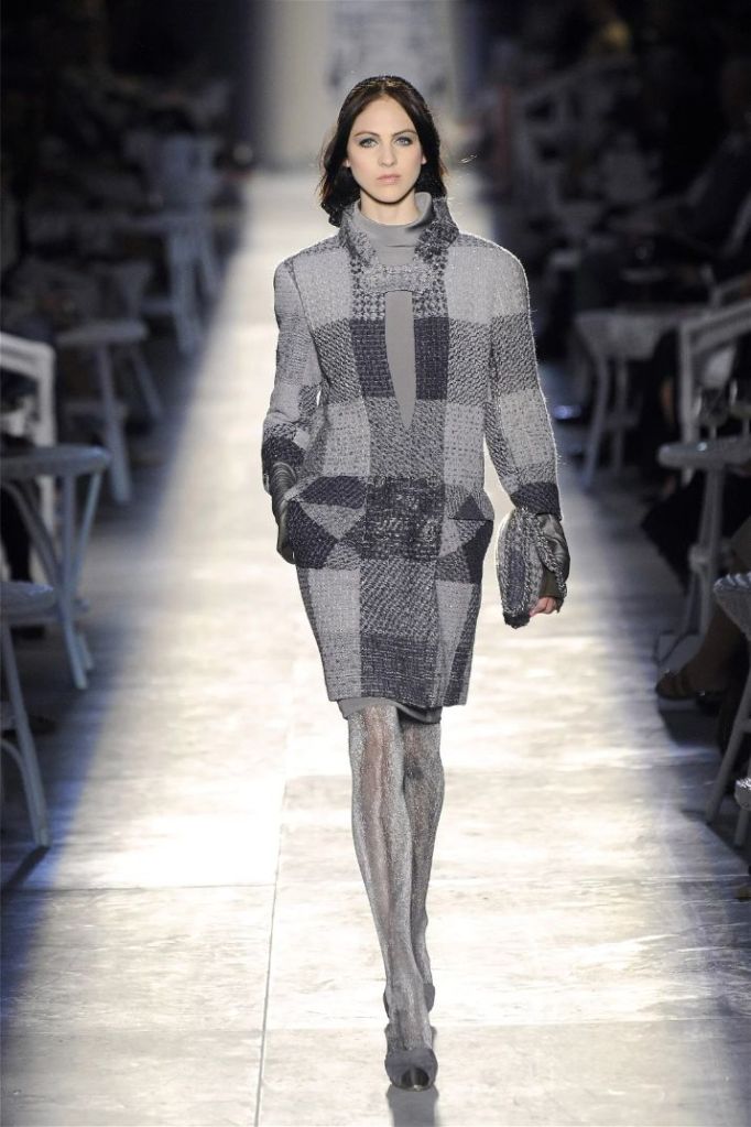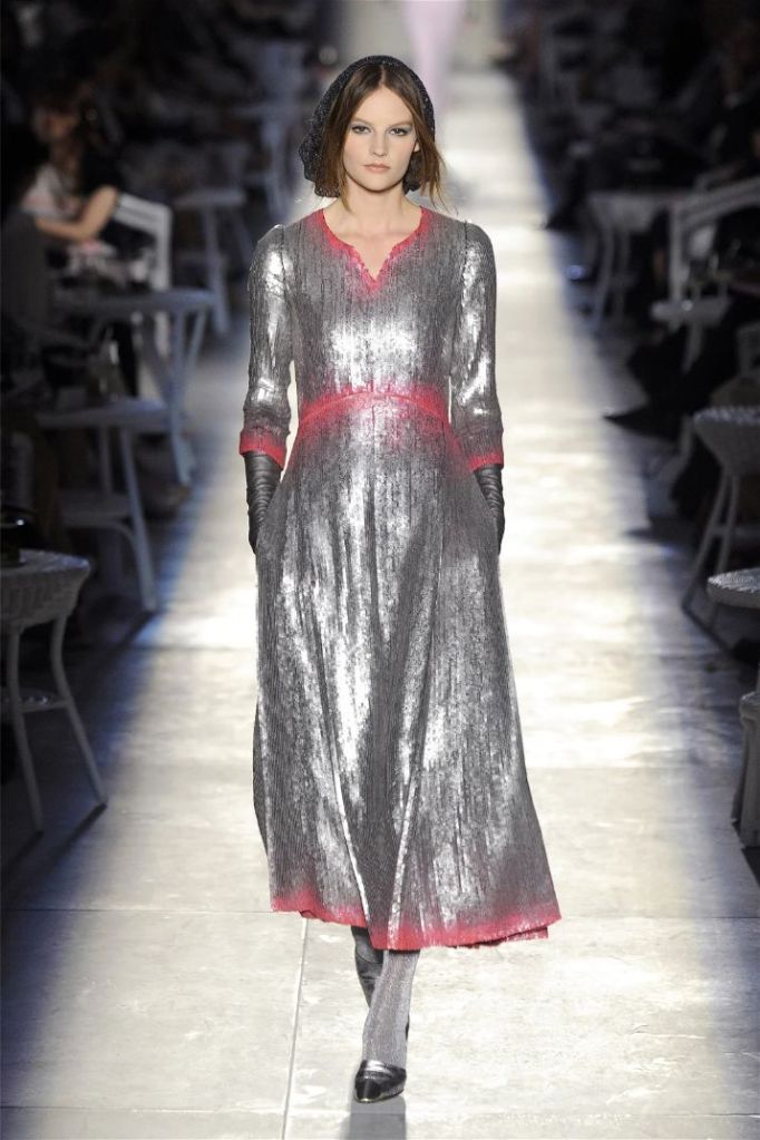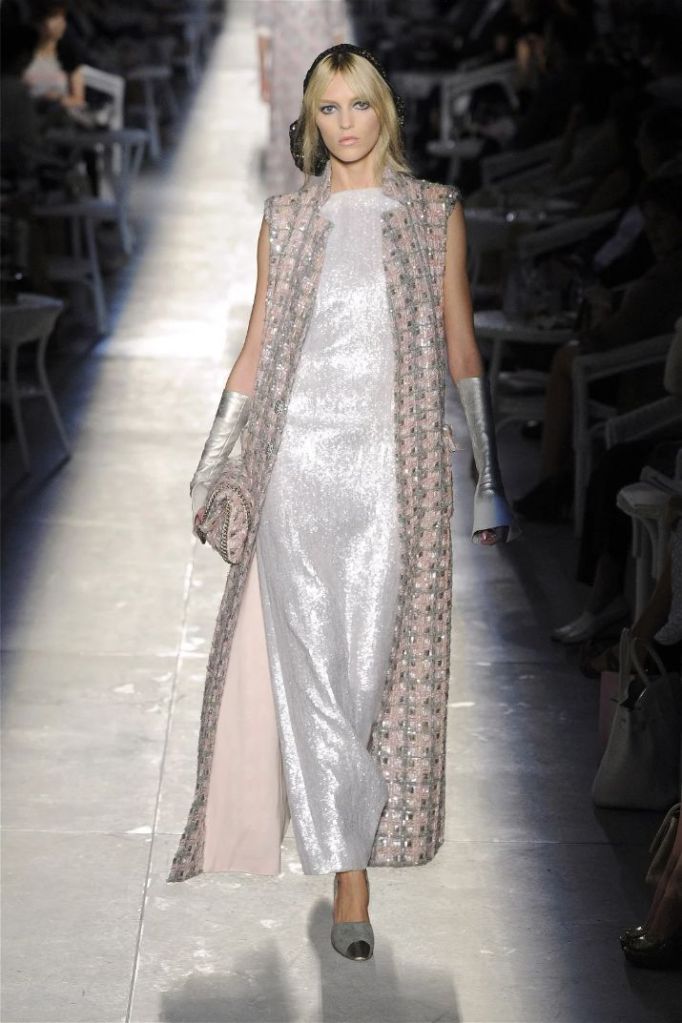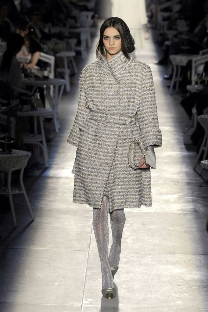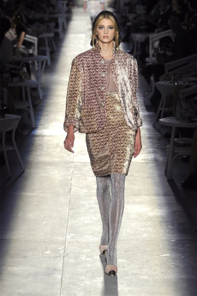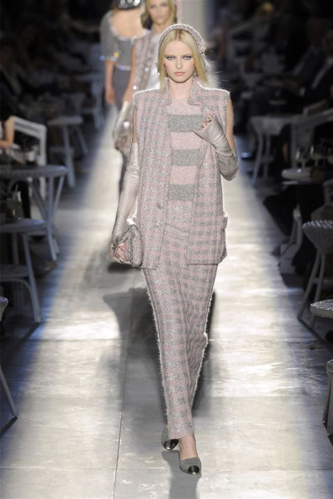 Lagerfeld introduces a sophisticated colour palette of soft grey, pastel pink, taupe, and ivory, capturing the essence of fall. Classic silhouettes are given a contemporary twist with metallic sleeves and belts, blending tradition with modernity seamlessly.